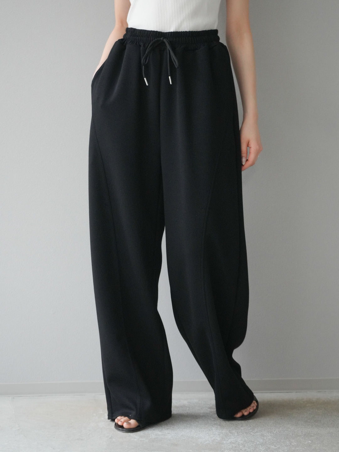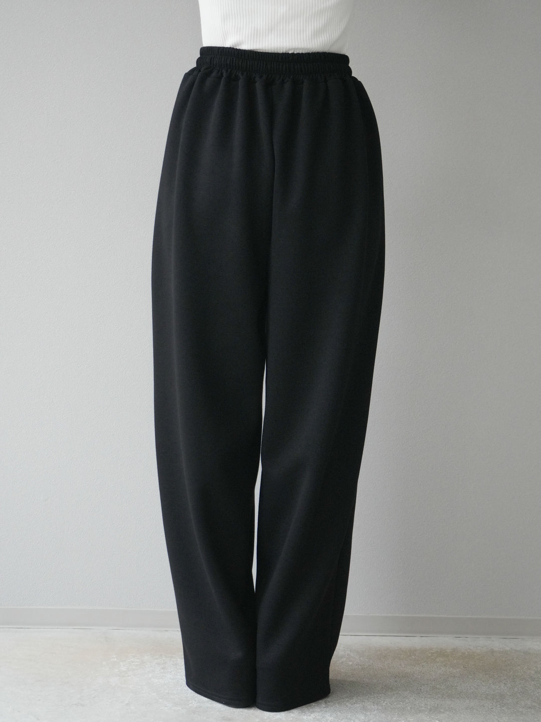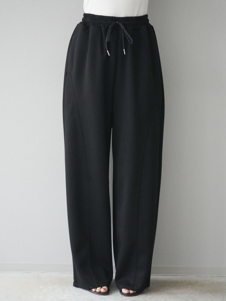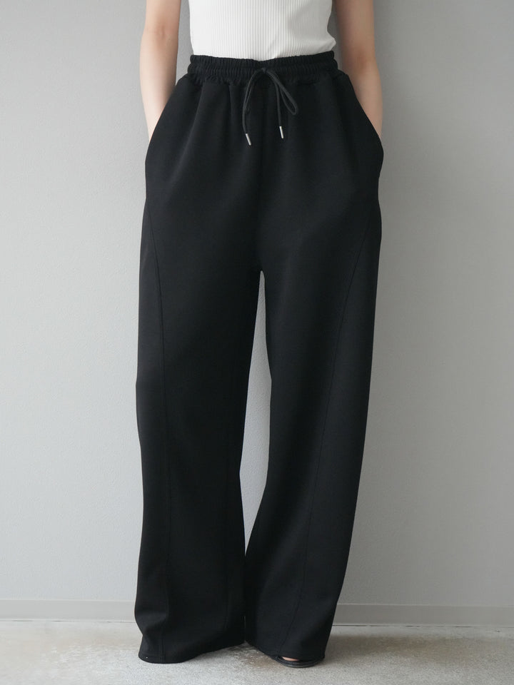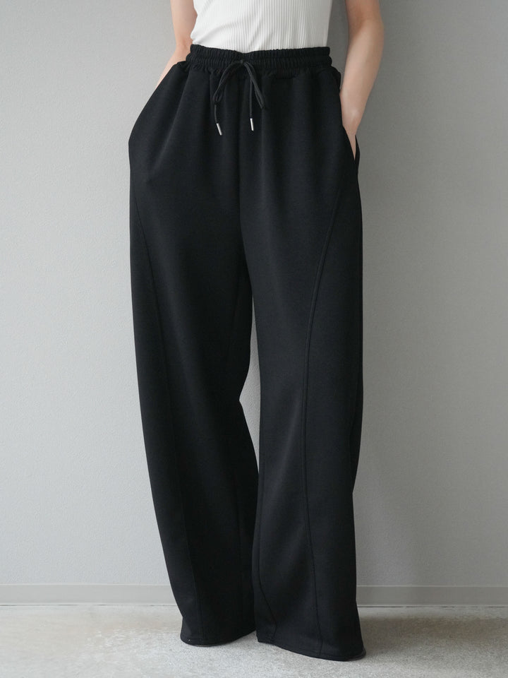 立体的なカーブラインが特徴のトレンドライクなワイドパンツ。柔らかくハリ感のあるポンチ素材で、美しいシルエットをキープしながら快適な穿き心地を実現。ウエストはゴム仕様でストレスフリー。シンプルながらひとクセ効いたデザインで、カジュアルにもきれいめにも着回せる万能アイテムです。 ※ボトムス、キャミソール(インナー)以外の商品は一律でインナーは付属していません