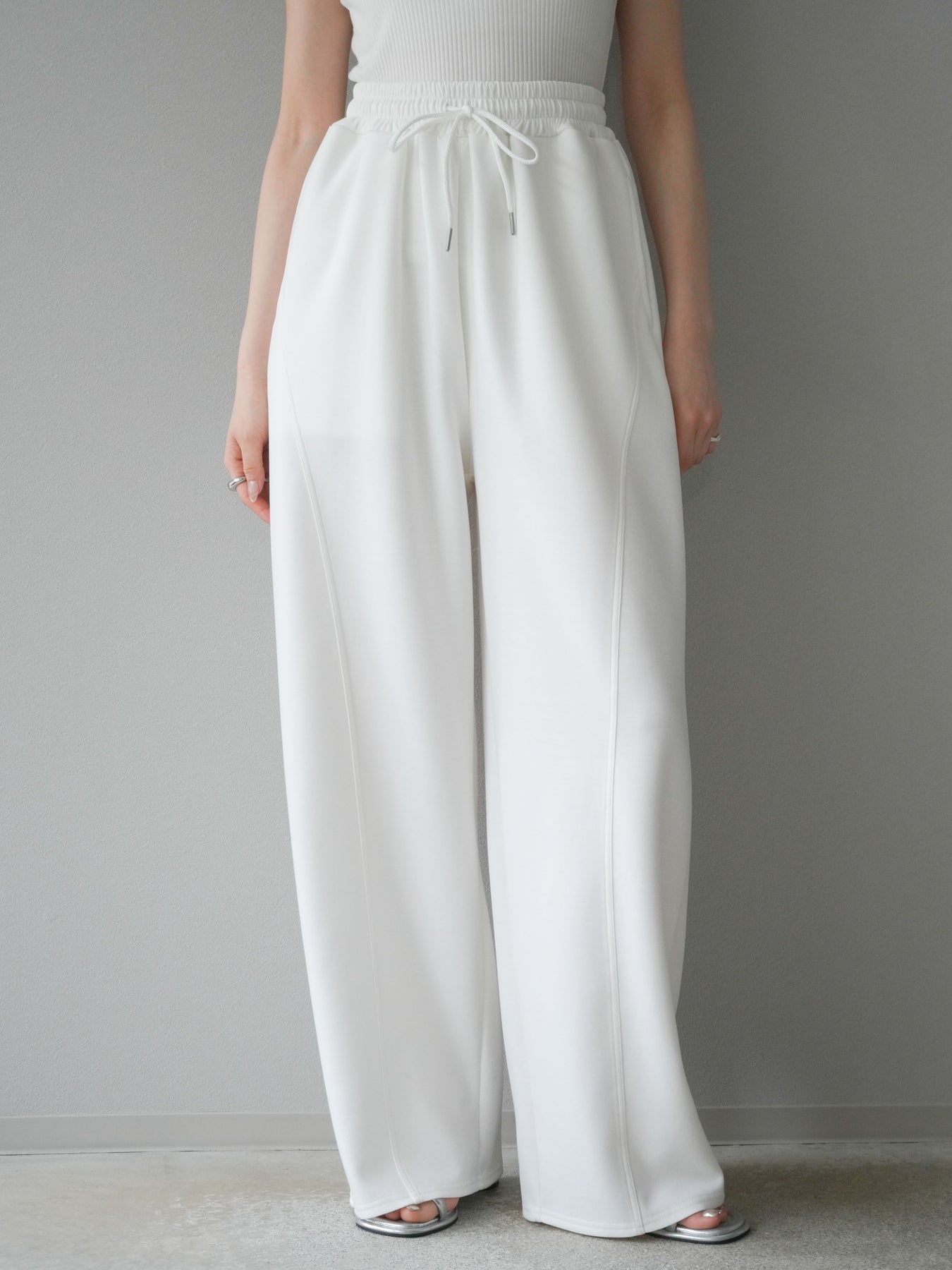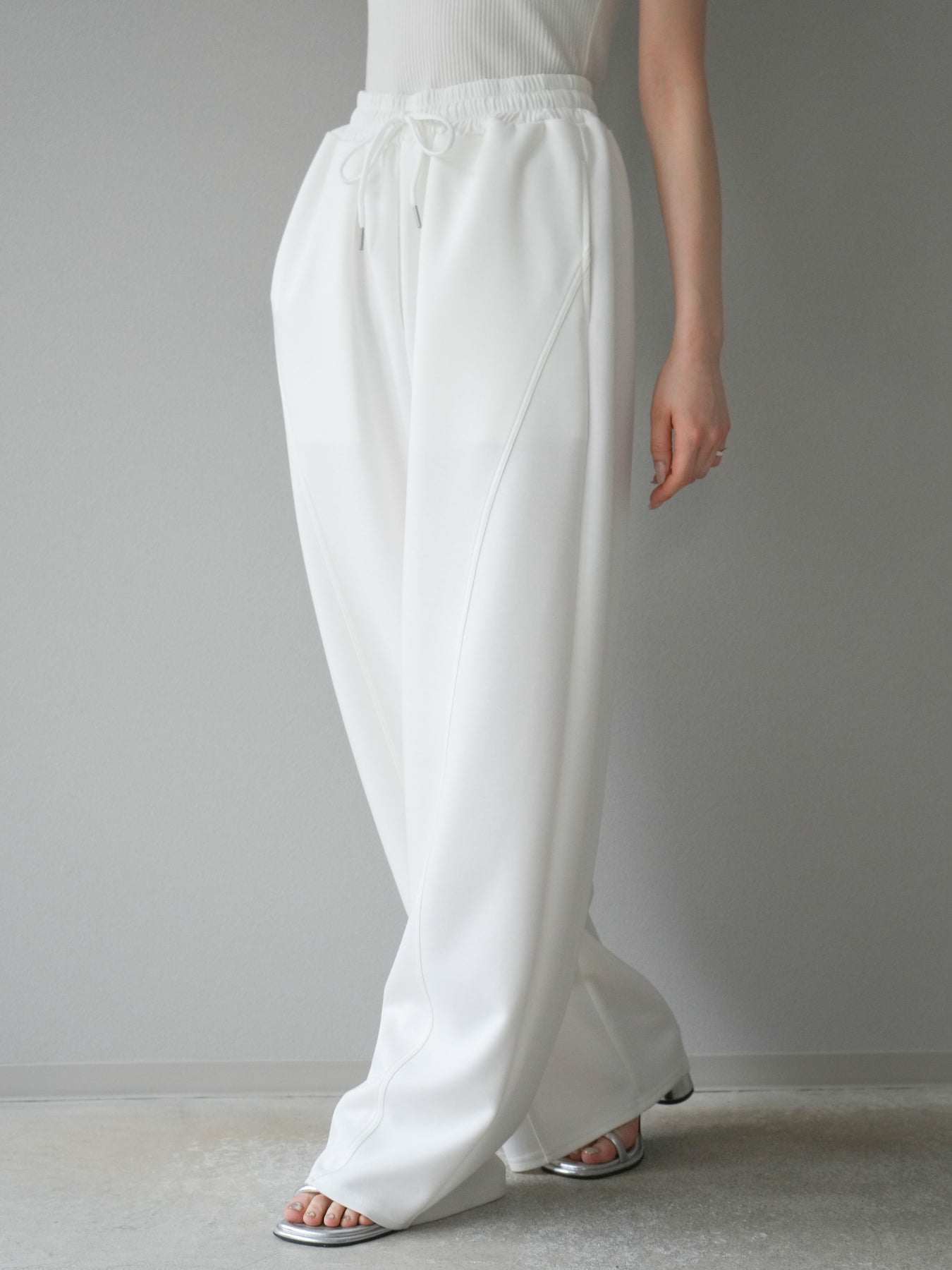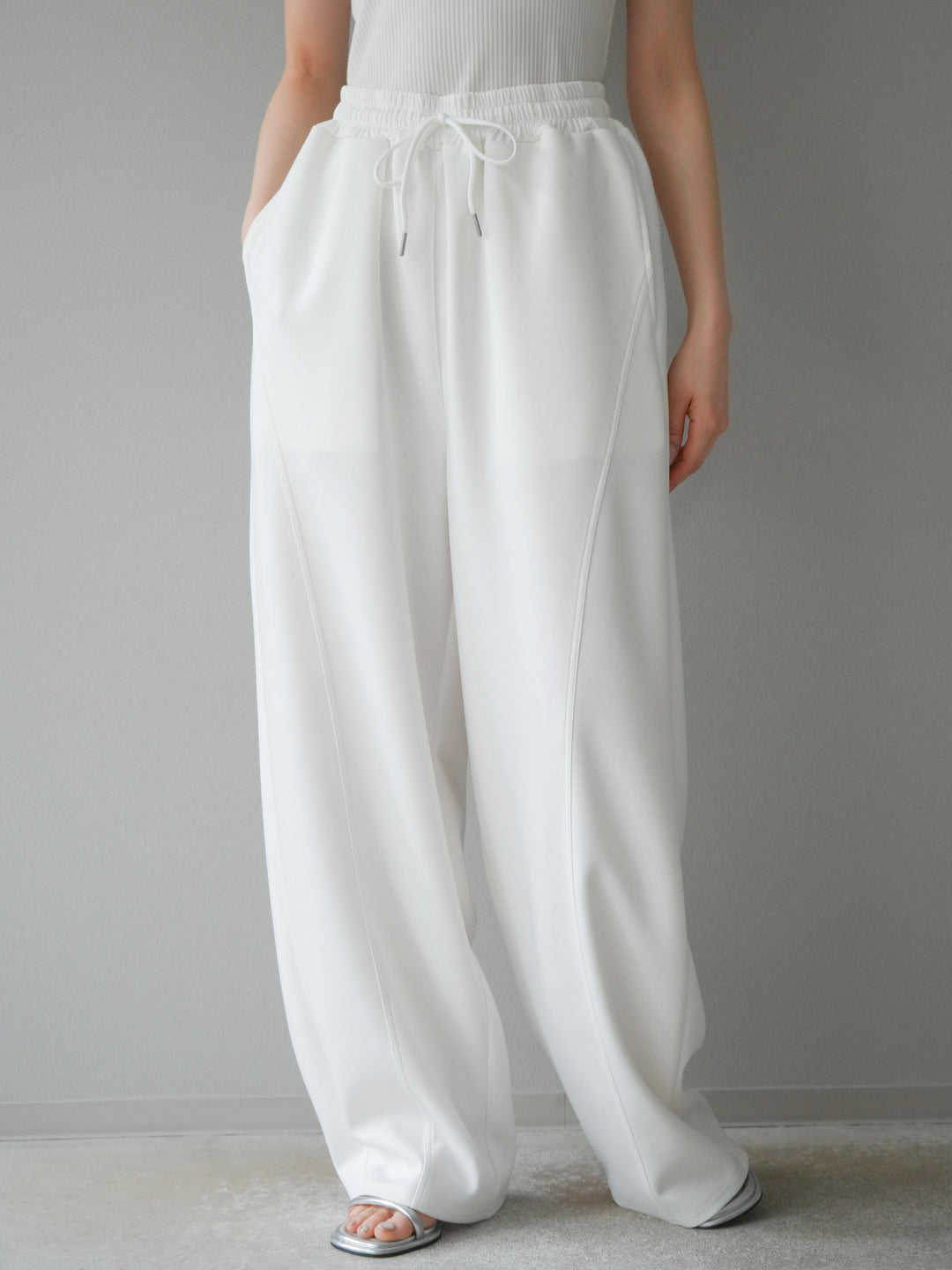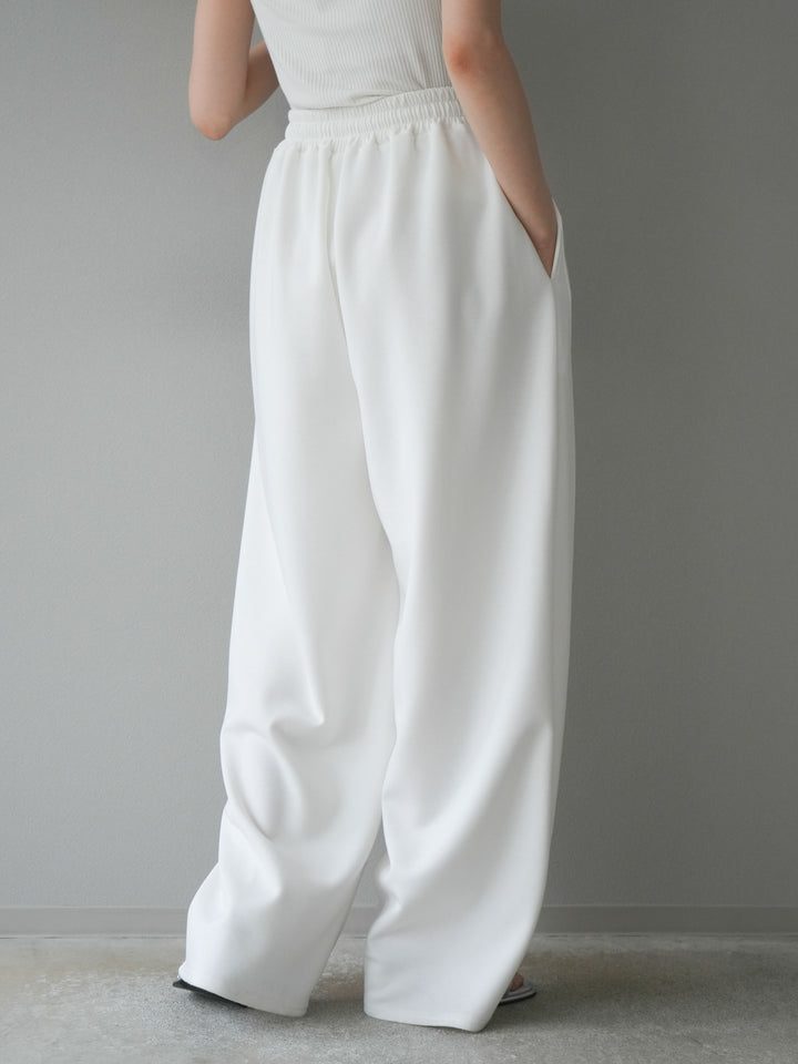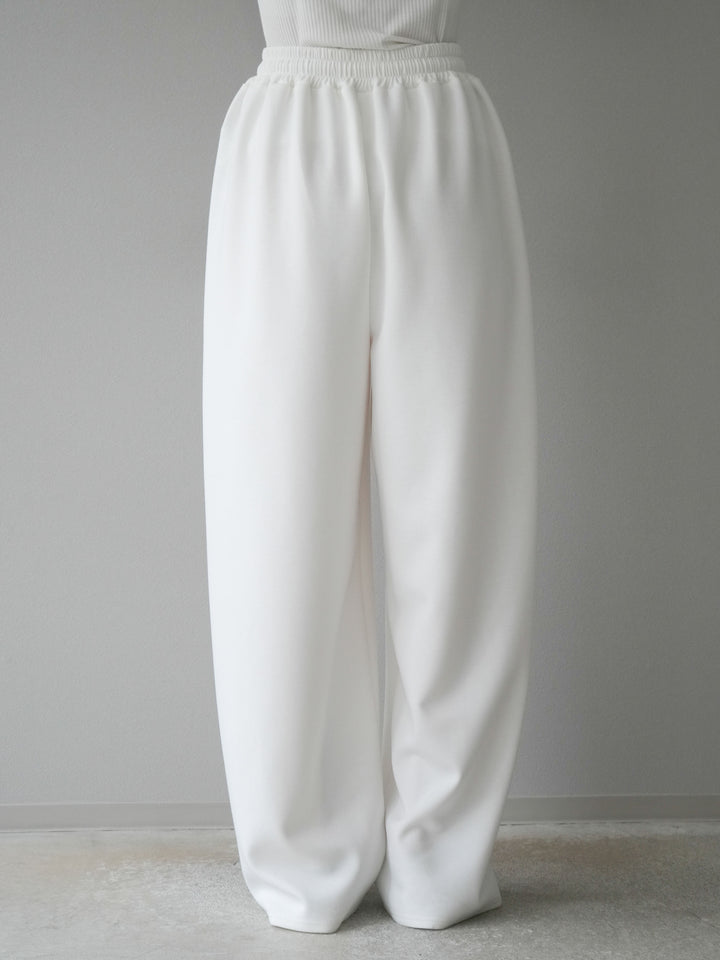 立体的なカーブラインが特徴のトレンドライクなワイドパンツ。柔らかくハリ感のあるポンチ素材で、美しいシルエットをキープしながら快適な穿き心地を実現。ウエストはゴム仕様でストレスフリー。シンプルながらひとクセ効いたデザインで、カジュアルにもきれいめにも着回せる万能アイテムです。 ※ボトムス、キャミソール(インナー)以外の商品は一律でインナーは付属していません
