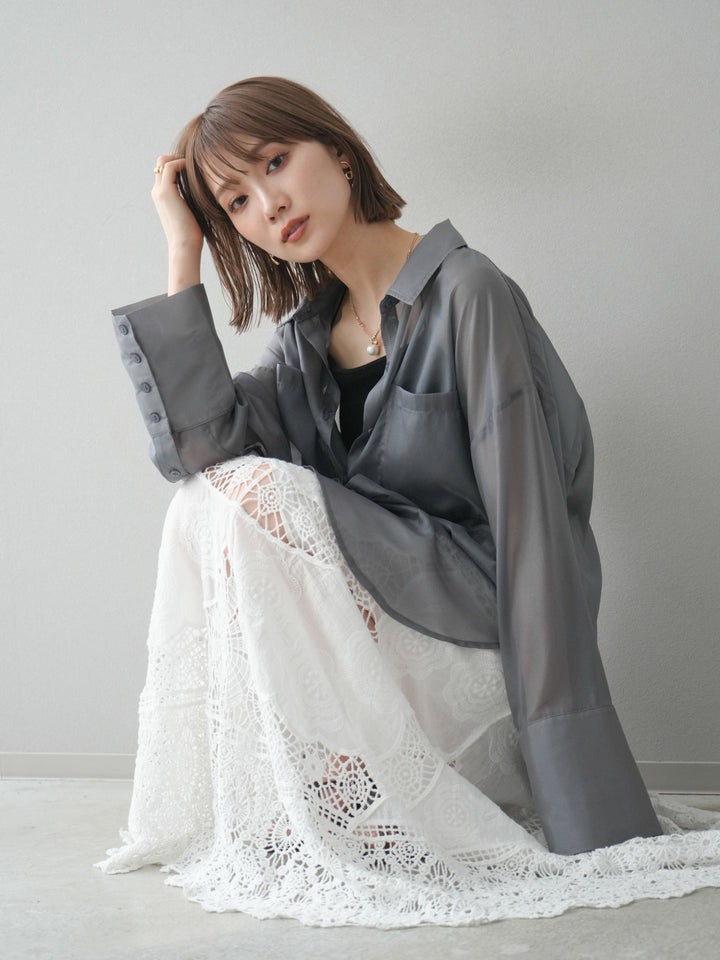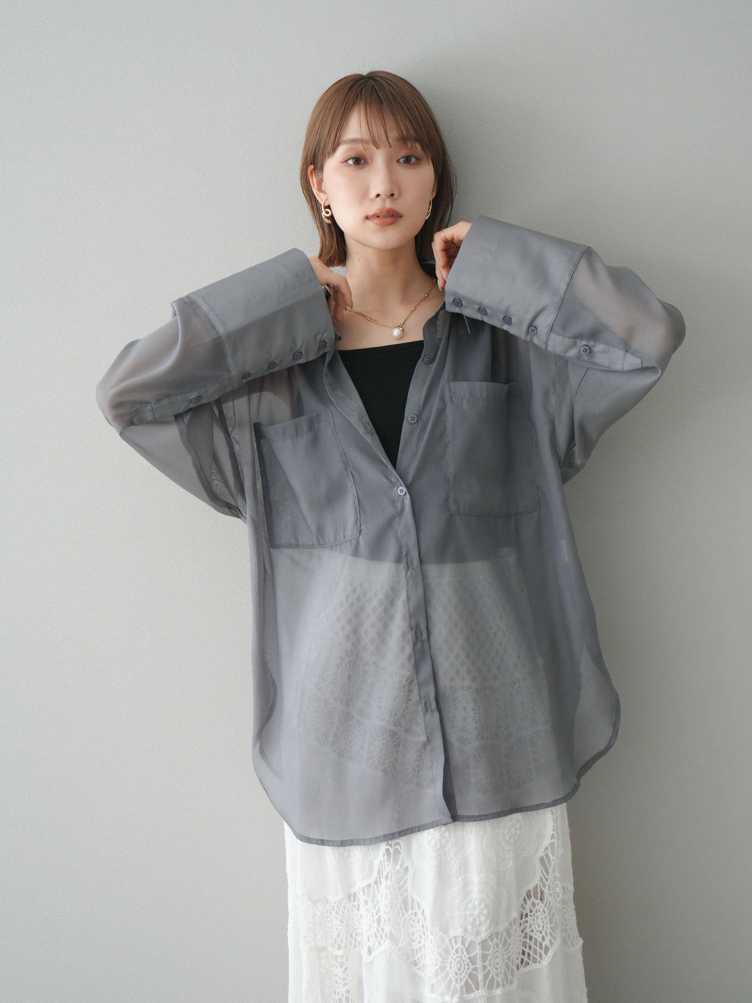 ラメのきらめきがほんのり漂うシアー素材が魅力のシャツ。抜け感のある透け感と、ゆったりとしたシルエットが旬のスタイリングに仕上げてくれます。長めのカフスがさりげないアクセントに。トレンド感のあるレイヤードスタイルにもぴったりな一枚です。 ※ボトムス、キャミソール(インナー)以外の商品は一律でインナーは付属していません