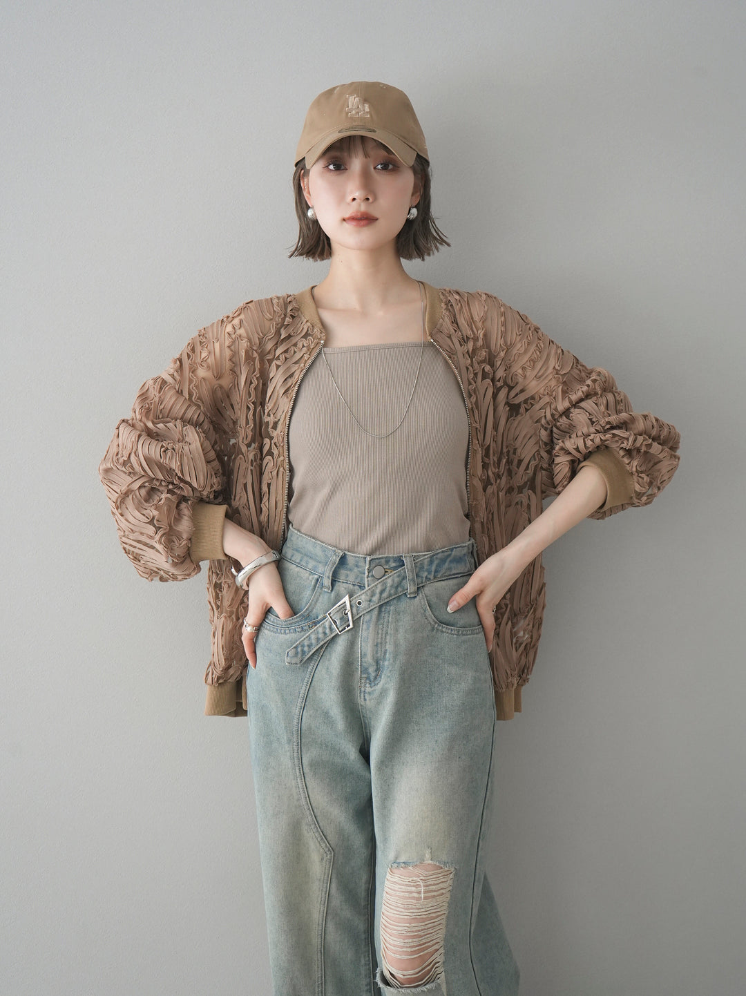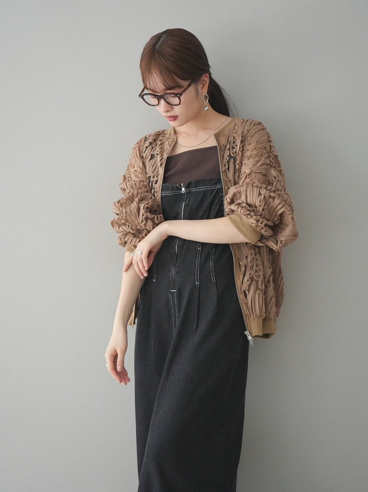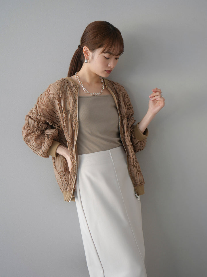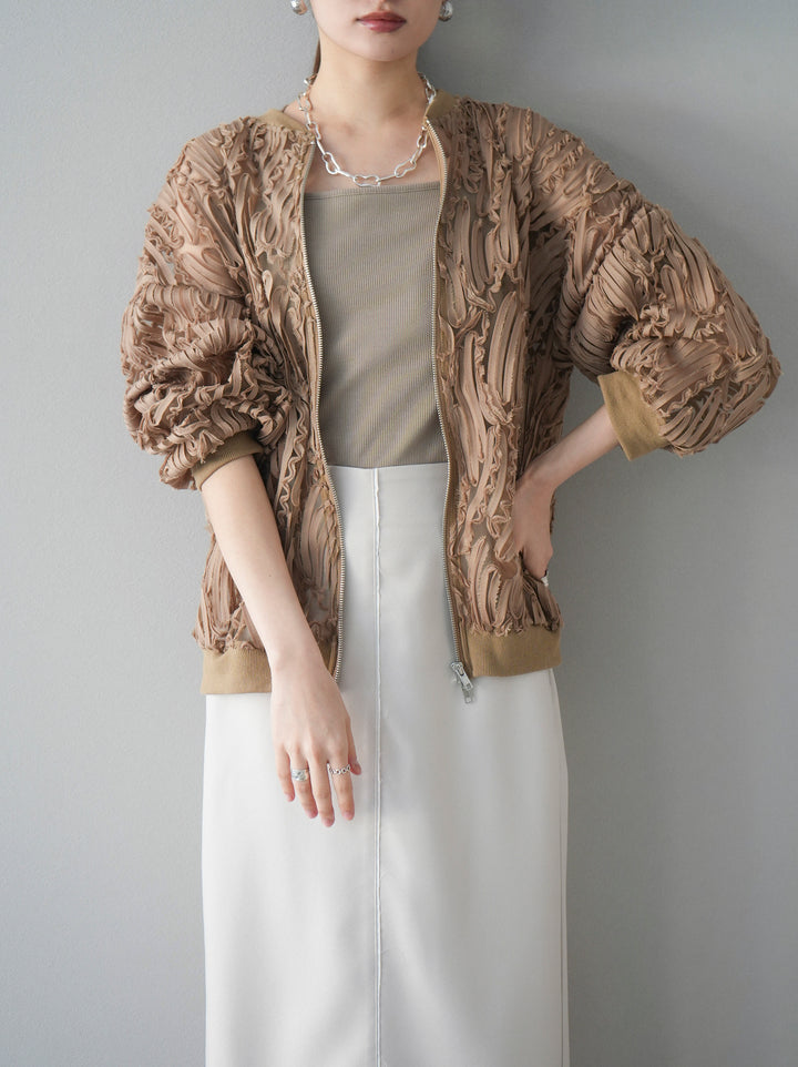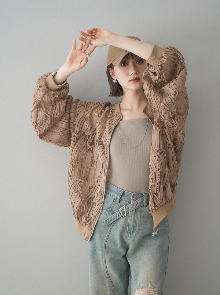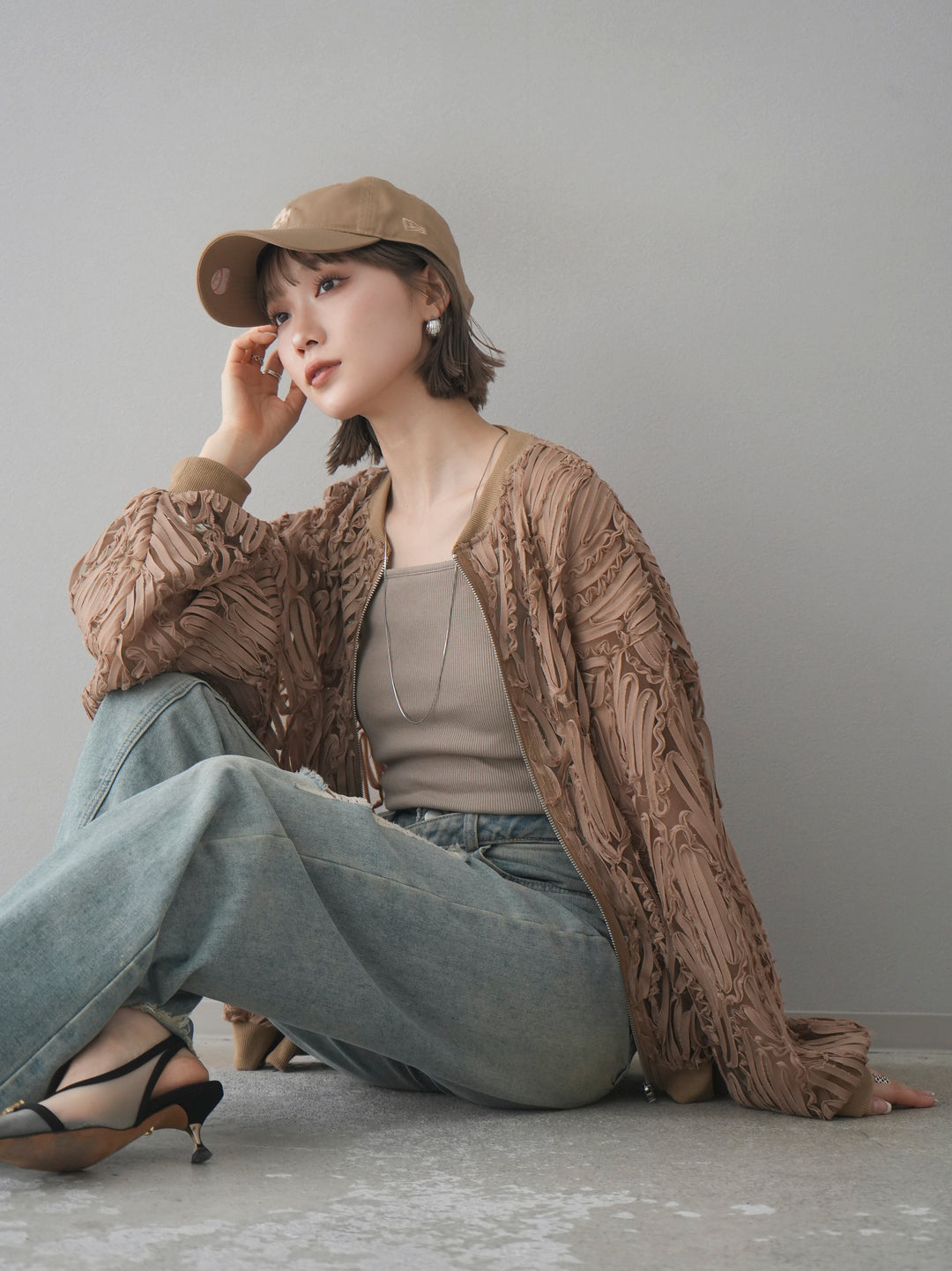 トレンドのシアー素材を使用したジャガードブルゾン。立体感のあるテクスチャーが特徴で、軽やかながらも存在感のある仕上がりに。ZIP仕様で羽織りやすく、カジュアルにもきれいめにもマッチ。コーデにアクセントを加えつつ、シーズンムードを引き上げる一枚。 ※ボトムス、キャミソール(インナー)以外の商品は一律でインナーは付属していません。
