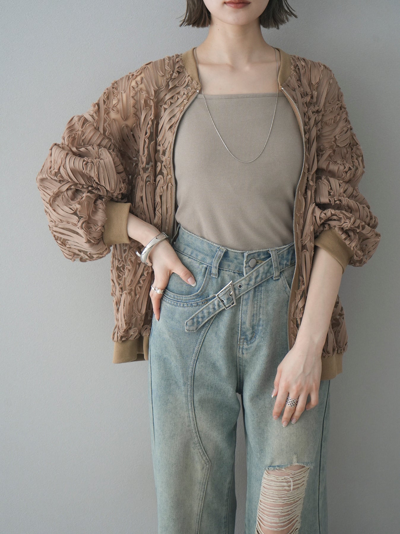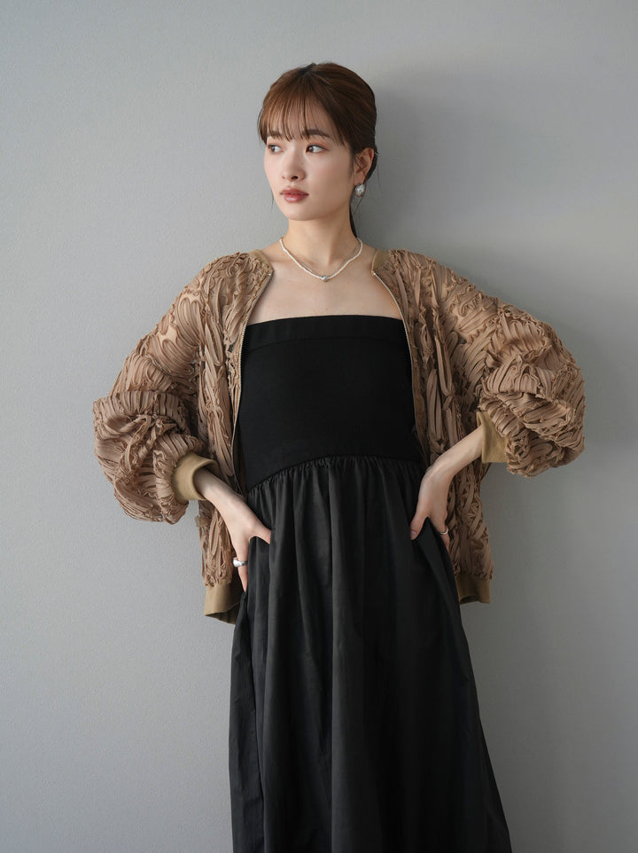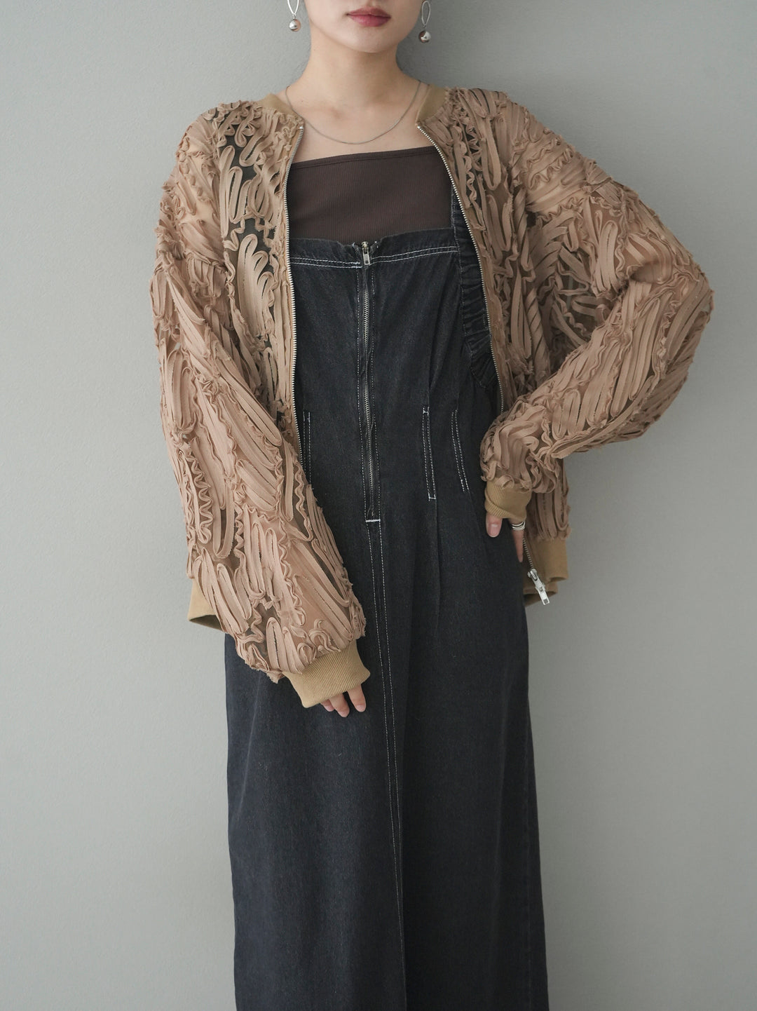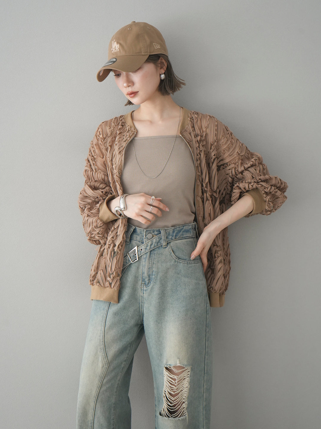 トレンドのシアー素材を使用したジャガードブルゾン。立体感のあるテクスチャーが特徴で、軽やかながらも存在感のある仕上がりに。ZIP仕様で羽織りやすく、カジュアルにもきれいめにもマッチ。コーデにアクセントを加えつつ、シーズンムードを引き上げる一枚。 ※ボトムス、キャミソール(インナー)以外の商品は一律でインナーは付属していません。