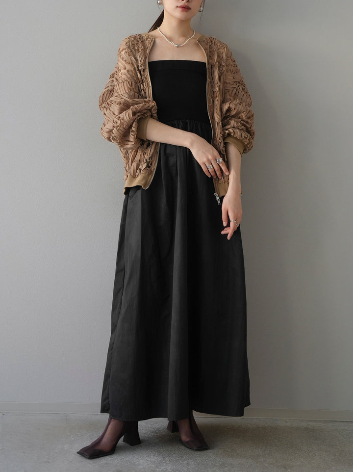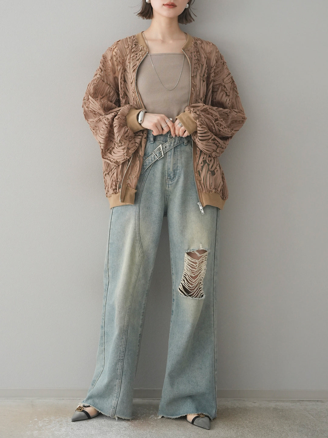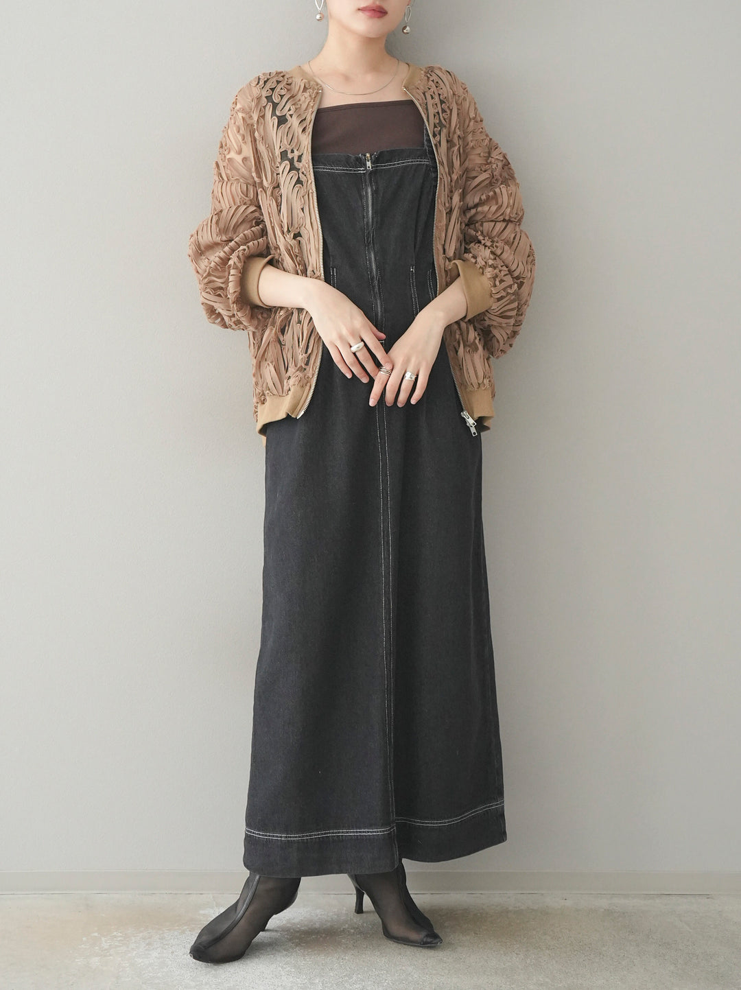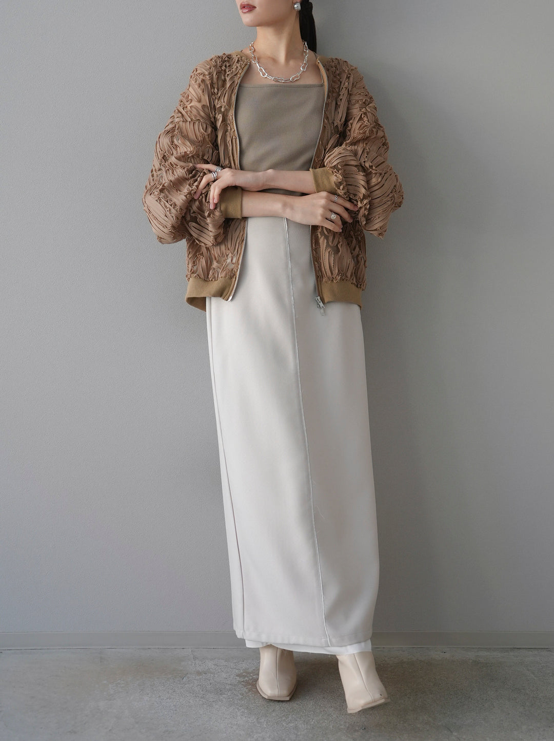 トレンドのシアー素材を使用したジャガードブルゾン。立体感のあるテクスチャーが特徴で、軽やかながらも存在感のある仕上がりに。ZIP仕様で羽織りやすく、カジュアルにもきれいめにもマッチ。コーデにアクセントを加えつつ、シーズンムードを引き上げる一枚。 ※ボトムス、キャミソール(インナー)以外の商品は一律でインナーは付属していません。
