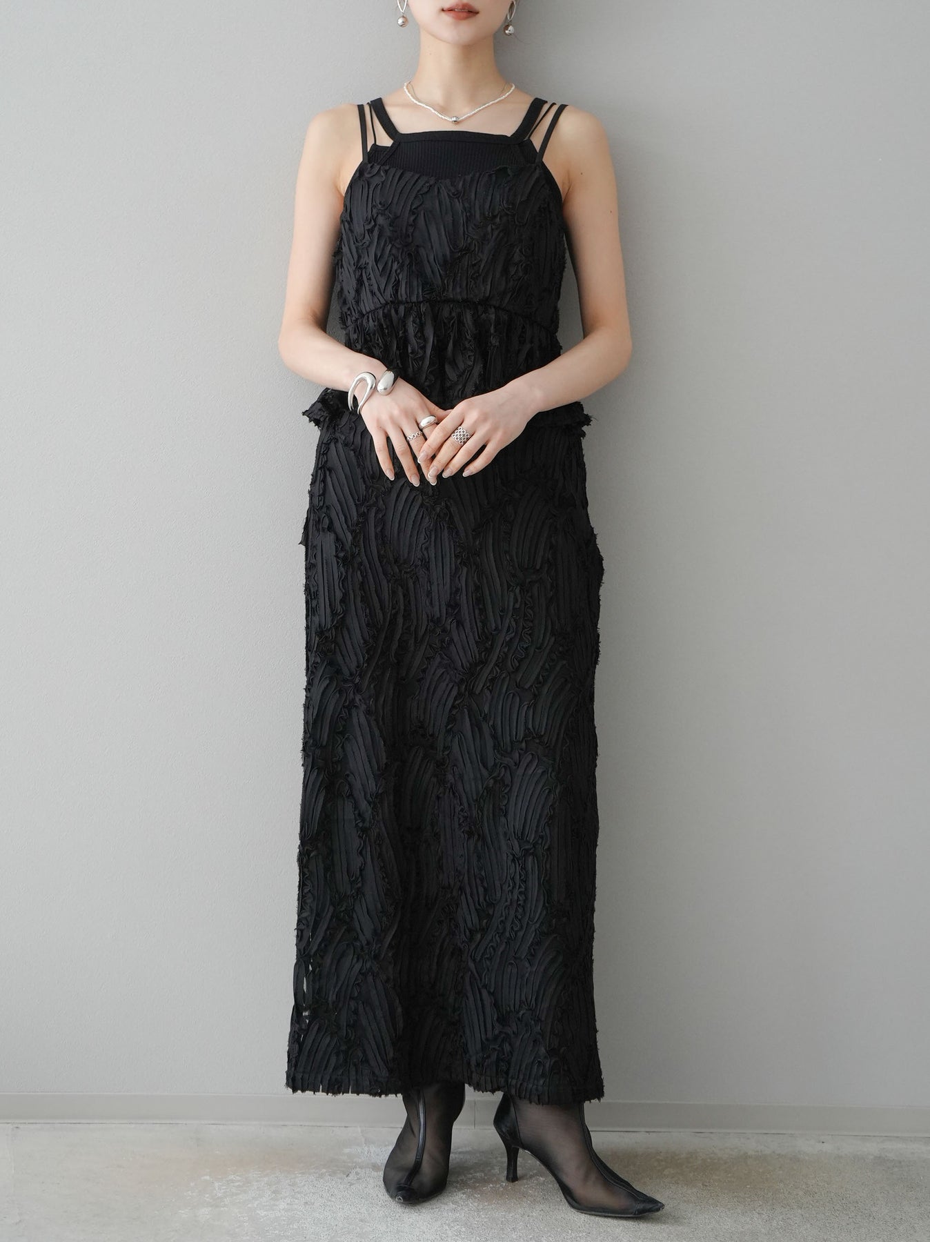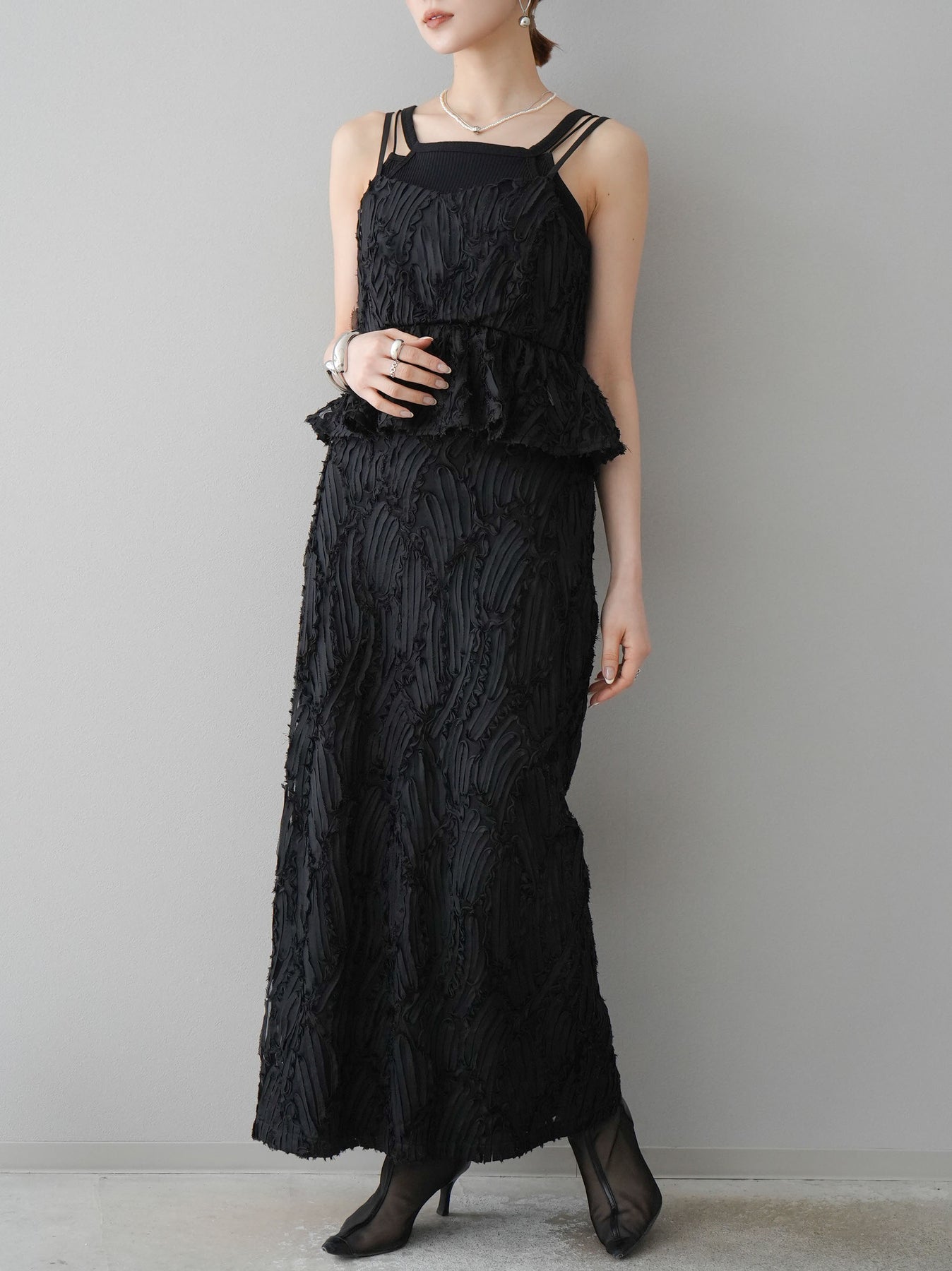 トレンド感漂うジャガードラインレースのIラインスカート。繊細な立体感のある生地が特徴で、シンプルながらも存在感を放ちます。スッキリとしたシルエットがスタイルアップを叶え、トップスを選ばず幅広いコーディネートに対応。後ろスリット入りで動きやすさも◎。モードな雰囲気を演出する一枚です。 ※ボトムス、キャミソール(インナー)以外の商品は一律でインナーは付属していません。