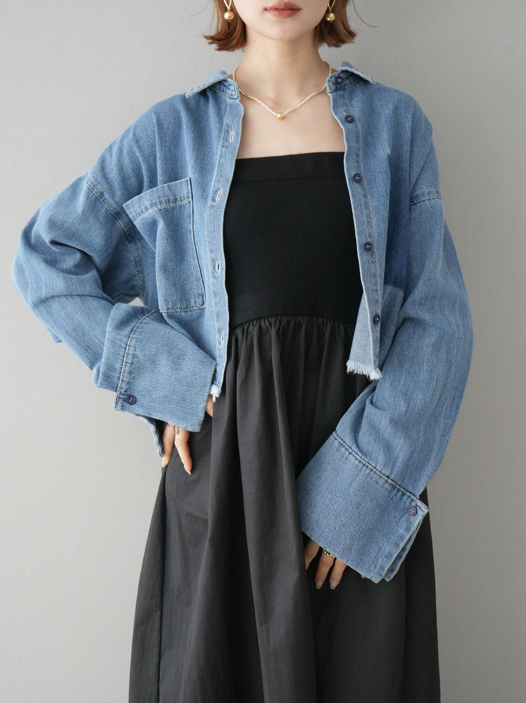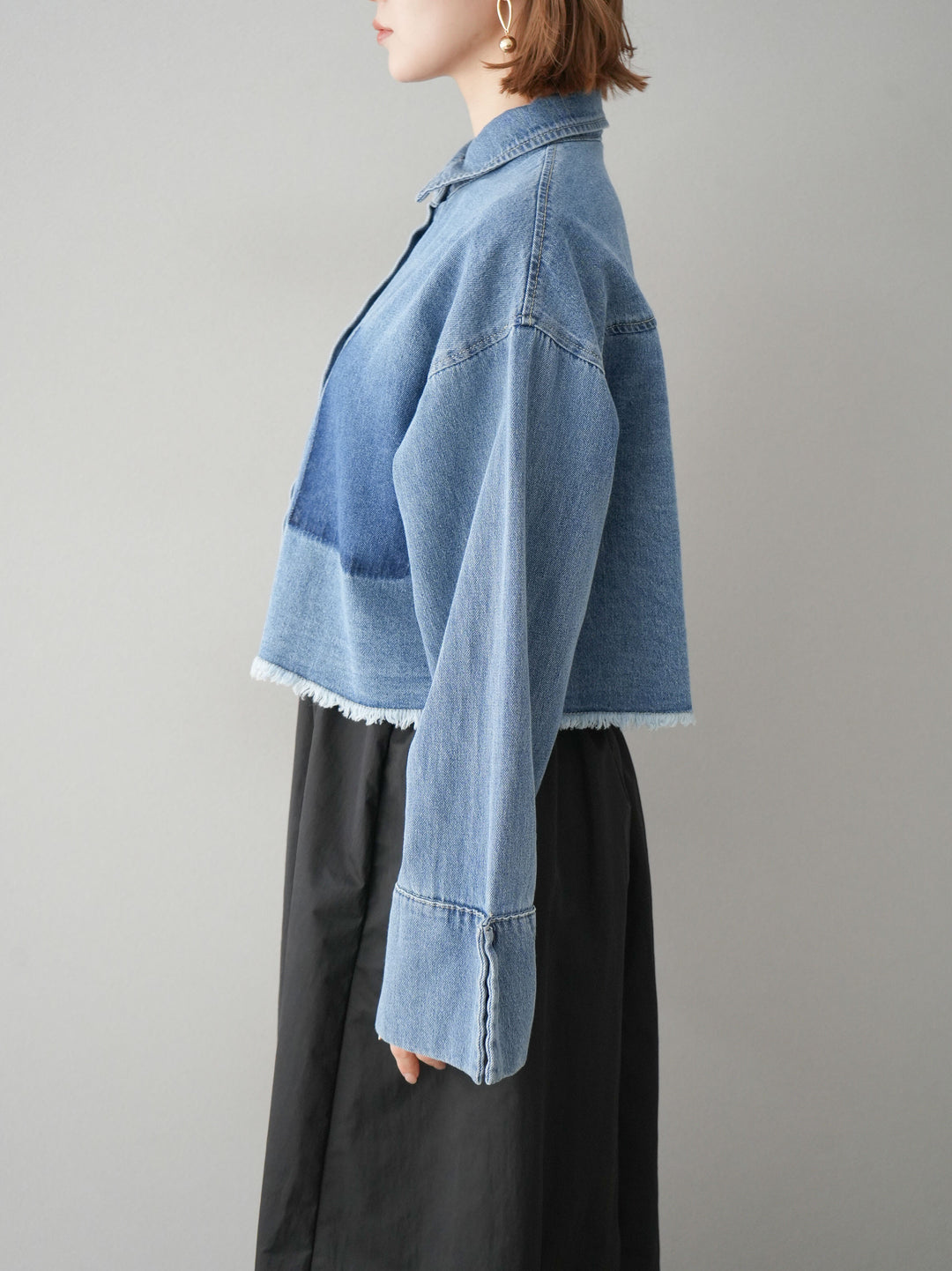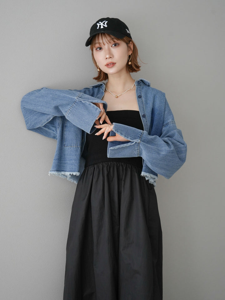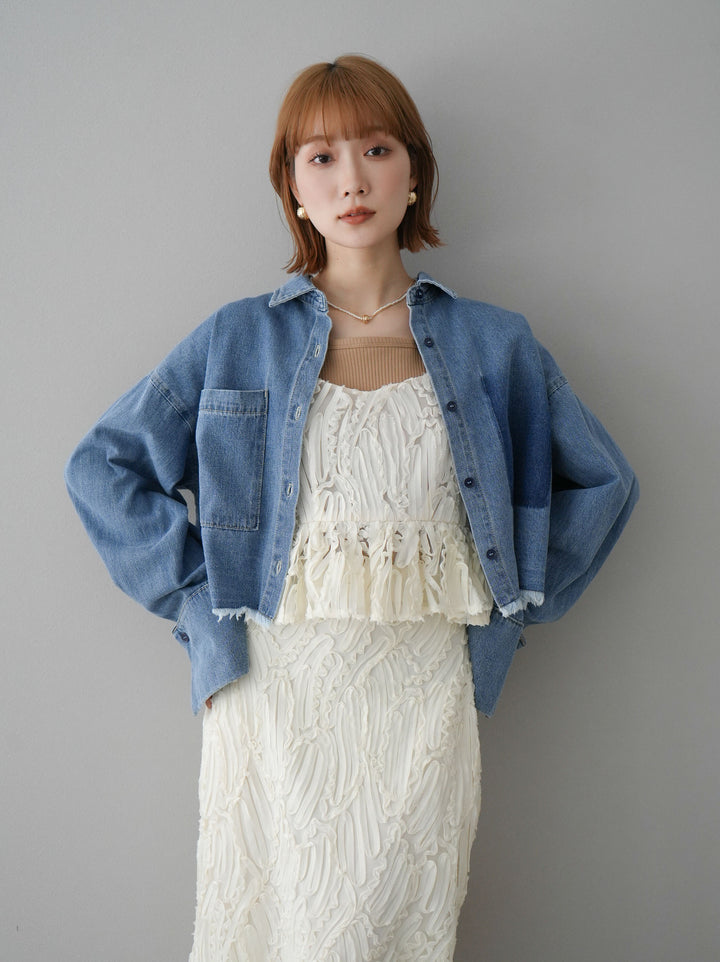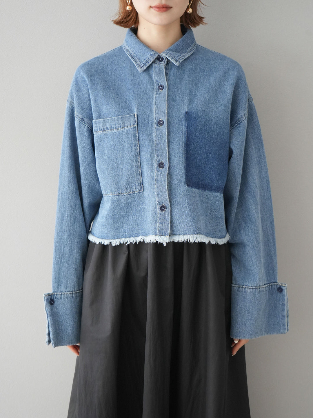 ヴィンテージ感のあるウォッシュ加工が魅力のショート丈デニムシャツ。大きめのポケットがアクセントになり、こなれた印象を演出します。ラフなカットオフデザインで、カジュアルながらも洗練されたスタイルに仕上がる一枚。ワンピースやハイウエストボトムスと好相性で、幅広いコーディネートに活躍します。 ※ボトムス、キャミソール(インナー)以外の商品は一律でインナーは付属していません。