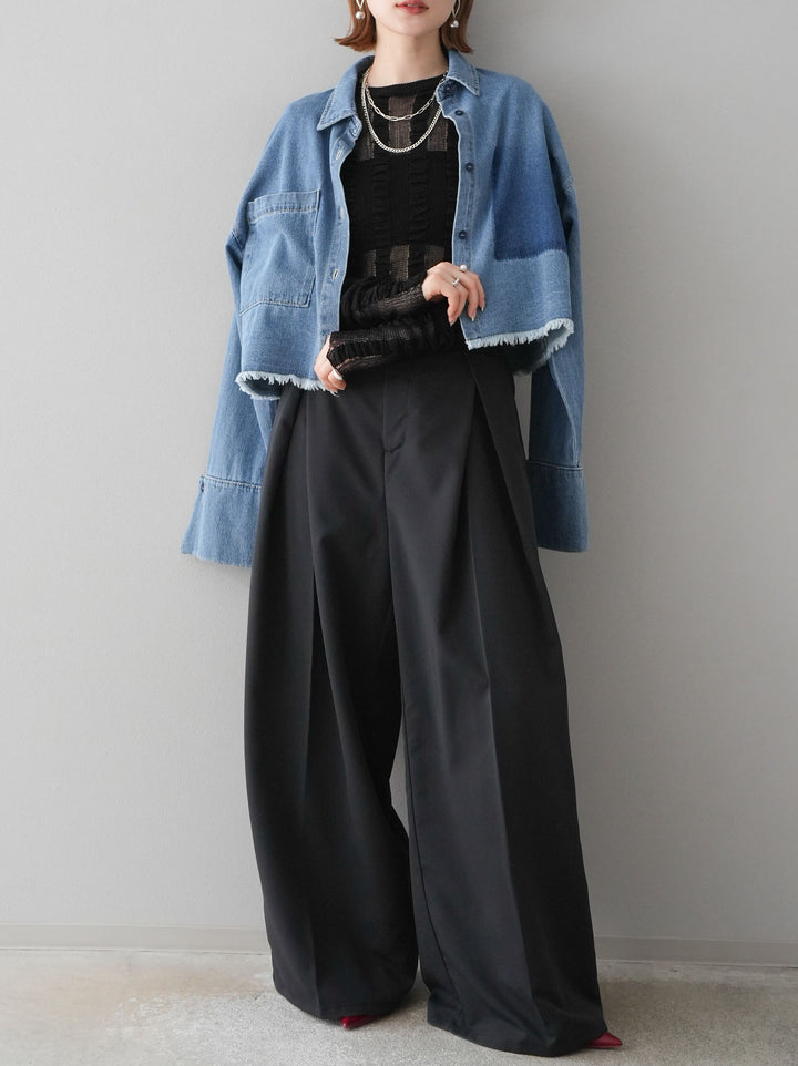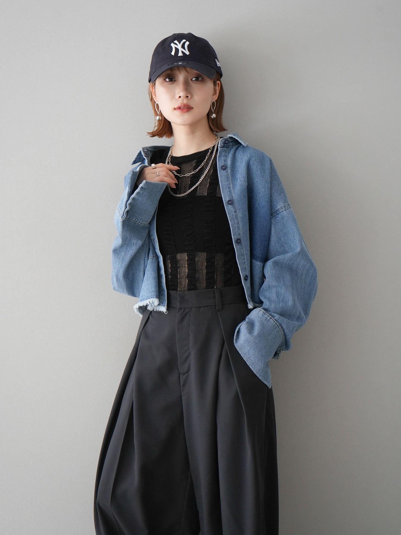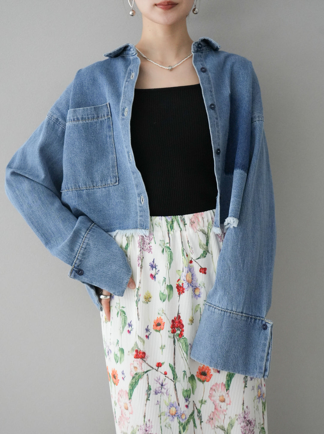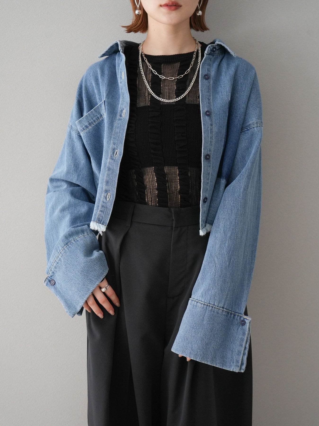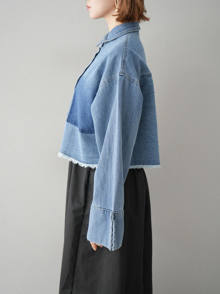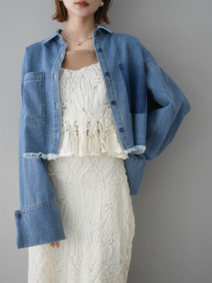 ヴィンテージ感のあるウォッシュ加工が魅力のショート丈デニムシャツ。大きめのポケットがアクセントになり、こなれた印象を演出します。ラフなカットオフデザインで、カジュアルながらも洗練されたスタイルに仕上がる一枚。ワンピースやハイウエストボトムスと好相性で、幅広いコーディネートに活躍します。 ※ボトムス、キャミソール(インナー)以外の商品は一律でインナーは付属していません。