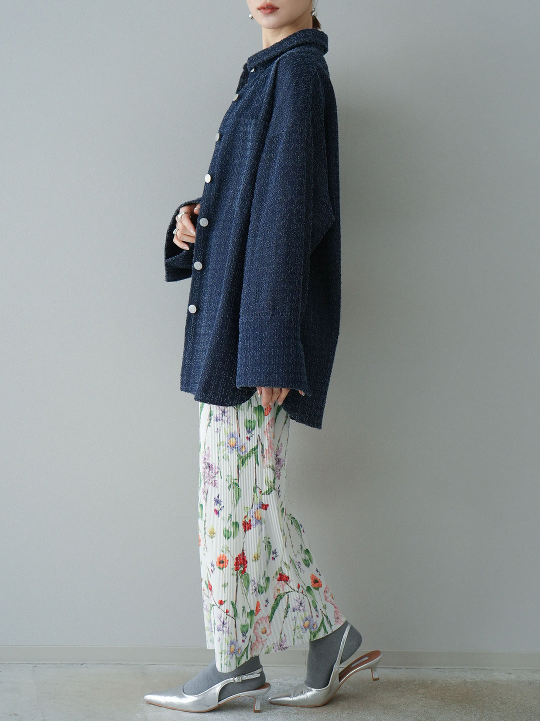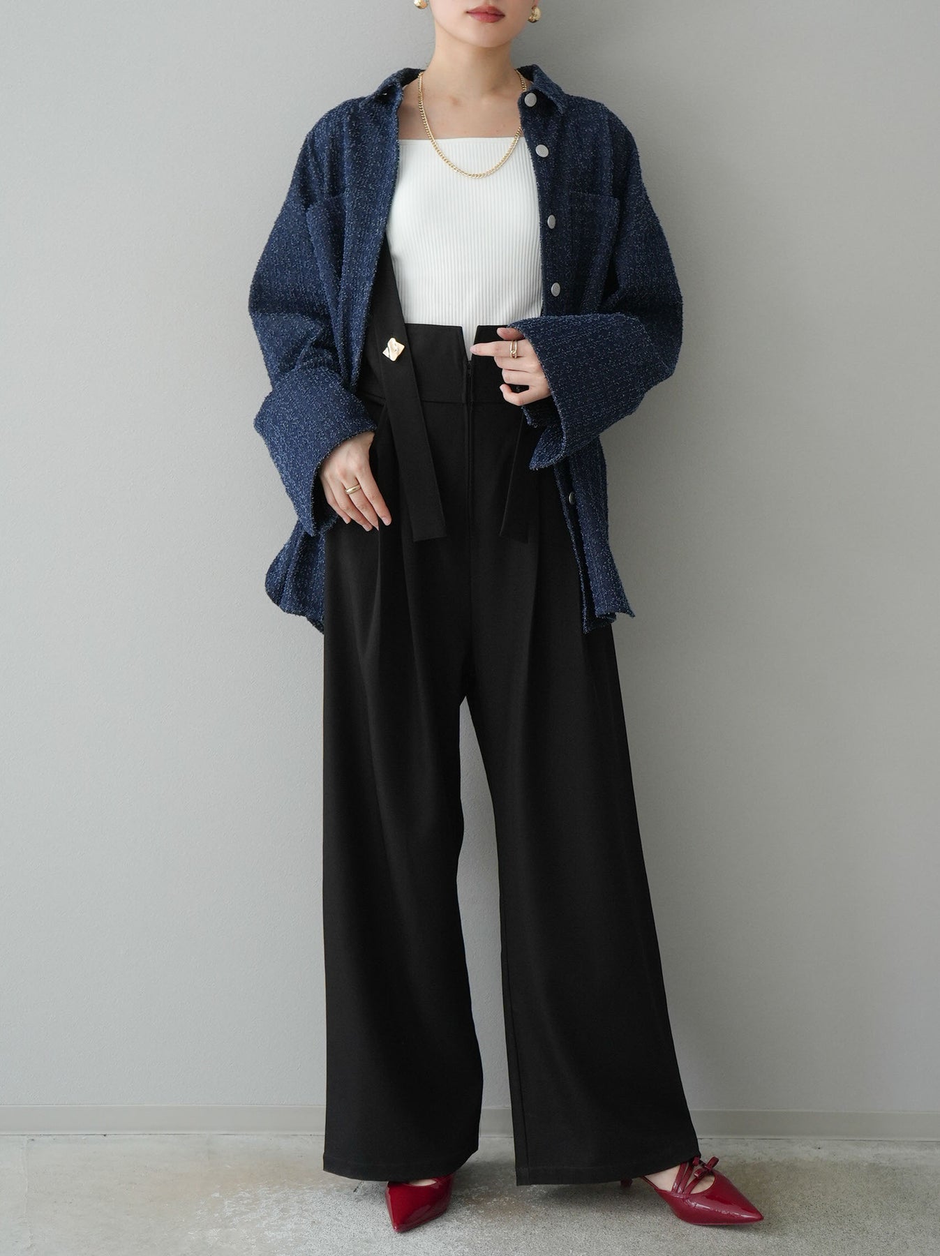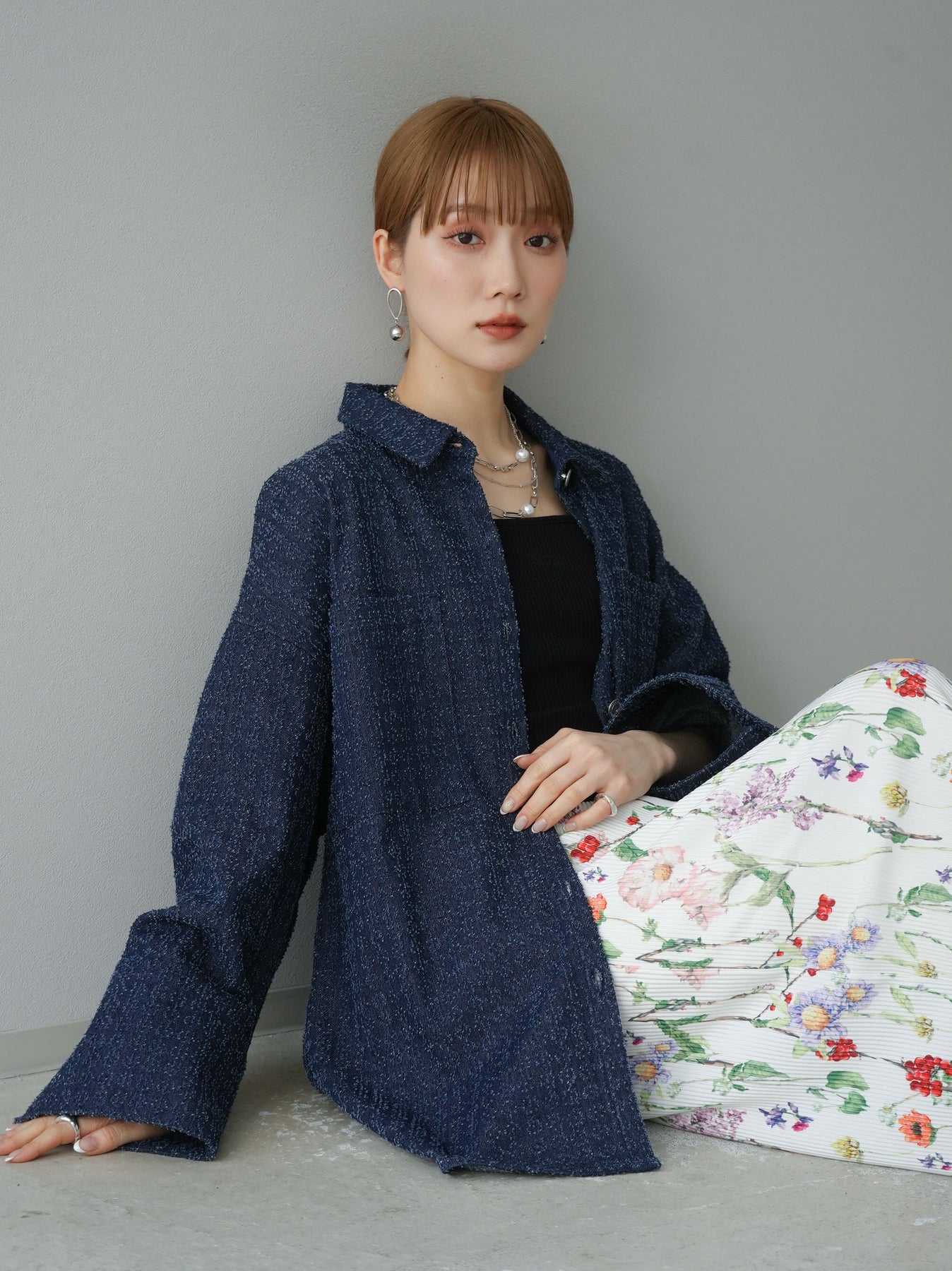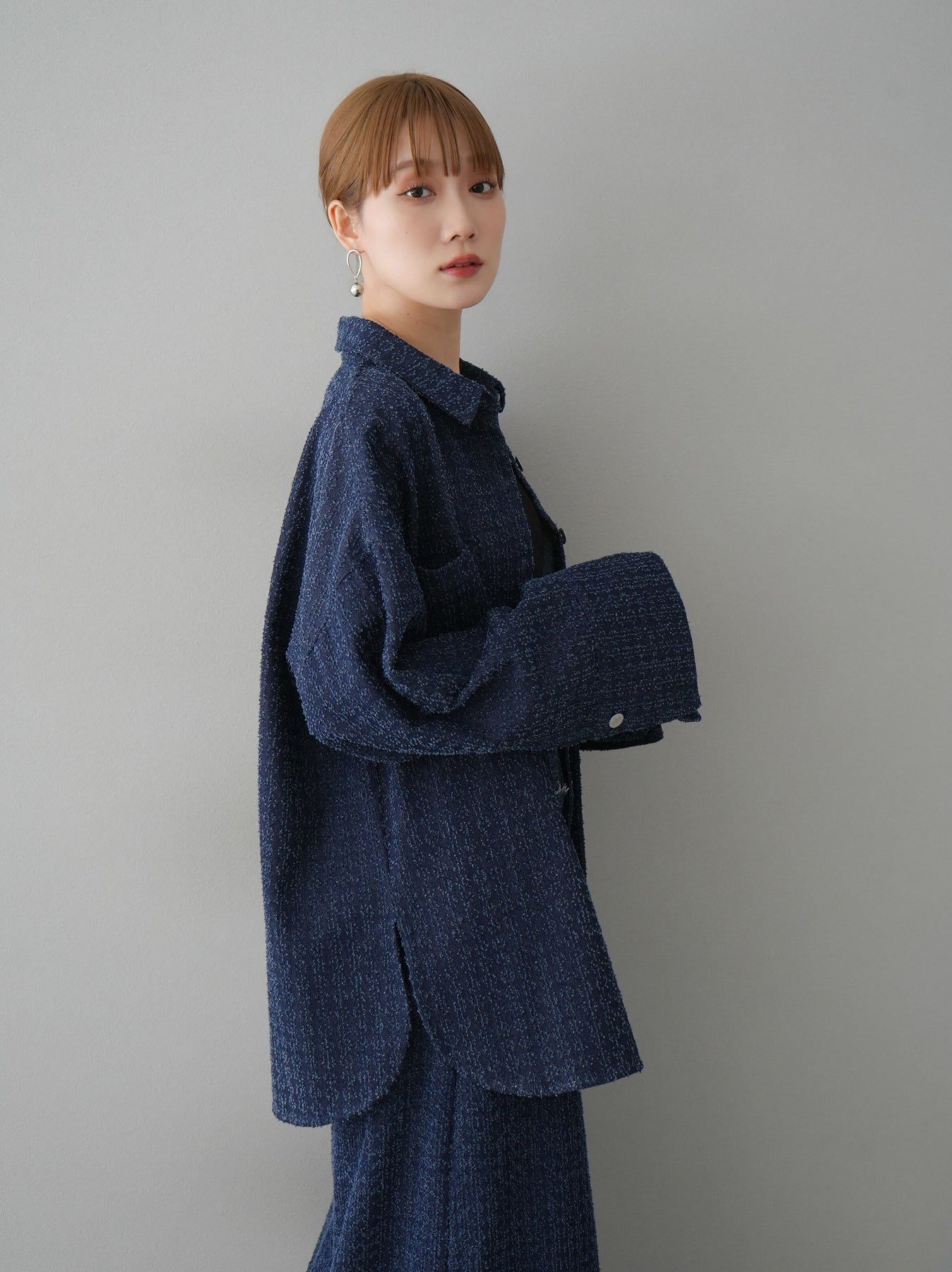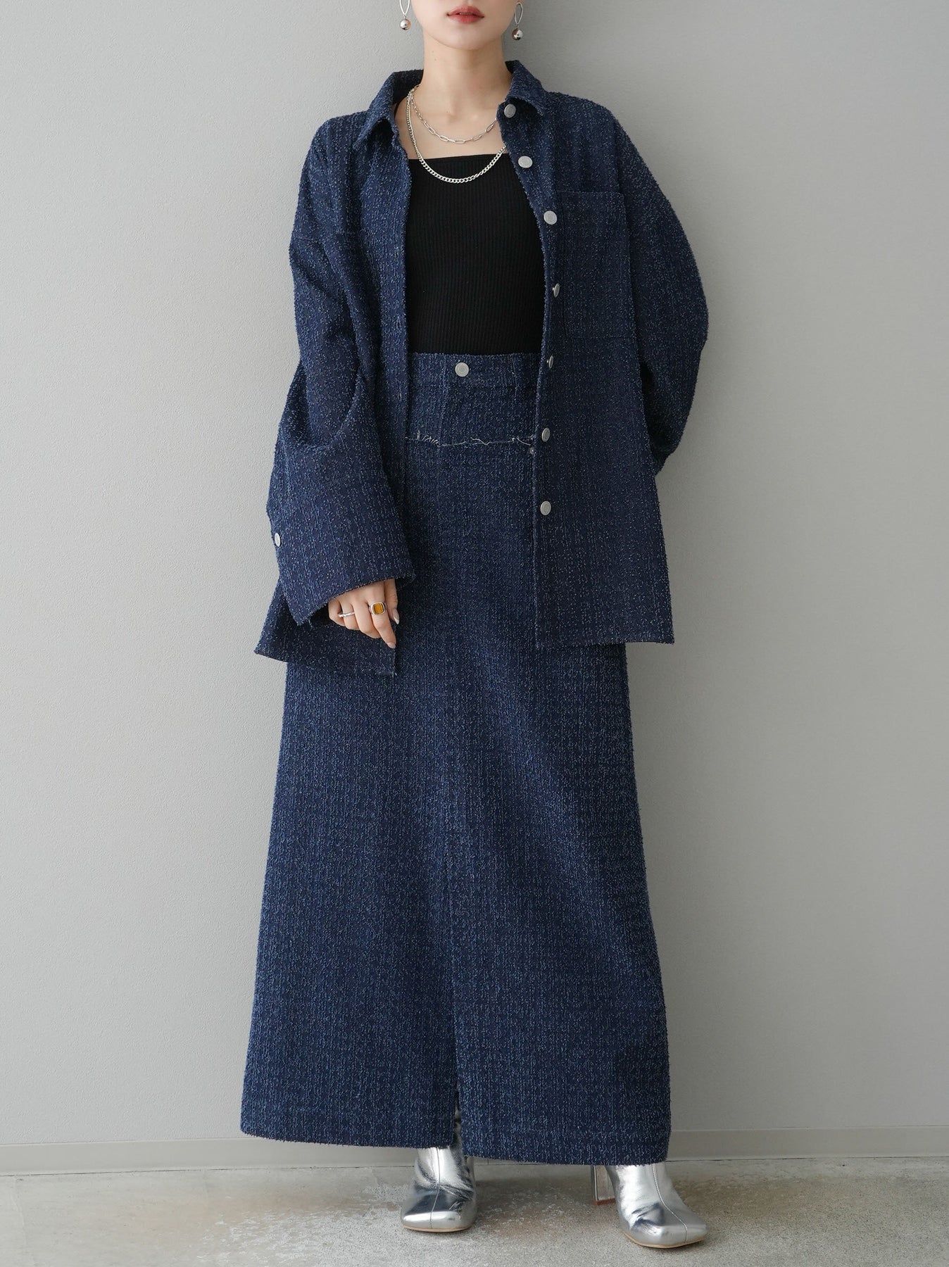 トレンド感のあるオーバーシルエットが魅力のデニムシャツジャケット。ネップデニムの風合いが、こなれた雰囲気を演出します。大きめのポケットとシルバーボタンがアクセントになり、シンプルながらも洗練された印象に。羽織りとしても使いやすく、デニムやスカートと合わせたカジュアルな着こなしにもぴったりのアイテムです。 ※ボトムス、キャミソール(インナー)以外の商品は一律でインナーは付属していません