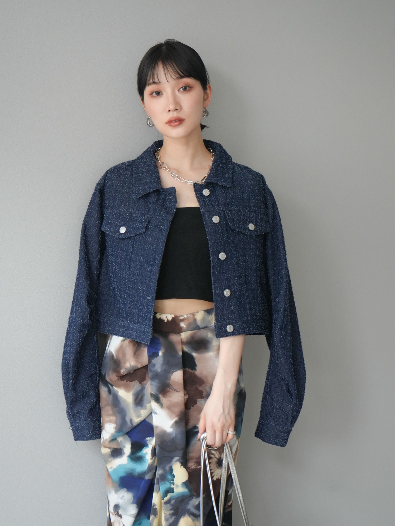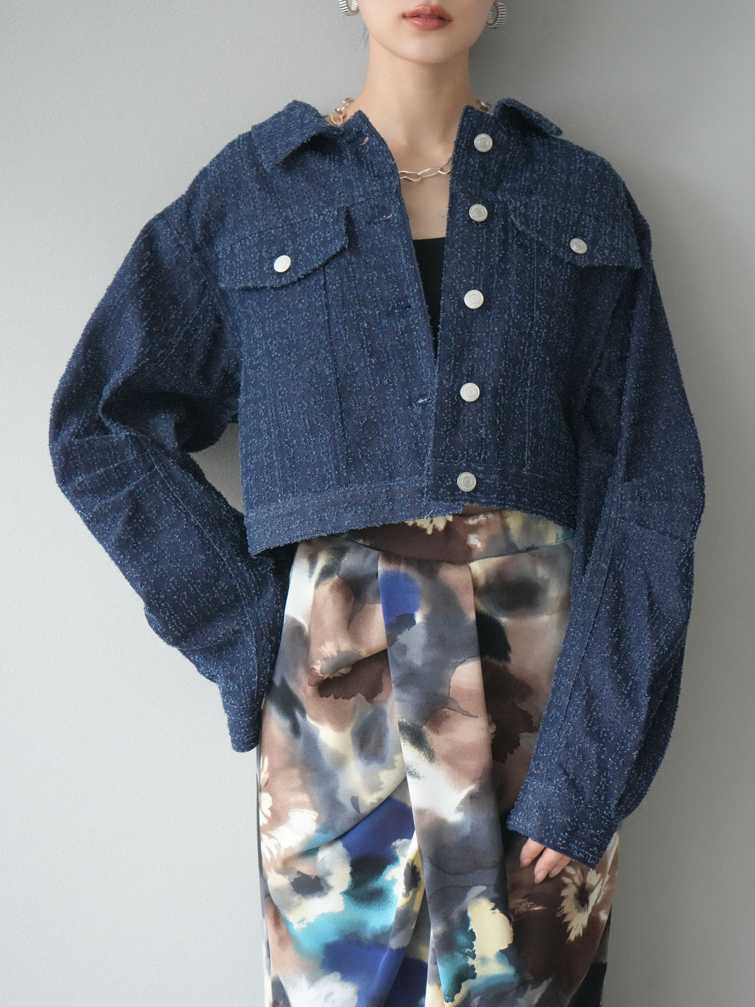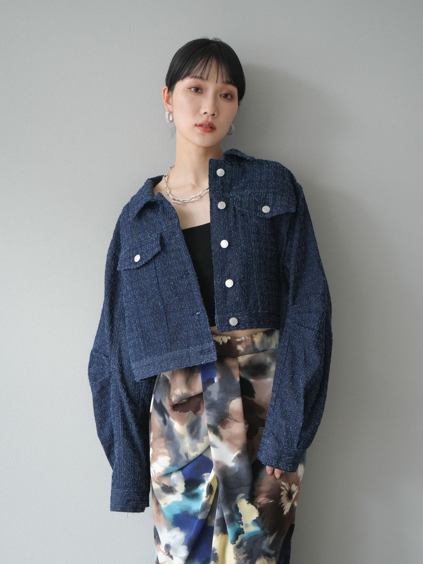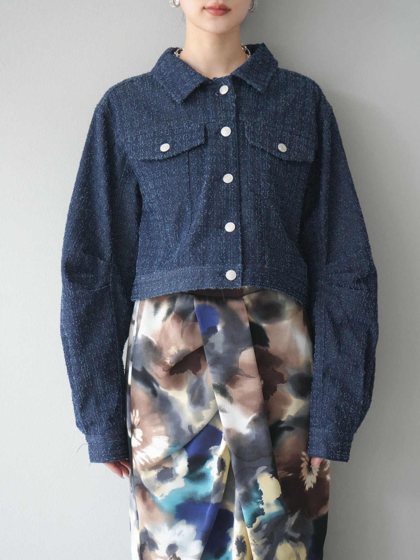 ナチュラルな風合いが魅力のネップデニムを使用したショートジャケット。タックを施した立体感のあるスリーブが、程よいモード感を演出します。ショート丈でバランスが取りやすく、ワイドパンツやスカートとも好相性。フロントのメタルボタンがアクセントになり、カジュアルながらも洗練された印象に仕上げた一着です。 ※ボトムス、キャミソール(インナー)以外の商品は一律でインナーは付属していません