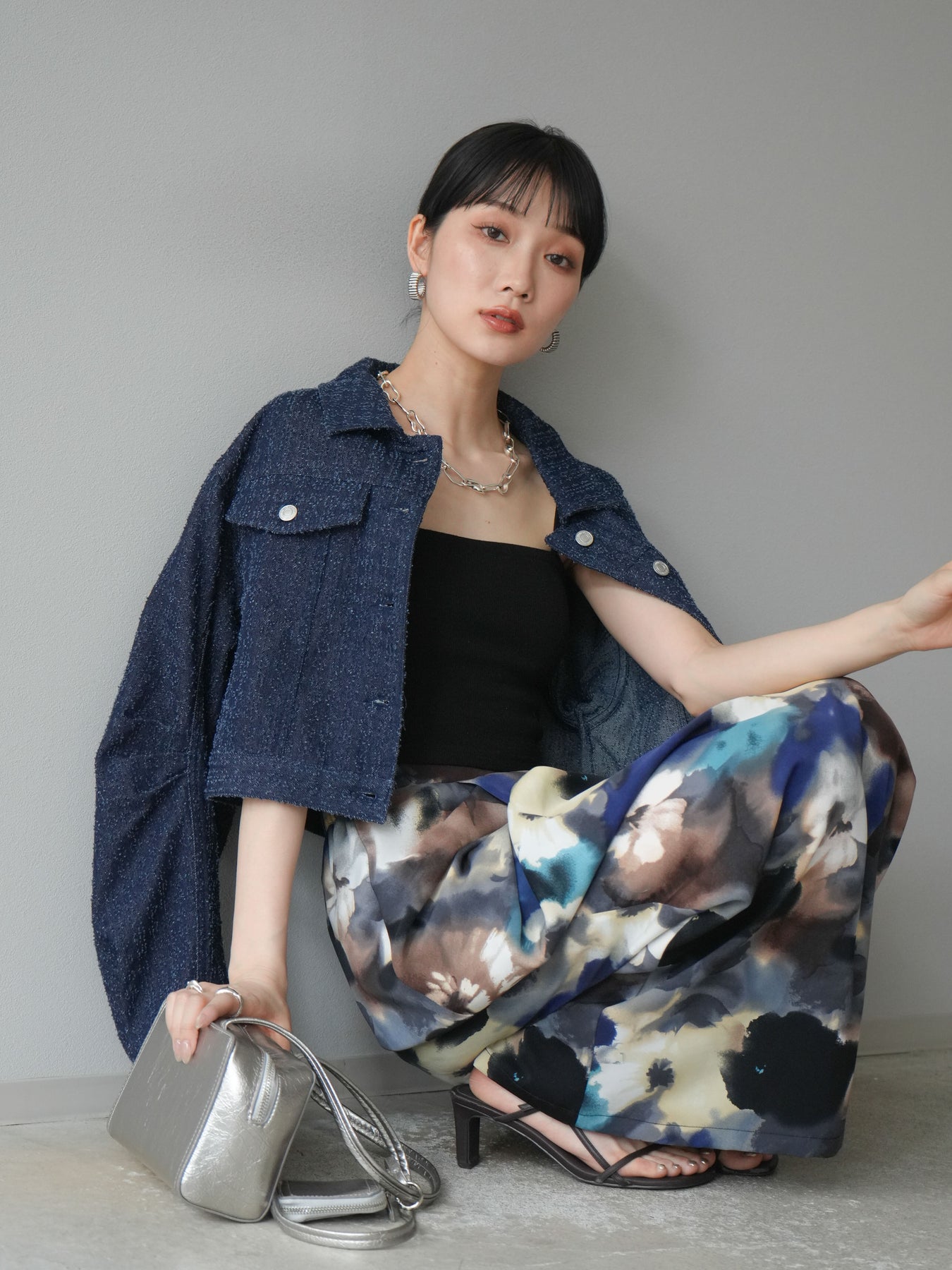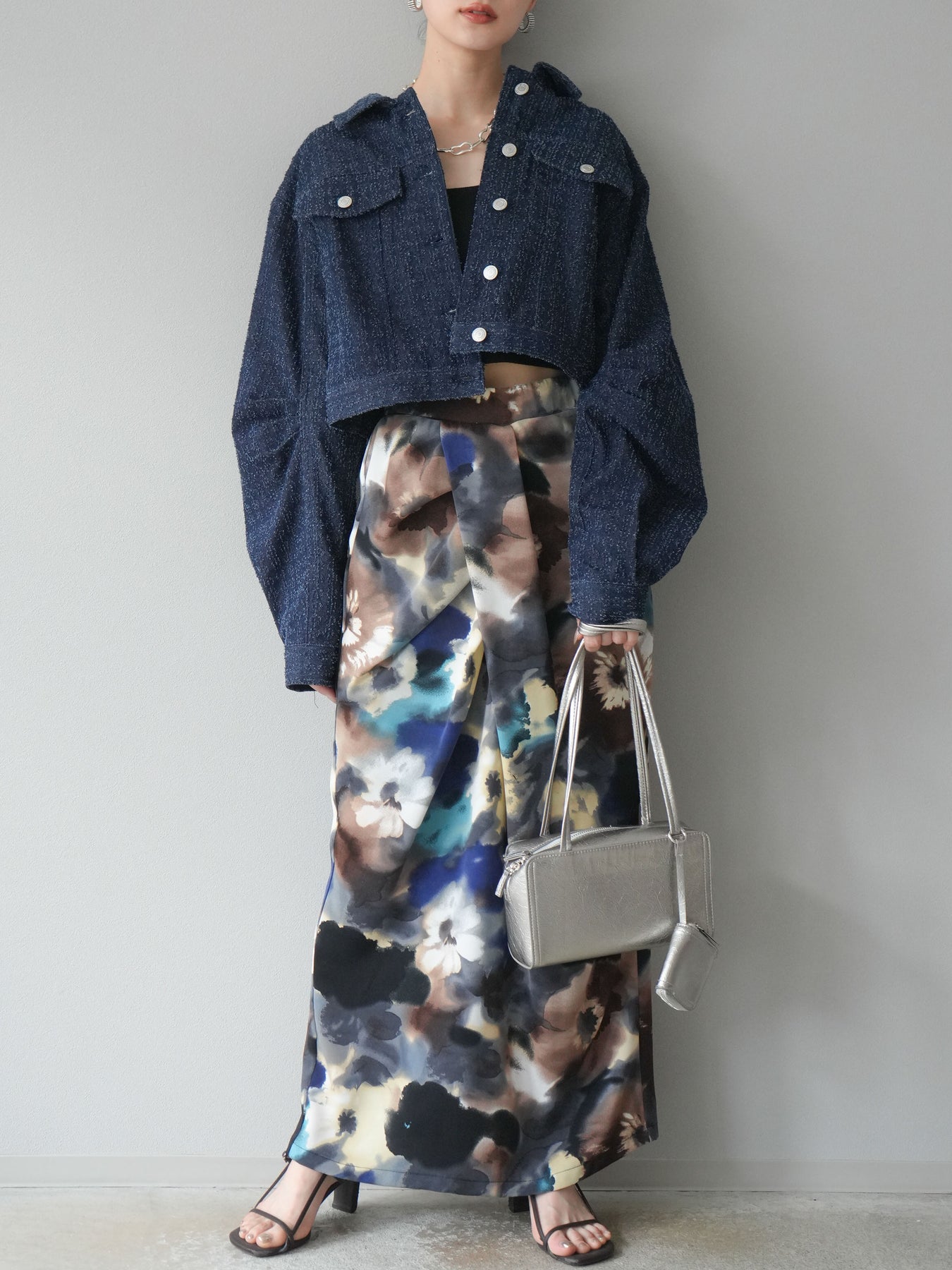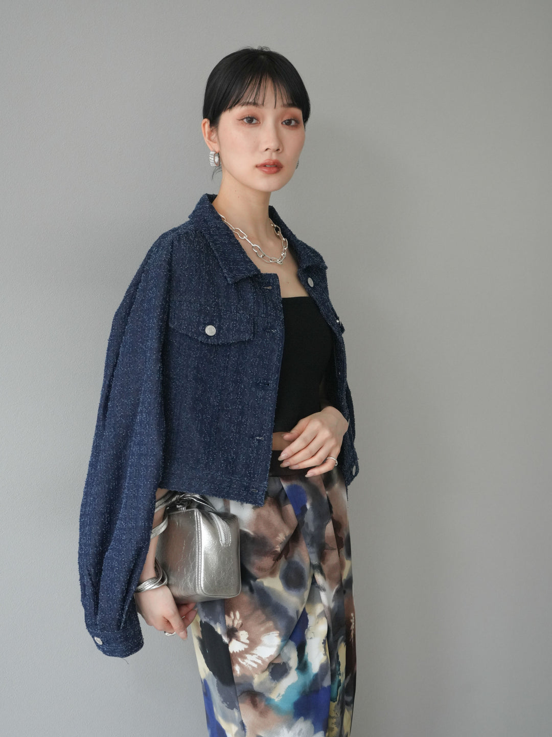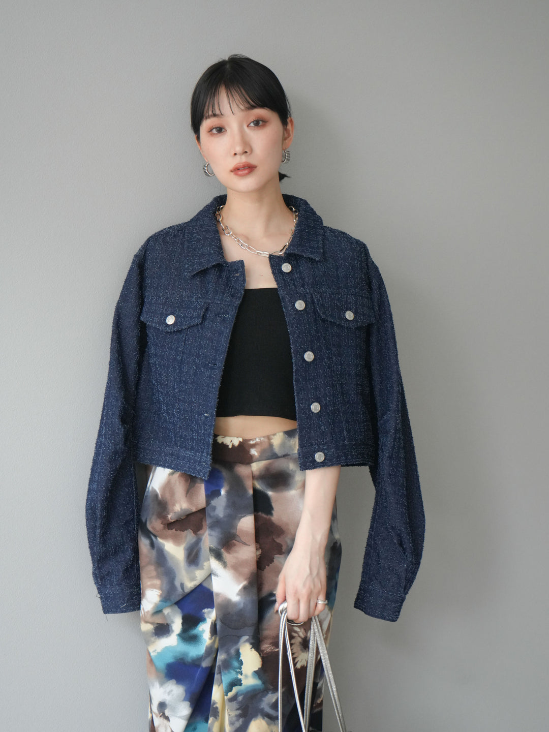 ナチュラルな風合いが魅力のネップデニムを使用したショートジャケット。タックを施した立体感のあるスリーブが、程よいモード感を演出します。ショート丈でバランスが取りやすく、ワイドパンツやスカートとも好相性。フロントのメタルボタンがアクセントになり、カジュアルながらも洗練された印象に仕上げた一着です。 ※ボトムス、キャミソール(インナー)以外の商品は一律でインナーは付属していません