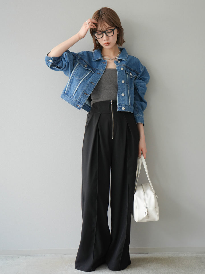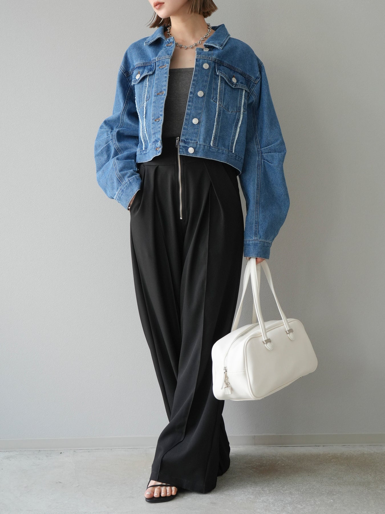 トレンドのショート丈にタックとフリンジを加えた、こだわりのデザインデニムジャケット。ウエストまわりがすっきり見えるコンパクトなシルエットで、ワイドパンツやボリュームスカートとも好相性。さっと羽織るだけでこなれ感を演出できる優秀アイテムです。季節の変わり目にぴったりな、カジュアルスタイルのアクセントとして活躍。 ※ボトムス、キャミソール(インナー)以外の商品は一律でインナーは付属していません