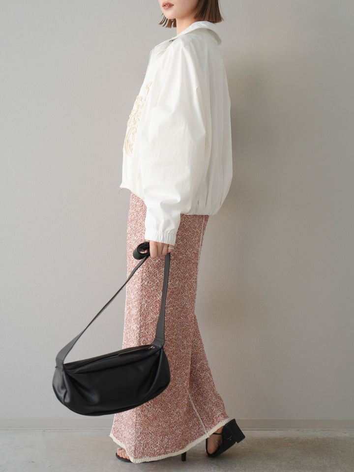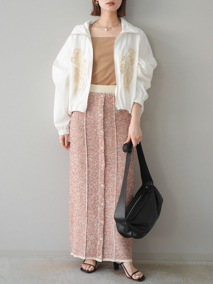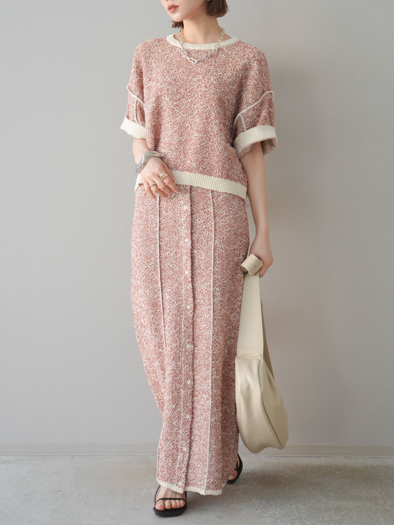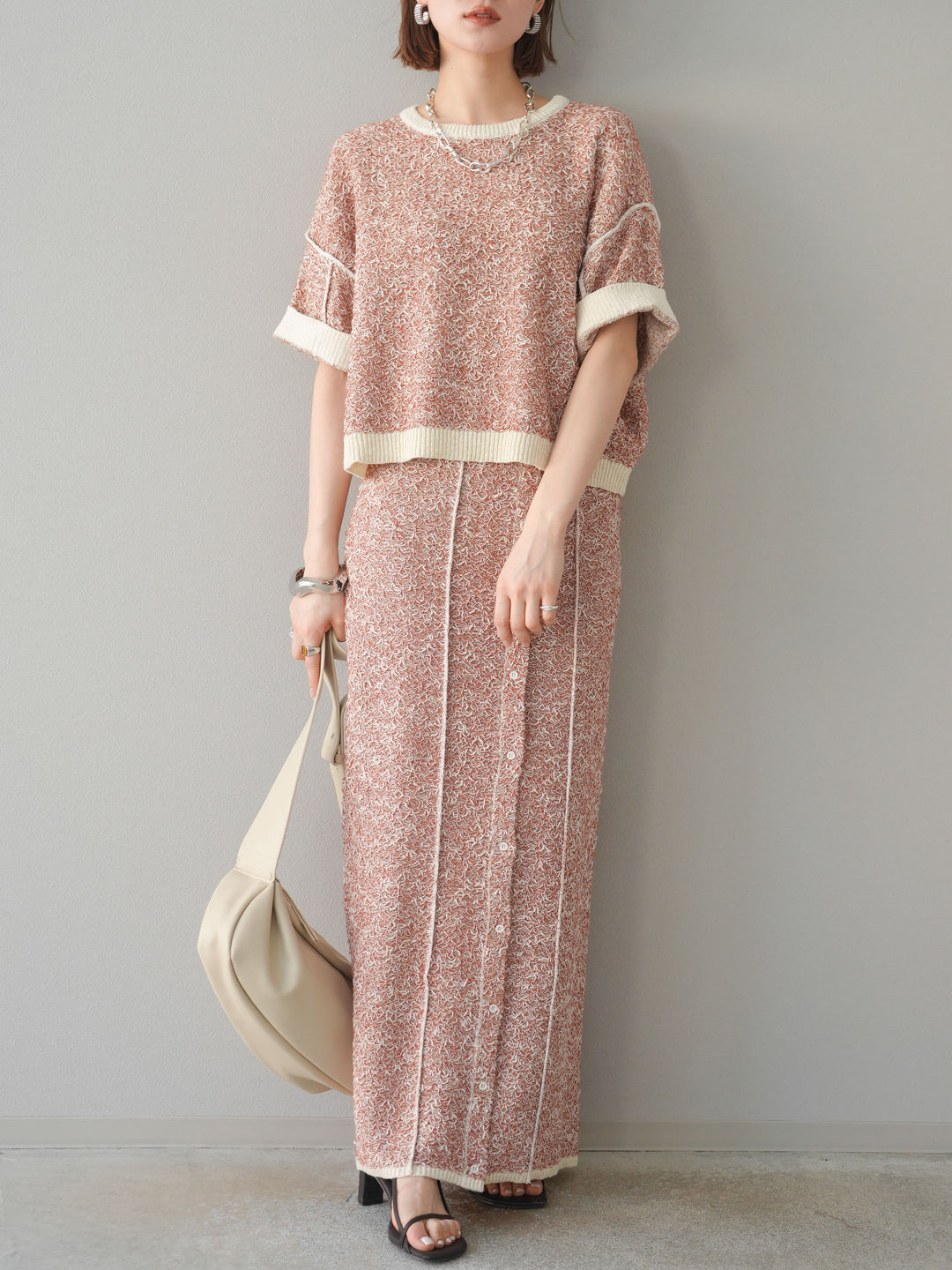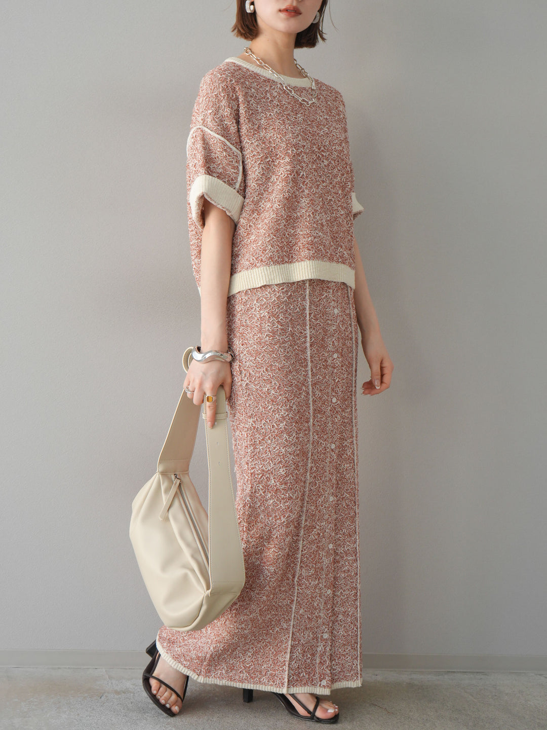トレンドのミックスヤーン素材を使用したタイトスカート。奥行きのある編地が魅力的で、シンプルながらも存在感のある一枚です。すっきりとしたIラインシルエットが、女性らしい印象を演出。フロントのボタンディテールがアクセントになり、カジュアルにもきれいめにもマッチします。同素材のトップスとセットアップでの着こなしもおすすめ。 ※ボトムス、キャミソール(インナー)以外の商品は一律でインナーは付属していません。
