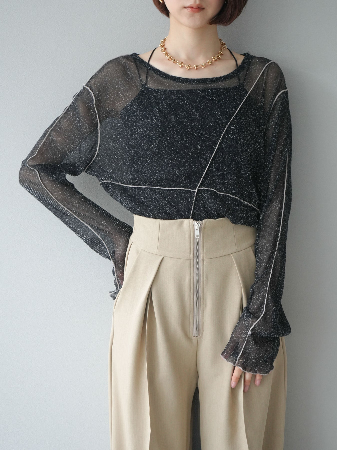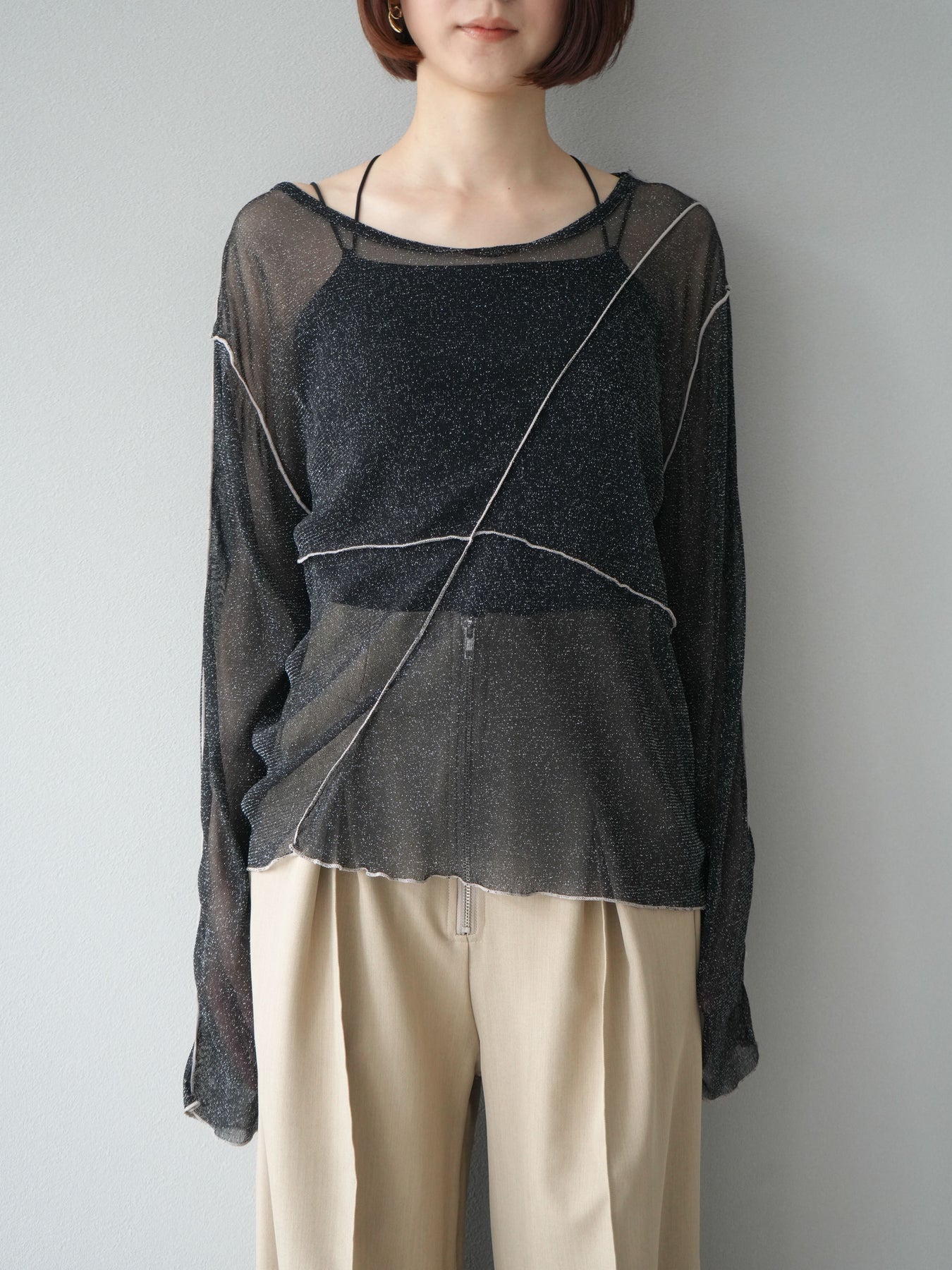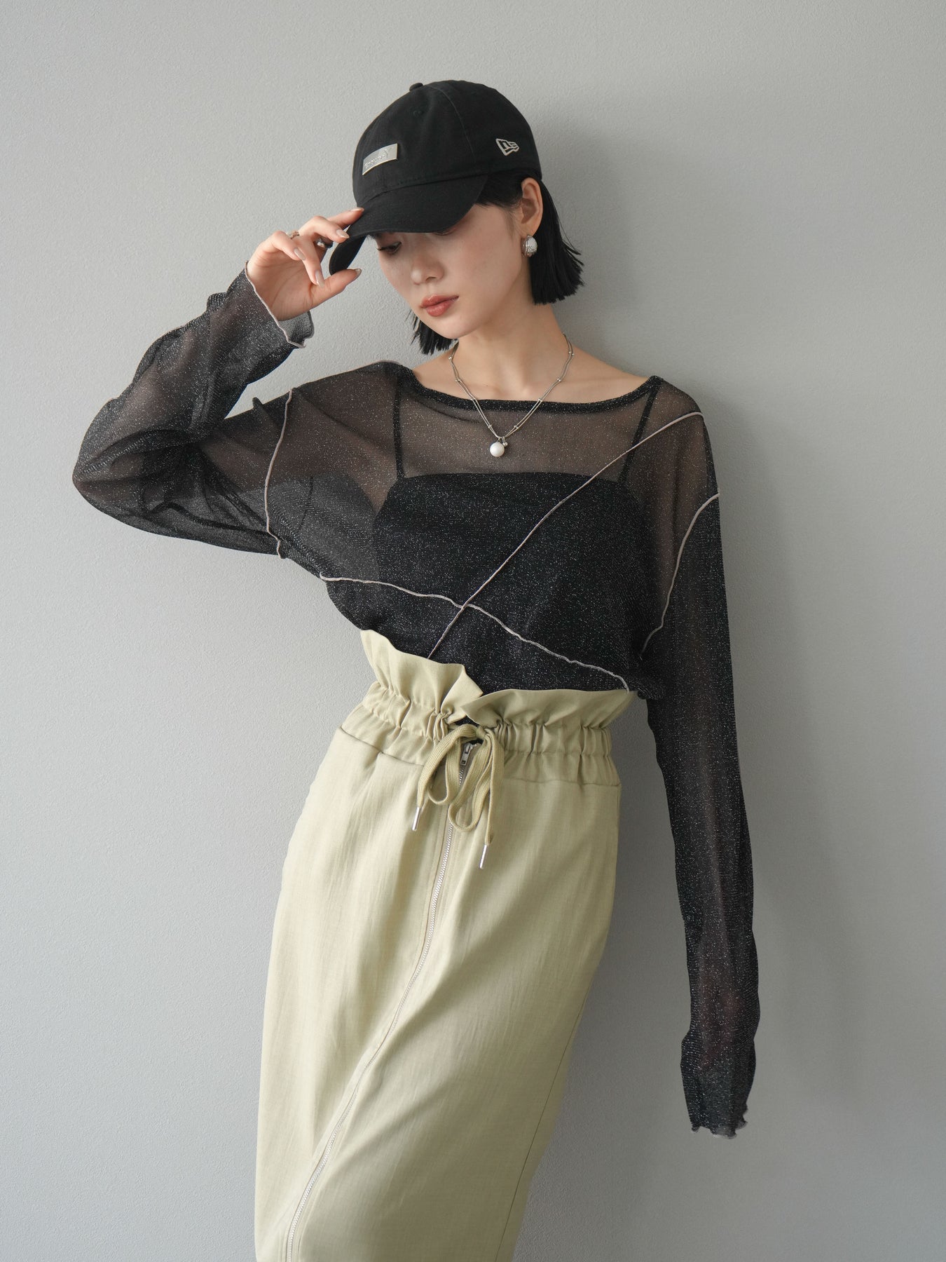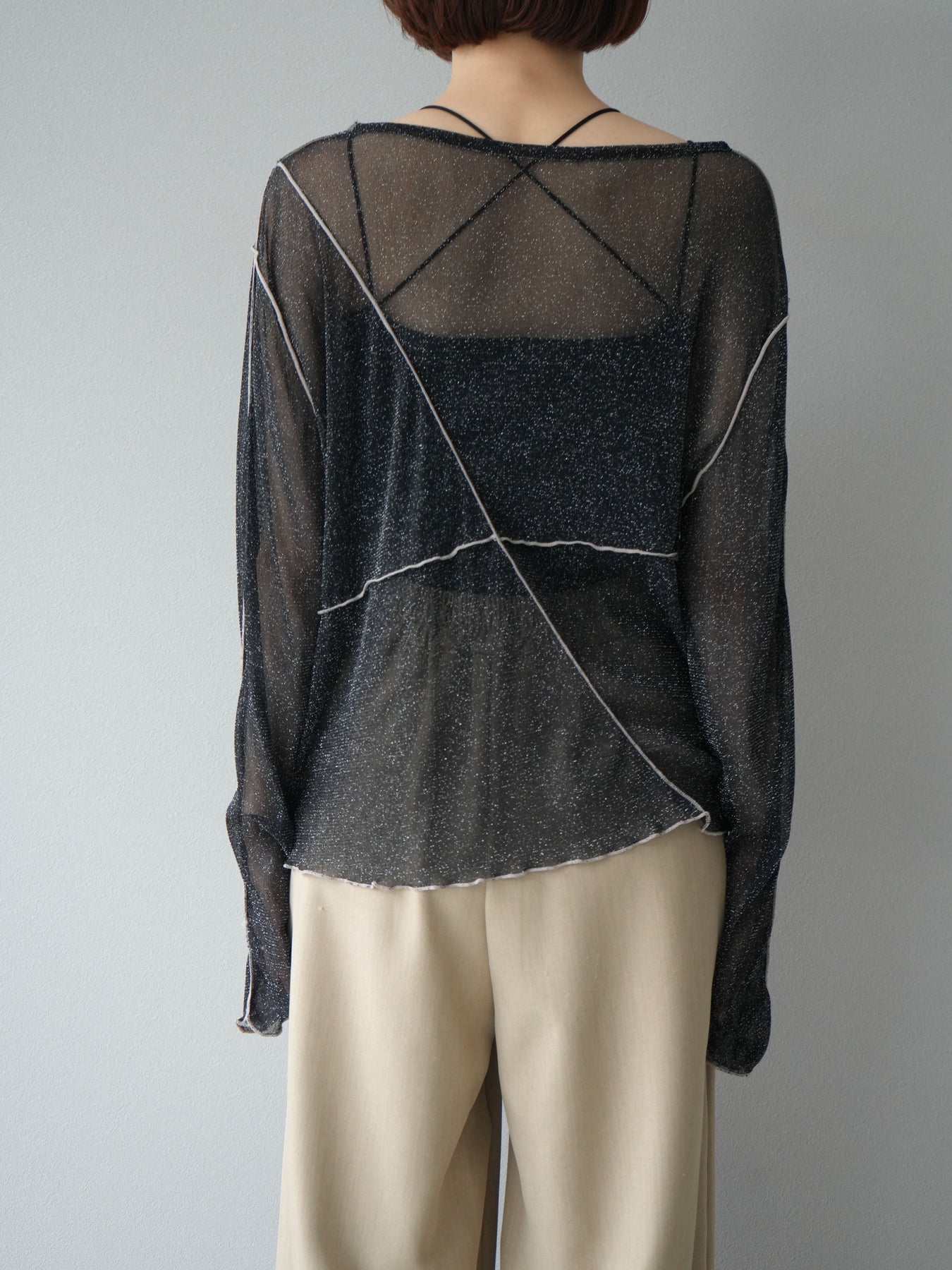 繊細なラメ感が目を惹く、トレンドライクなシアープルオーバー。バイカラーメローのラインがアクセントになり、レイヤードスタイルにも映えるデザインです。柔らかく軽い着心地で、旬の透け感コーデが楽しめる一枚。インナーとの組み合わせ次第で表情が変わり、デイリーから特別なシーンまで幅広く活躍します。 ※ボトムス、キャミソール(インナー)以外の商品は一律でインナーは付属していません
