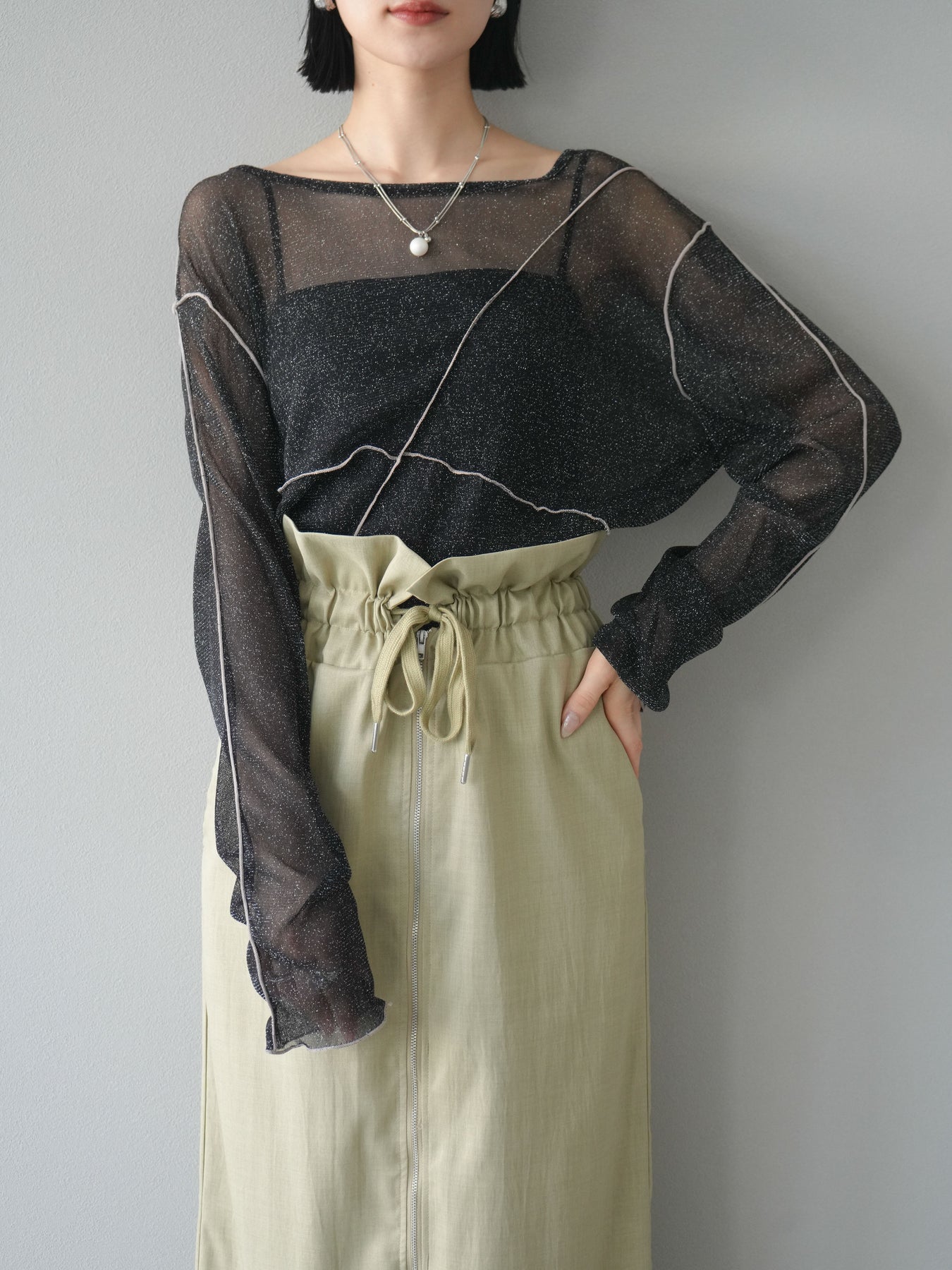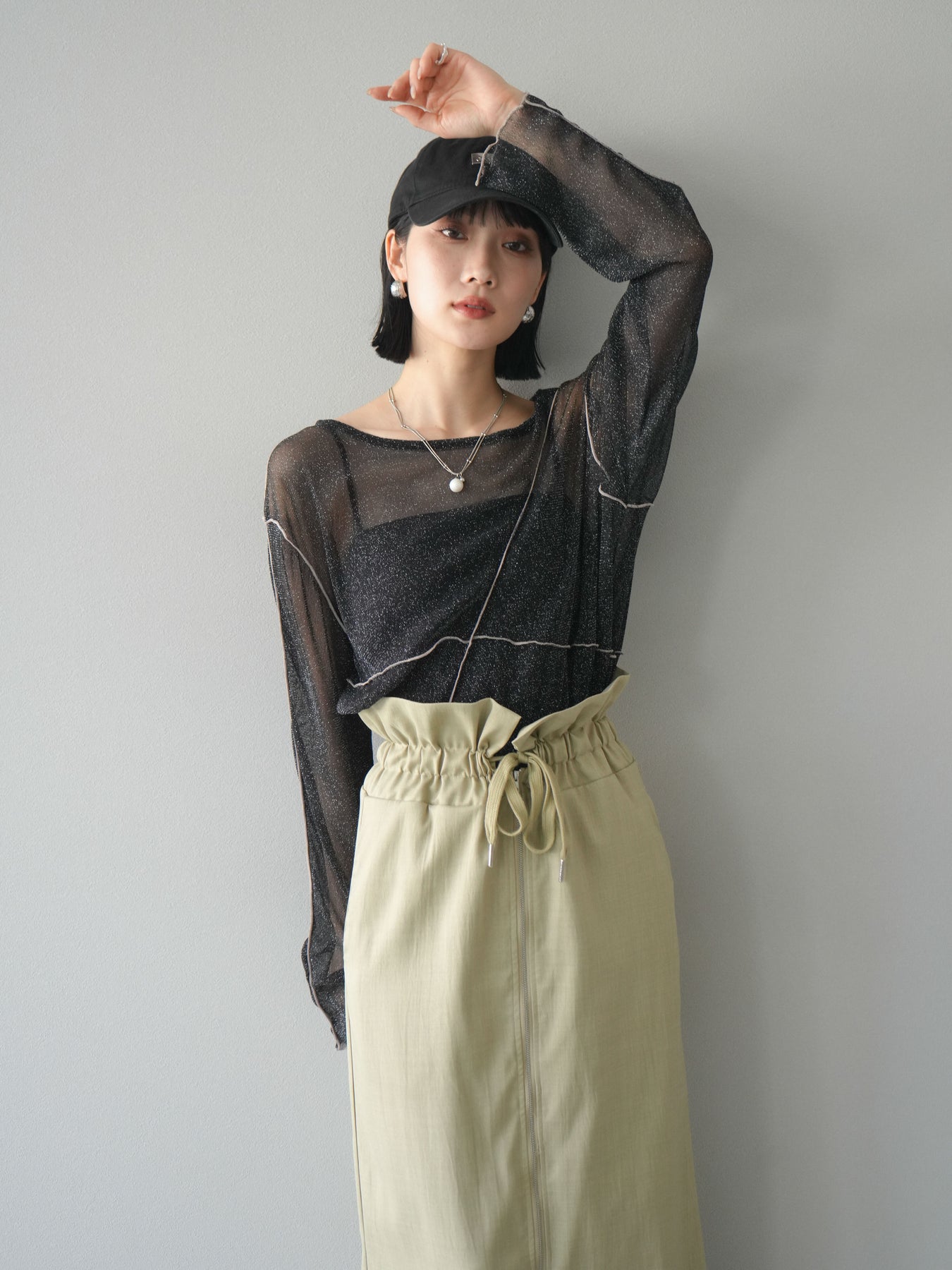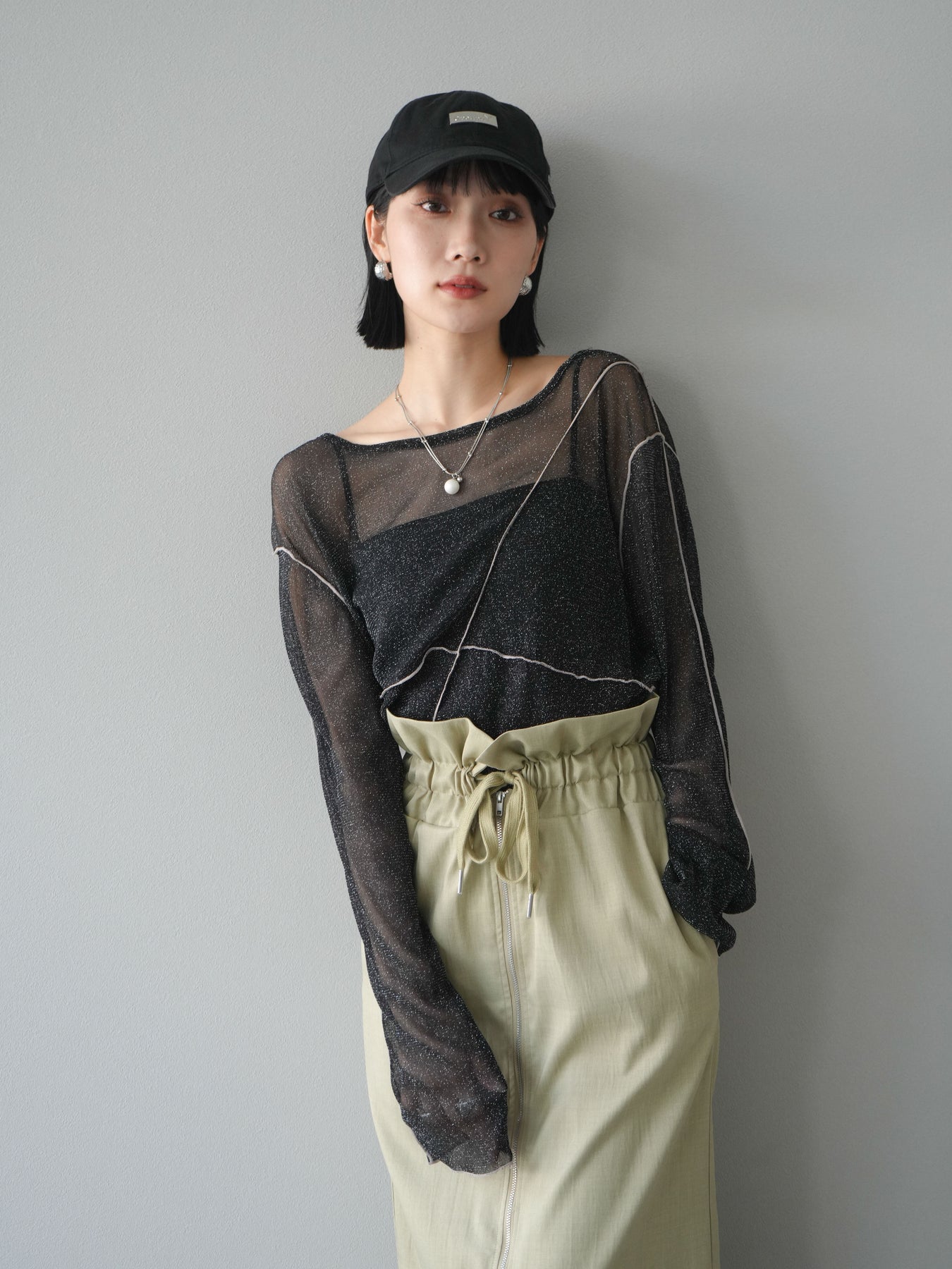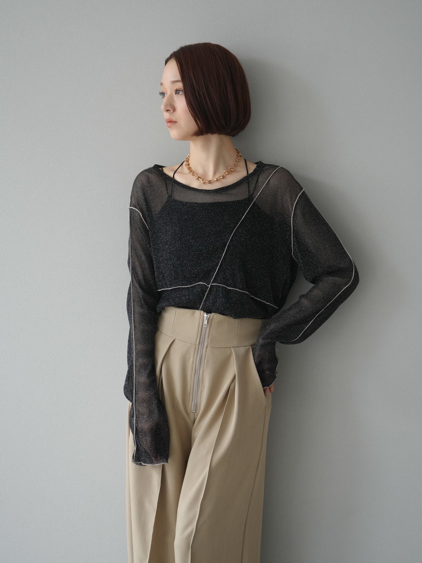 繊細なラメ感が目を惹く、トレンドライクなシアープルオーバー。バイカラーメローのラインがアクセントになり、レイヤードスタイルにも映えるデザインです。柔らかく軽い着心地で、旬の透け感コーデが楽しめる一枚。インナーとの組み合わせ次第で表情が変わり、デイリーから特別なシーンまで幅広く活躍します。 ※ボトムス、キャミソール(インナー)以外の商品は一律でインナーは付属していません
