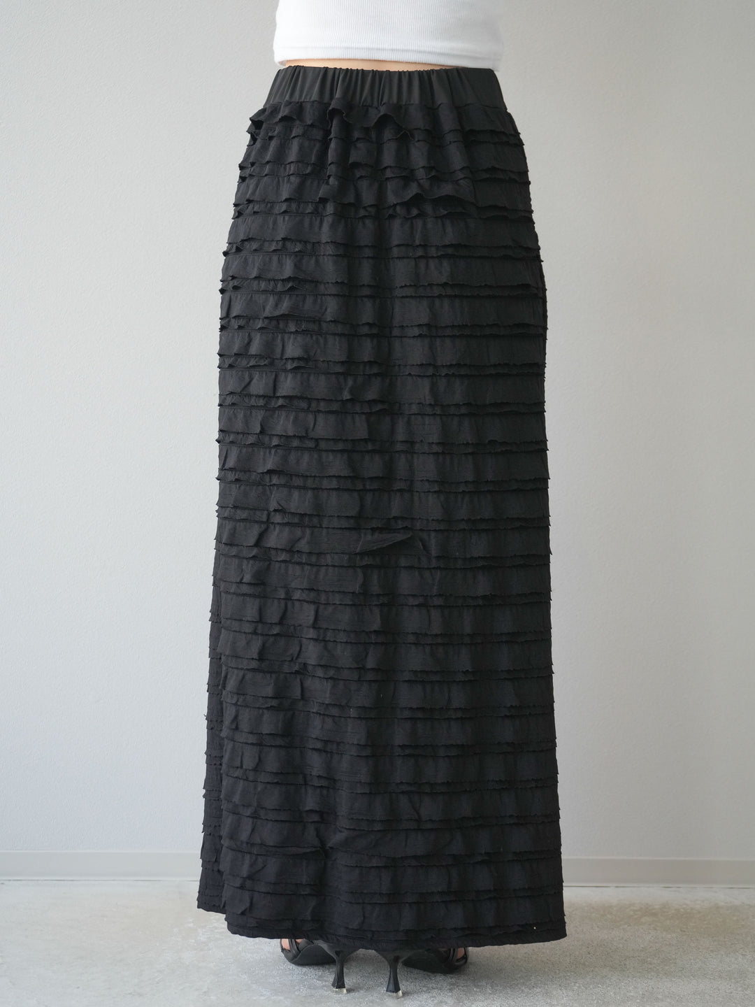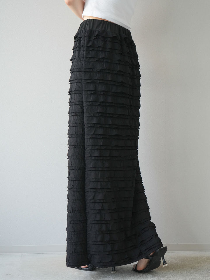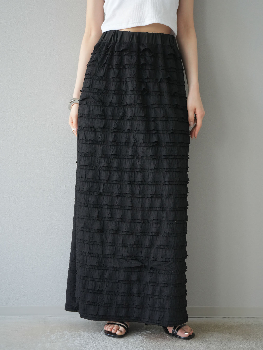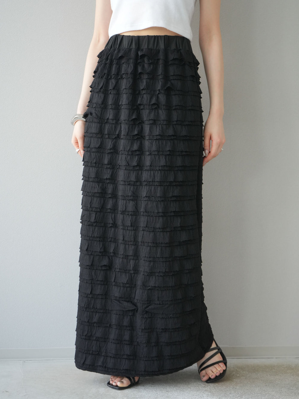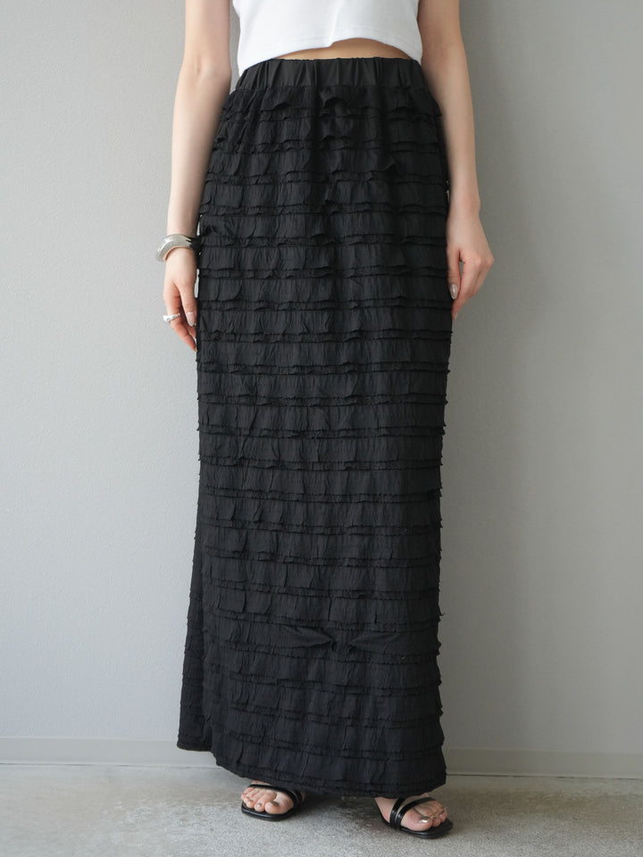 立体感のあるカットフリルが目を惹く、華やかなロングスカート。動くたびに揺れる表情豊かな素材感で、シンプルなトップスと合わせても存在感抜群。ウエストはゴム仕様で、ラクな履き心地も嬉しいポイント。カジュアルからきれいめスタイルまで、幅広いコーディネートにマッチします。 ※ボトムス、キャミソール(インナー)以外の商品は一律でインナーは付属していません