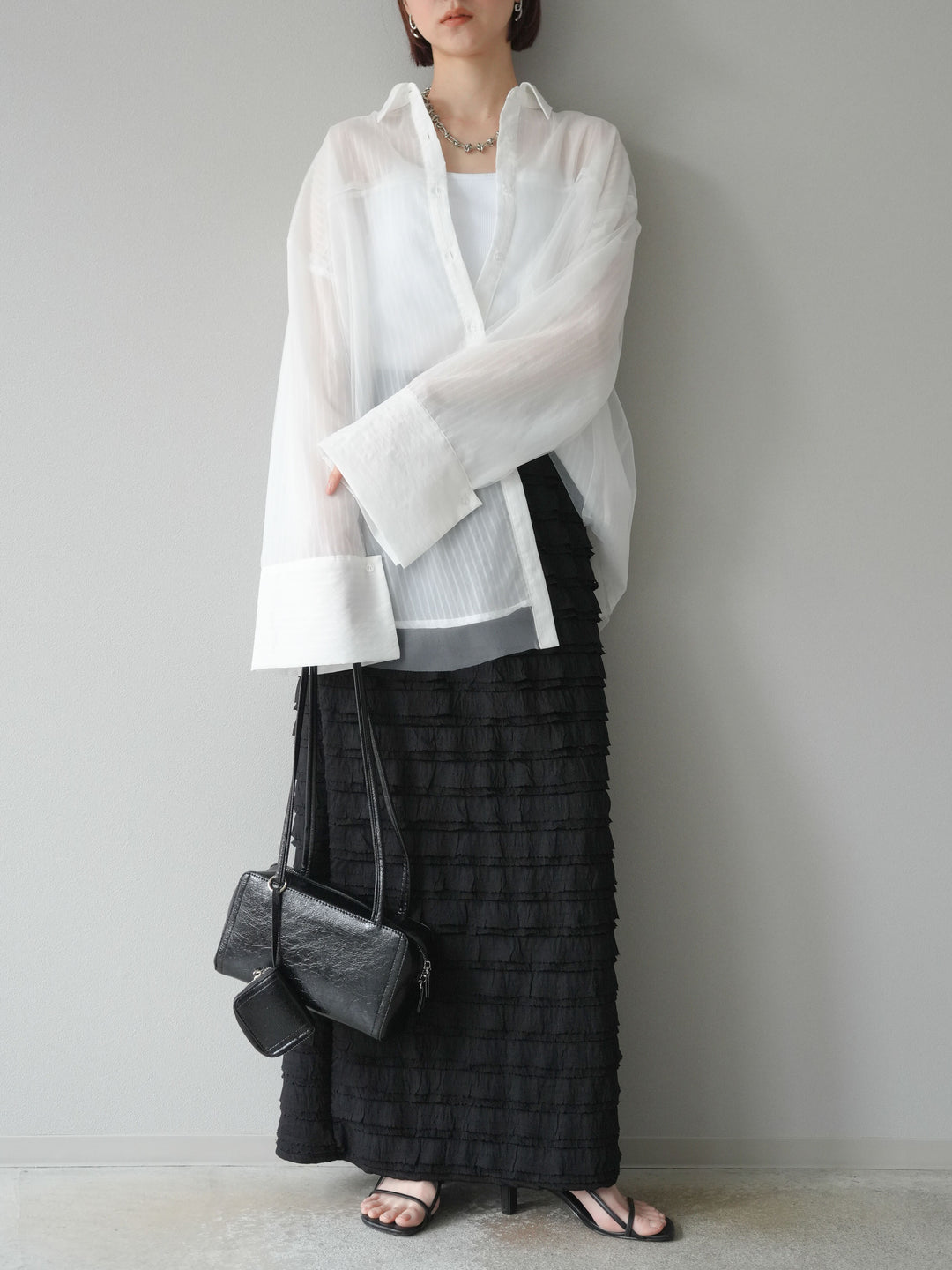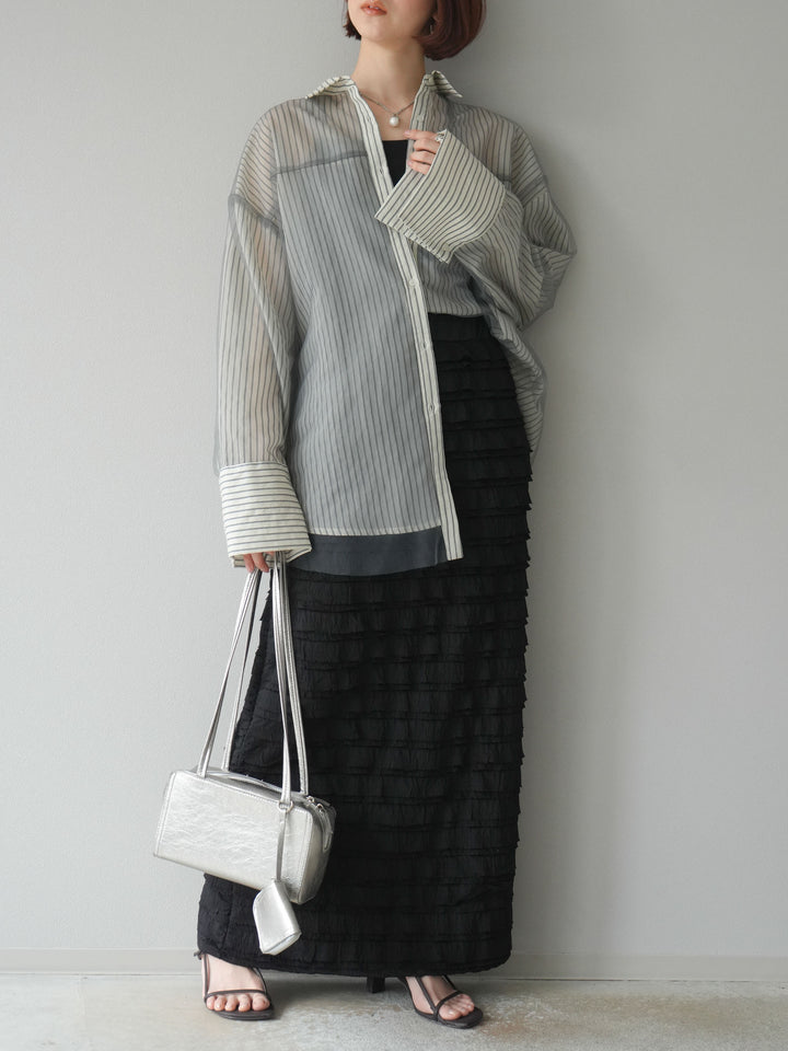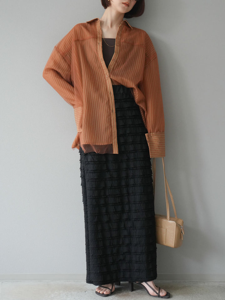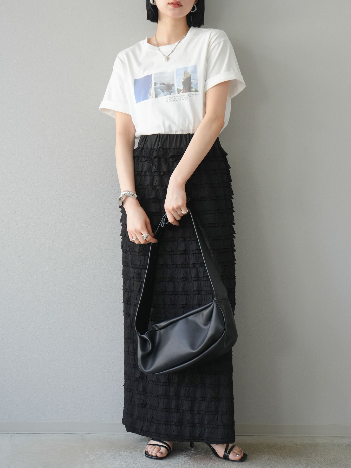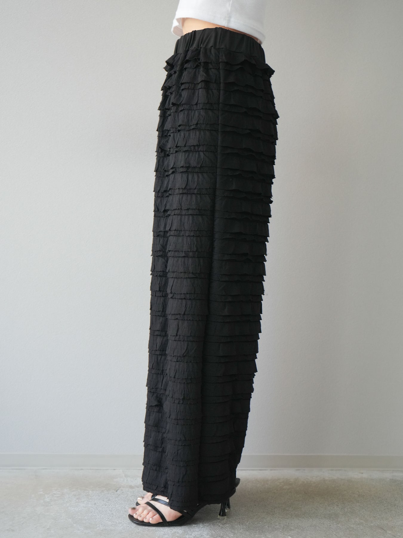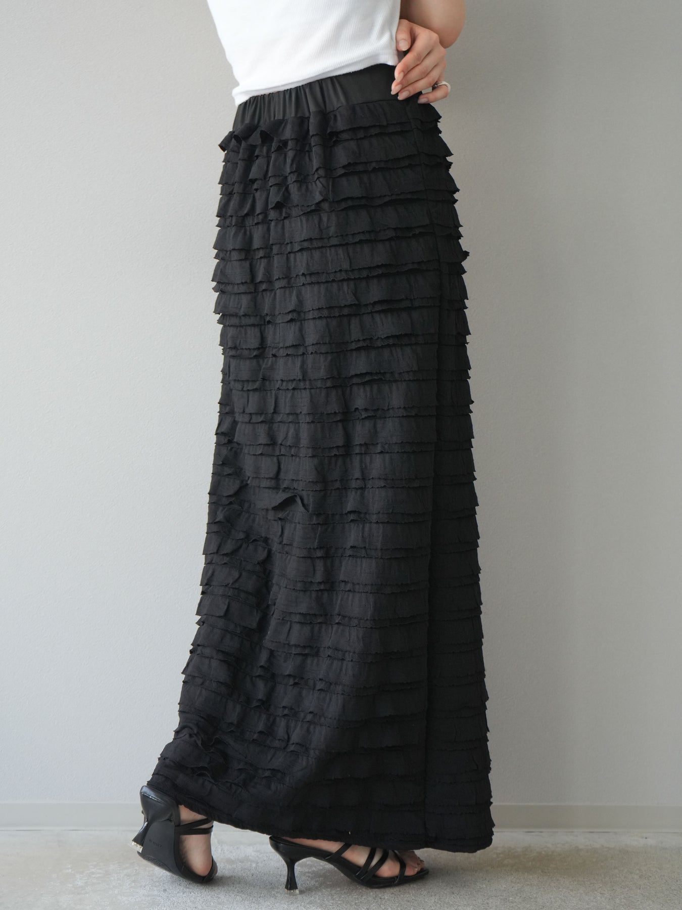 立体感のあるカットフリルが目を惹く、華やかなロングスカート。動くたびに揺れる表情豊かな素材感で、シンプルなトップスと合わせても存在感抜群。ウエストはゴム仕様で、ラクな履き心地も嬉しいポイント。カジュアルからきれいめスタイルまで、幅広いコーディネートにマッチします。 ※ボトムス、キャミソール(インナー)以外の商品は一律でインナーは付属していません