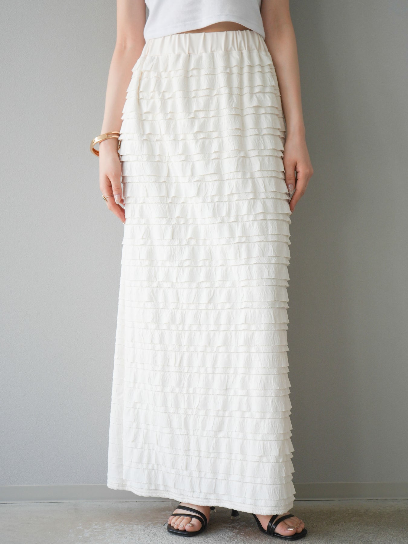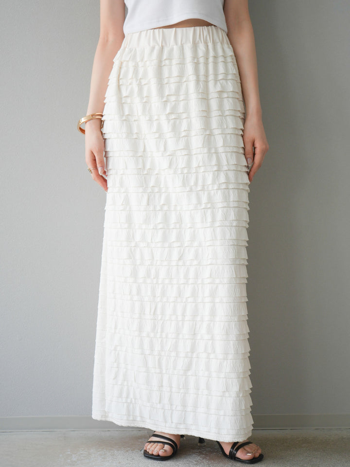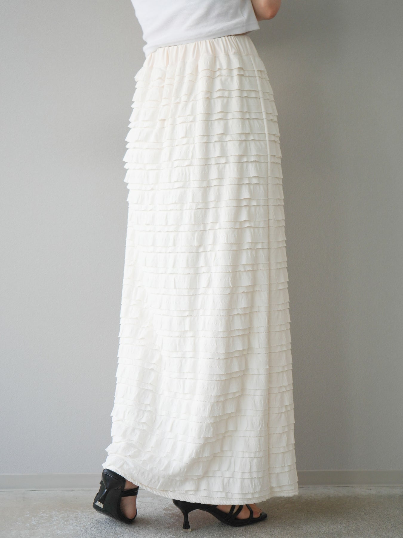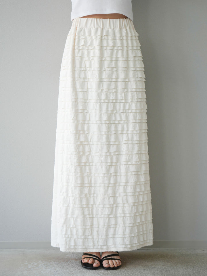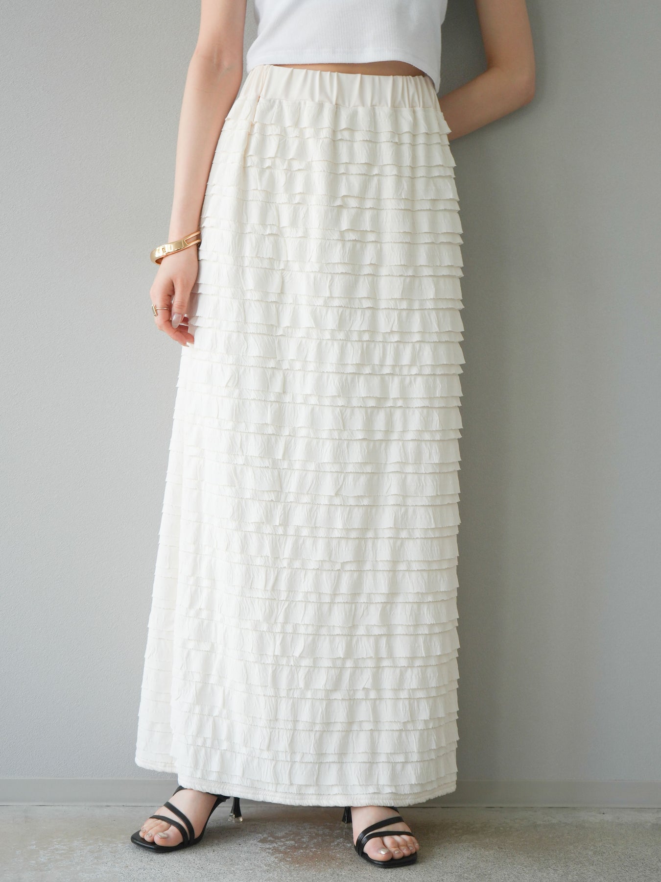 立体感のあるカットフリルが目を惹く、華やかなロングスカート。動くたびに揺れる表情豊かな素材感で、シンプルなトップスと合わせても存在感抜群。ウエストはゴム仕様で、ラクな履き心地も嬉しいポイント。カジュアルからきれいめスタイルまで、幅広いコーディネートにマッチします。 ※ボトムス、キャミソール(インナー)以外の商品は一律でインナーは付属していません
