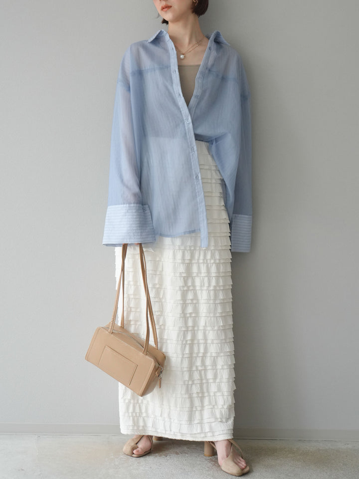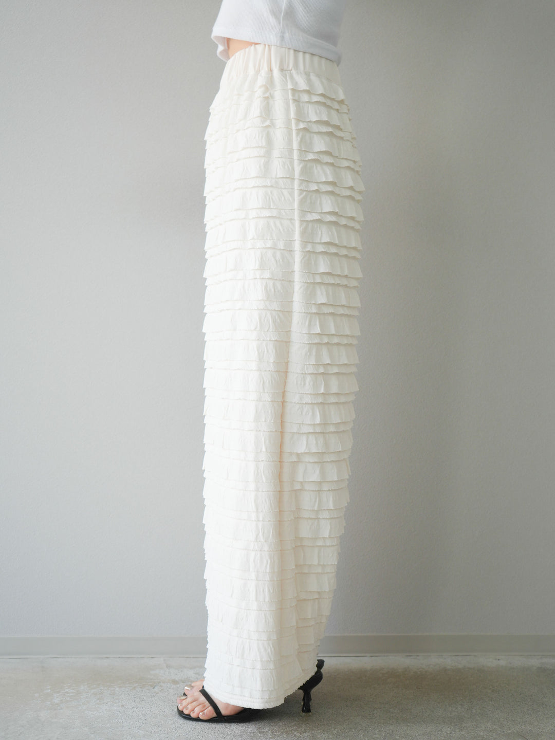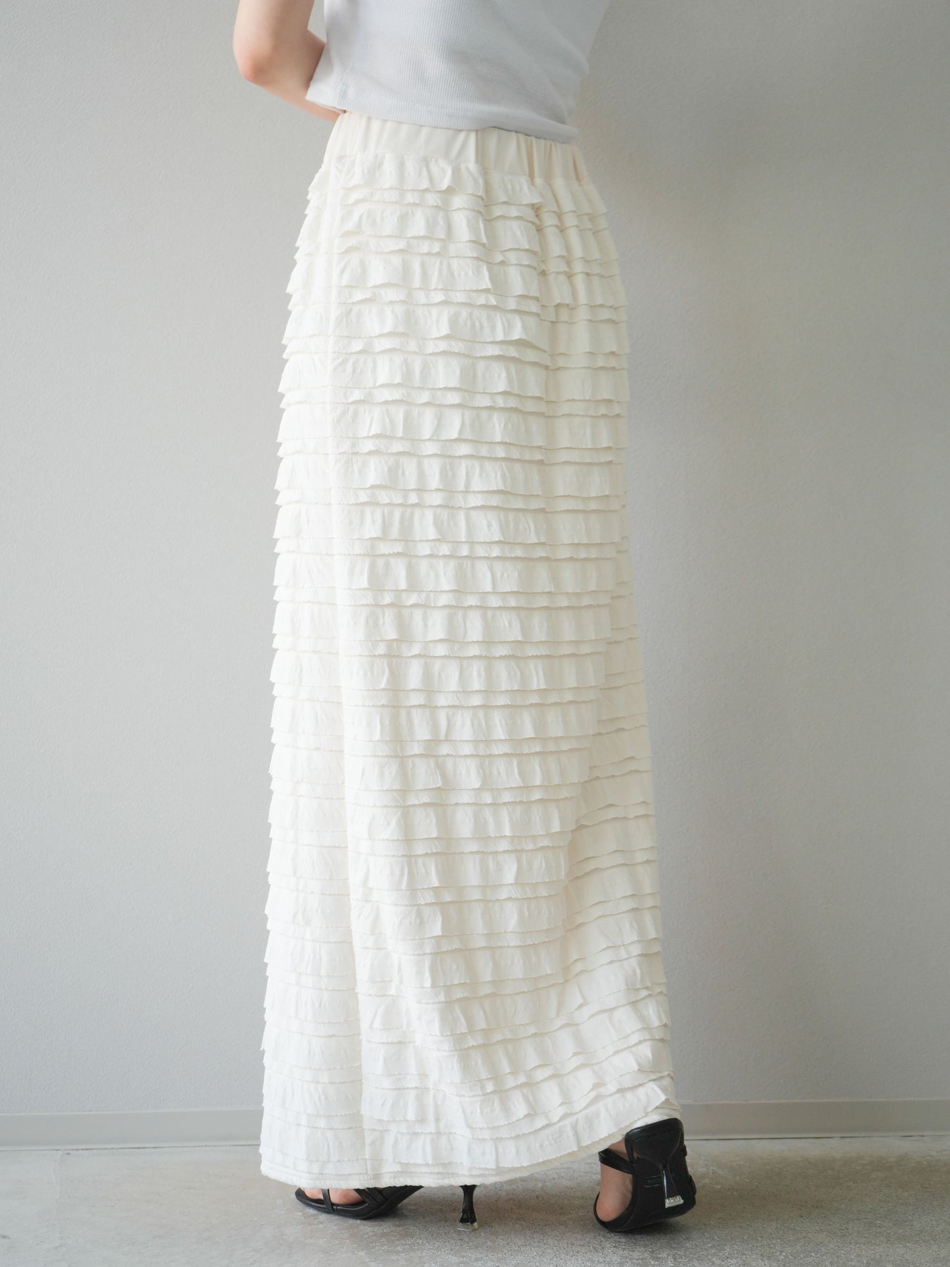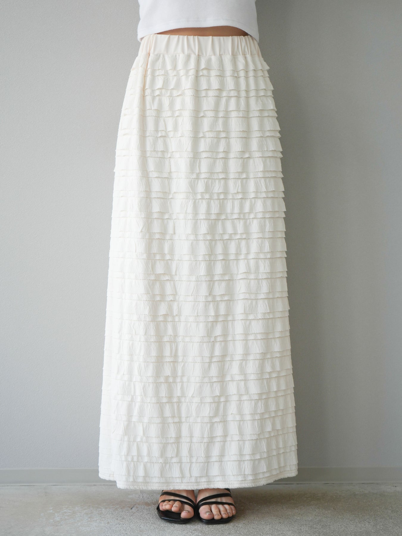 立体感のあるカットフリルが目を惹く、華やかなロングスカート。動くたびに揺れる表情豊かな素材感で、シンプルなトップスと合わせても存在感抜群。ウエストはゴム仕様で、ラクな履き心地も嬉しいポイント。カジュアルからきれいめスタイルまで、幅広いコーディネートにマッチします。 ※ボトムス、キャミソール(インナー)以外の商品は一律でインナーは付属していません