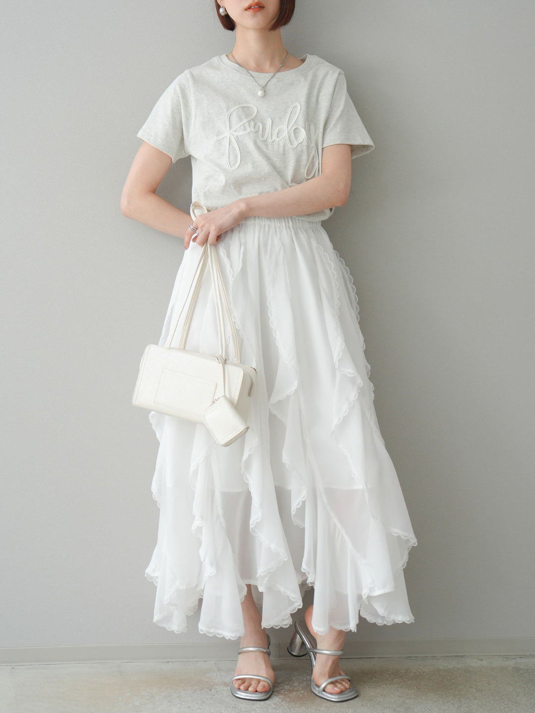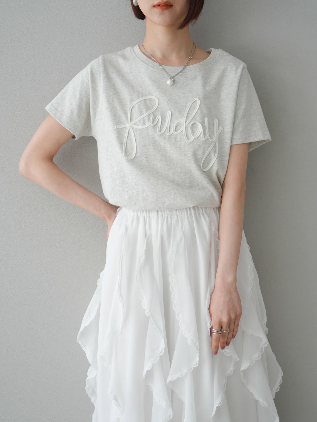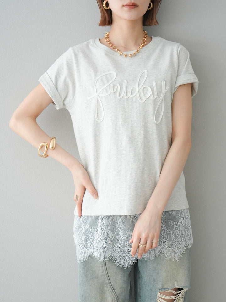立体感のあるコード刺繍ロゴが目を引くTシャツ。シンプルながらもデザイン性があり、コーデのアクセントに。程よいリラックスシルエットで、デイリー使いにぴったりの一枚。カジュアルからキレイめスタイルまで、幅広く着こなせる万能アイテムです。 ※ボトムス、キャミソール(インナー)以外の商品は一律でインナーは付属していません