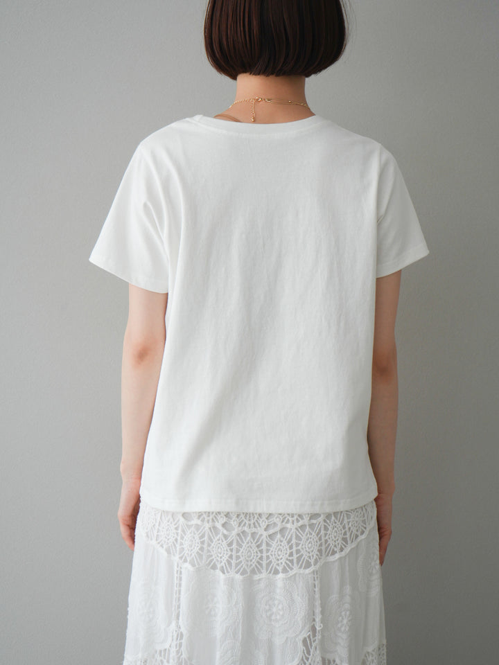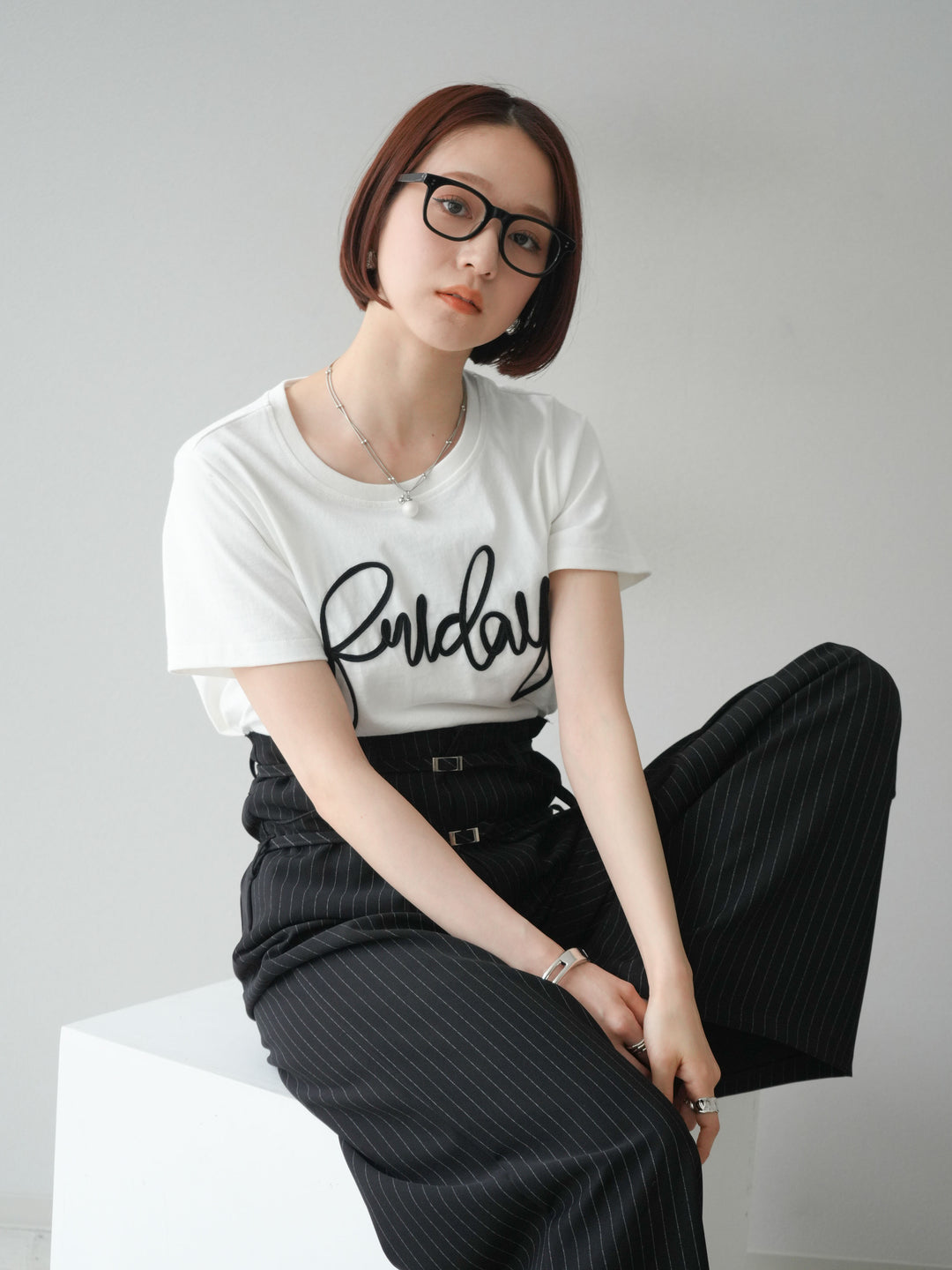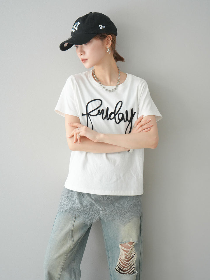 立体感のあるコード刺繍ロゴが目を引くTシャツ。シンプルながらもデザイン性があり、コーデのアクセントに。程よいリラックスシルエットで、デイリー使いにぴったりの一枚。カジュアルからキレイめスタイルまで、幅広く着こなせる万能アイテムです。 ※ボトムス、キャミソール(インナー)以外の商品は一律でインナーは付属していません