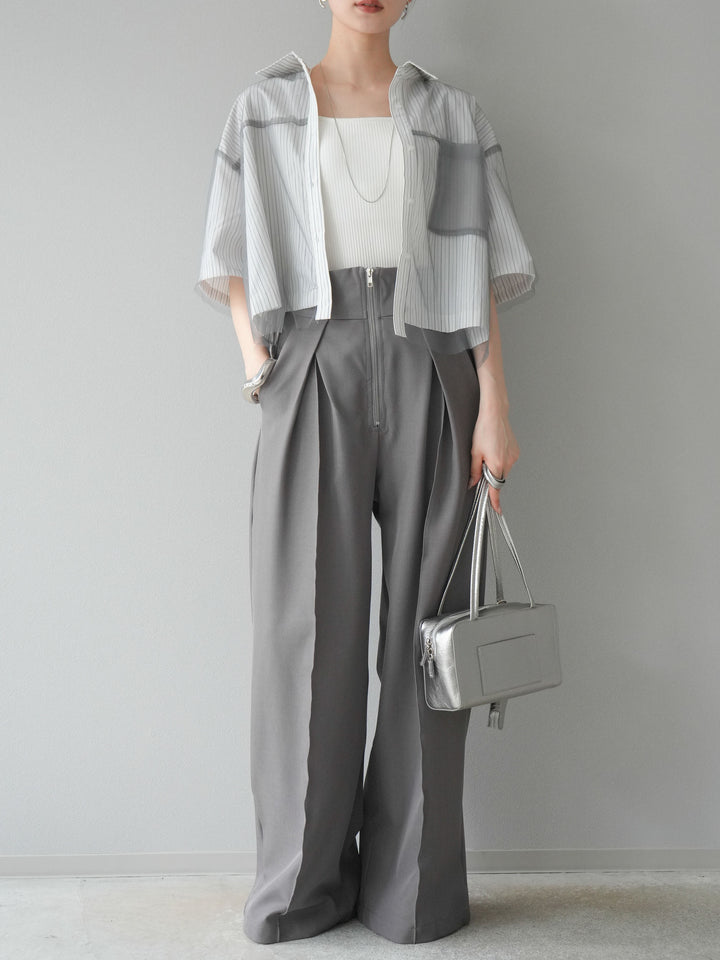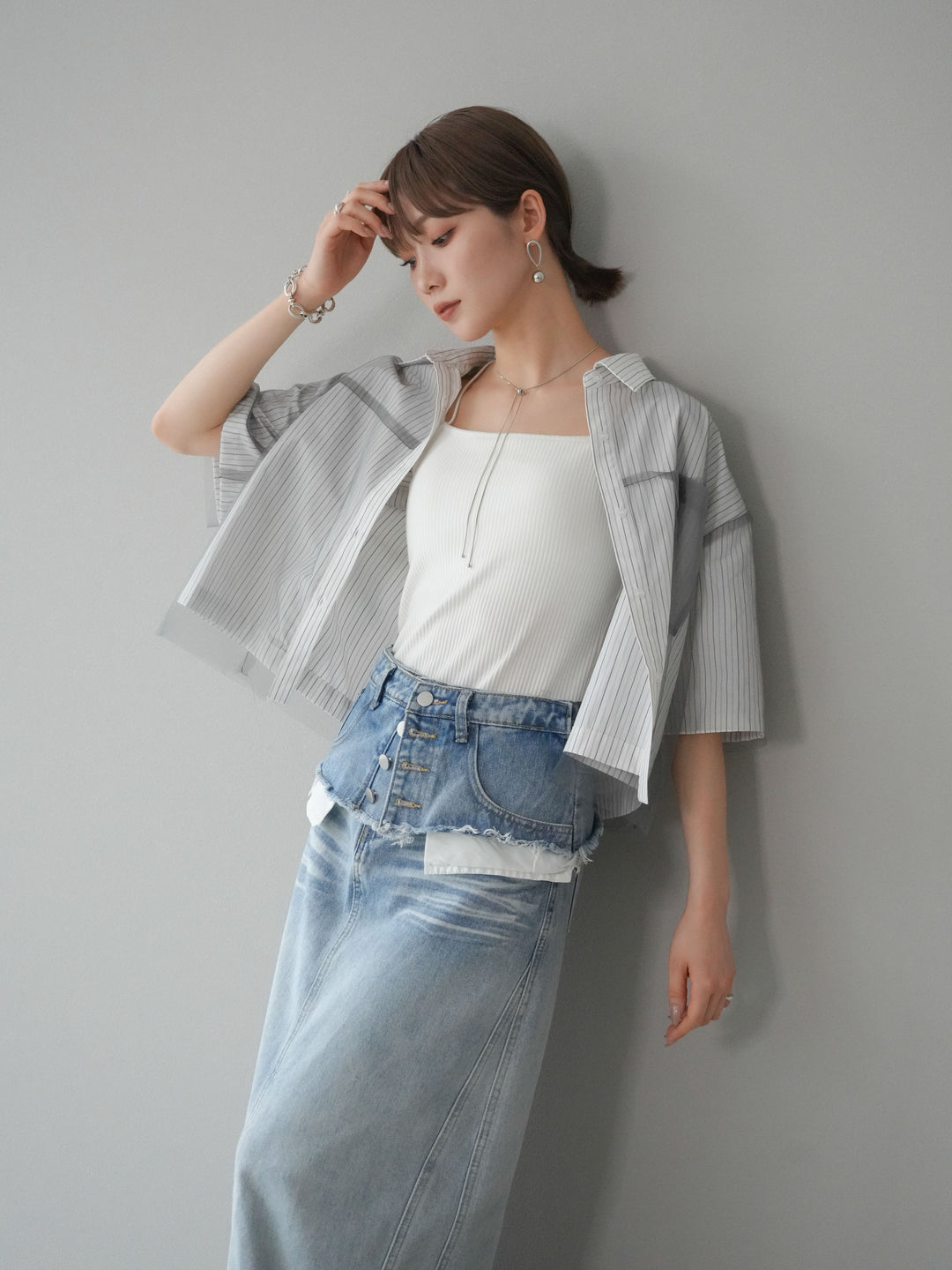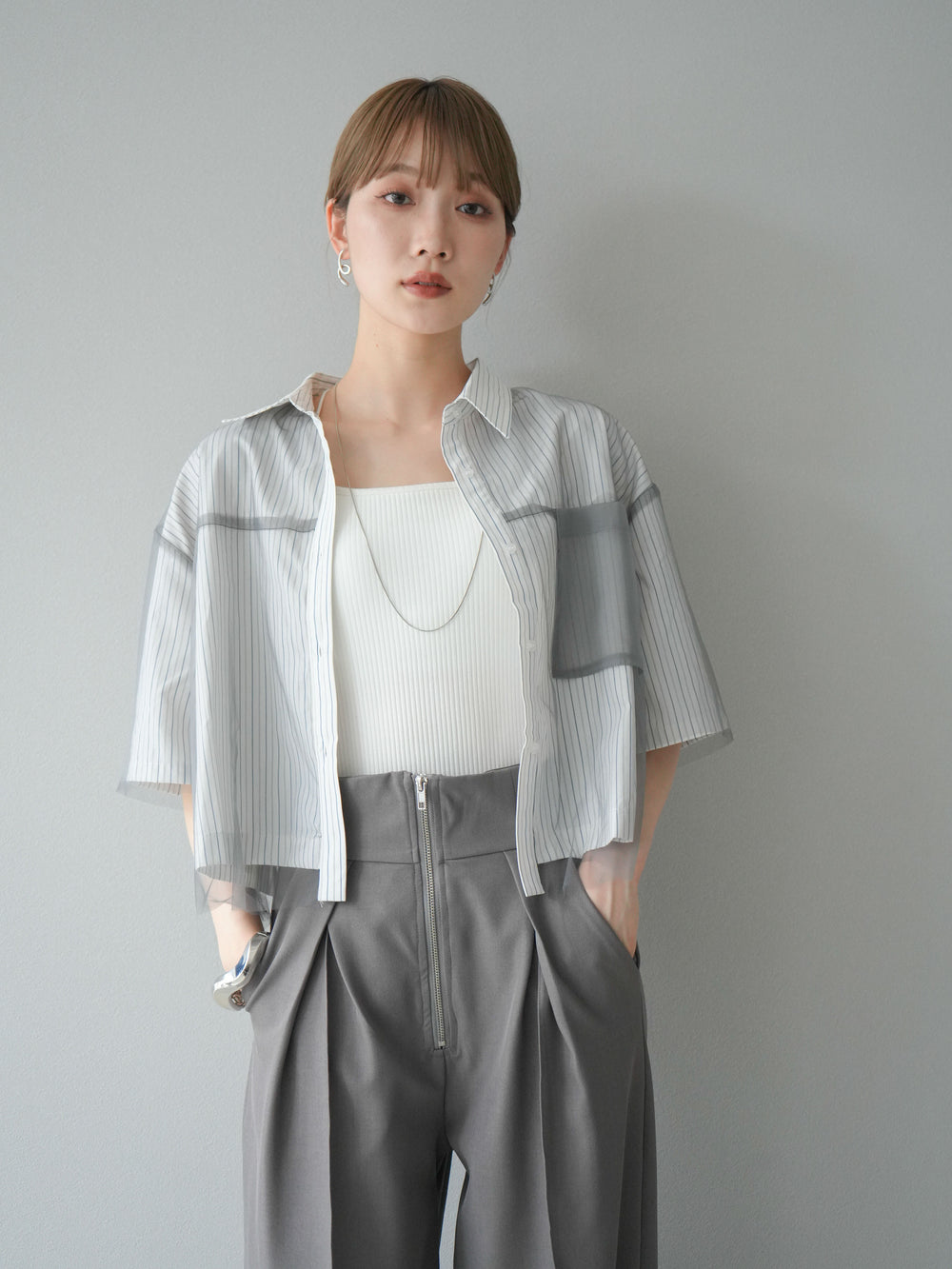 ストライプ柄にチュールを重ねた、今季注目のトレンド感たっぷりなシャツ。異素材をレイヤードすることで立体感が生まれ、シンプルながら印象的な一枚に。コンパクトな丈感とワイドな袖が、程よく抜け感を演出します。さらっと羽織るだけで、旬なスタイルが完成。 ※ボトムス、キャミソール(インナー)以外の商品は一律でインナーは付属していません