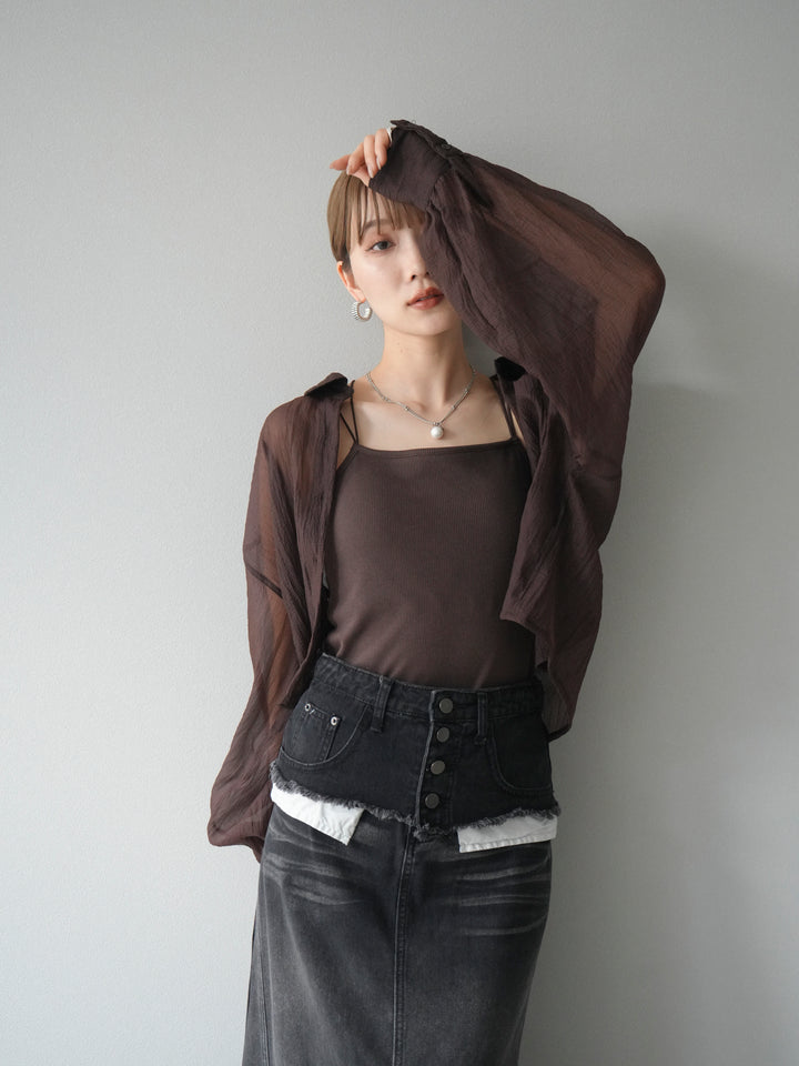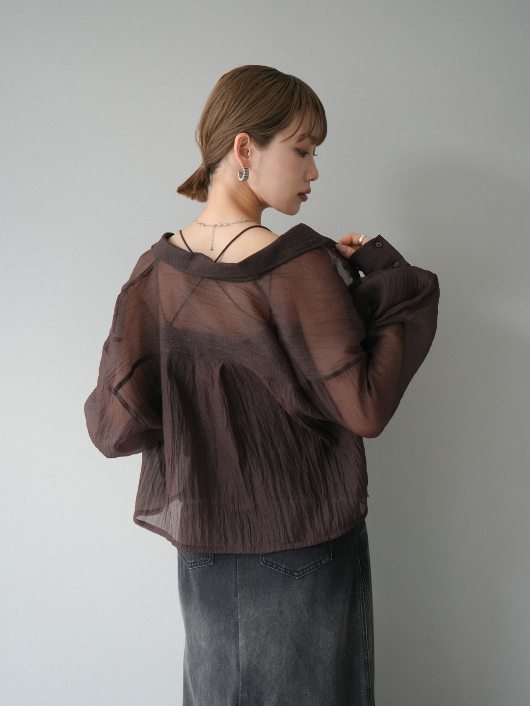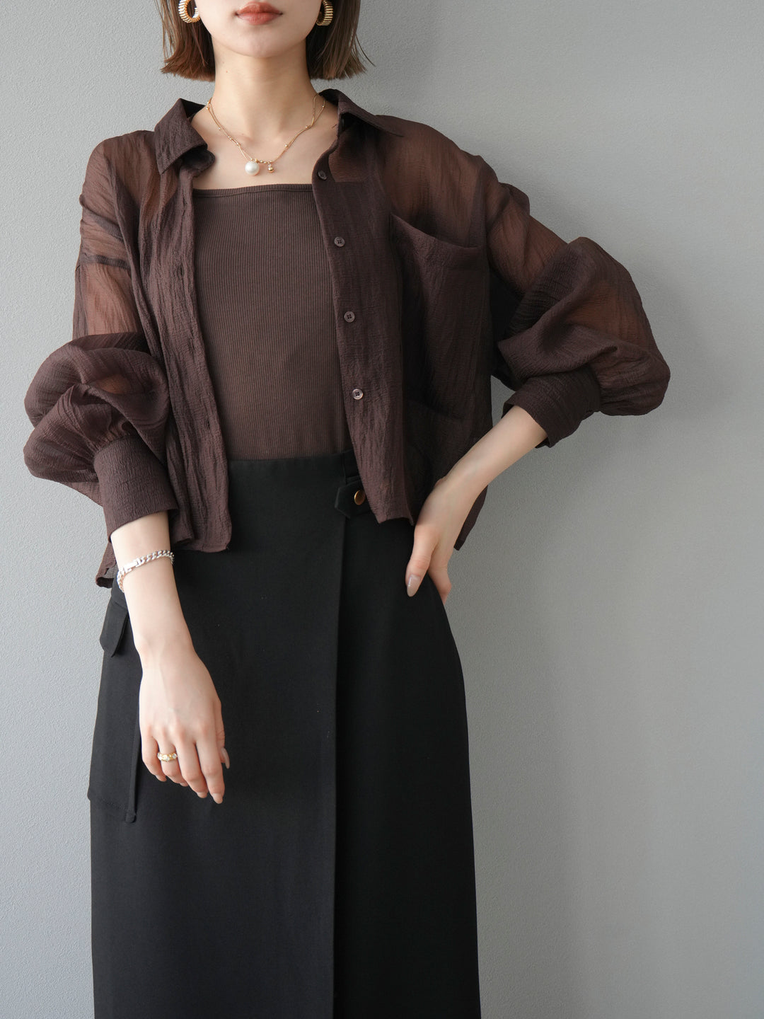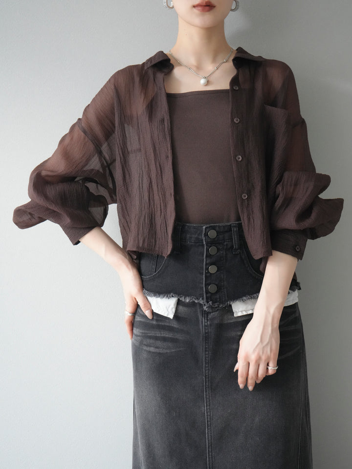 繊細なラメ感が上品にきらめくシアー素材のショートシャツ。軽やかな透け感が季節感を引き立て、トレンドムードを演出します。コンパクトな丈感がバランスよく、ハイウエストボトムとも相性抜群。袖口の長めカフスがさりげないアクセントに。羽織りとしても活躍する、着回し力の高い1枚です。 ※ボトムス、キャミソール(インナー)以外の商品は一律でインナーは付属していません