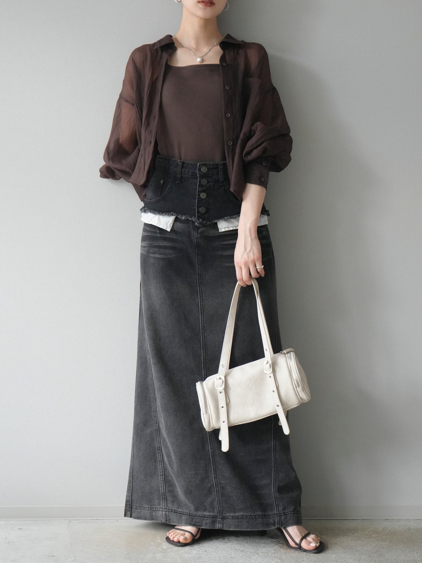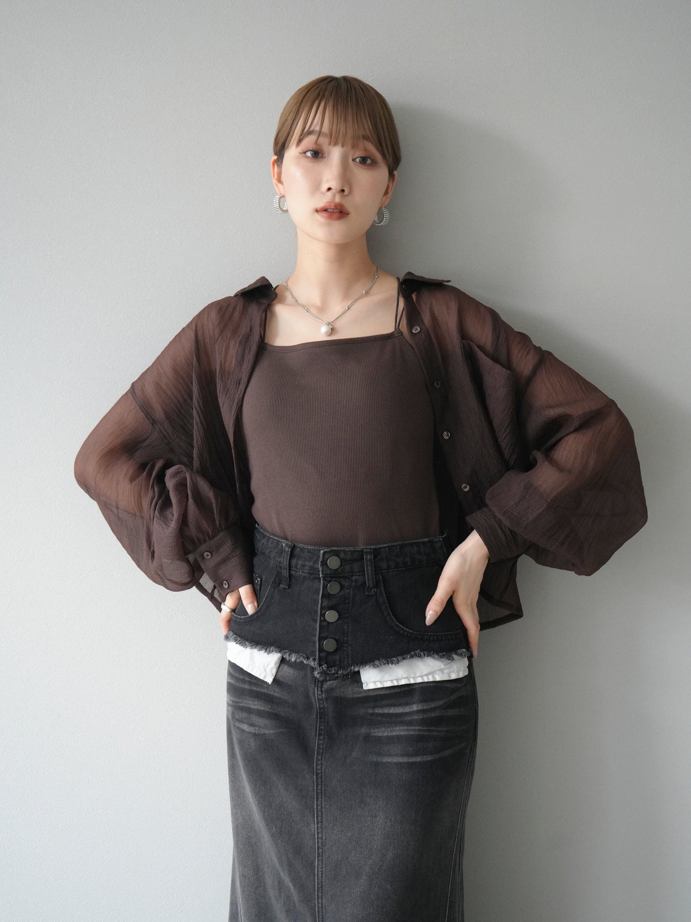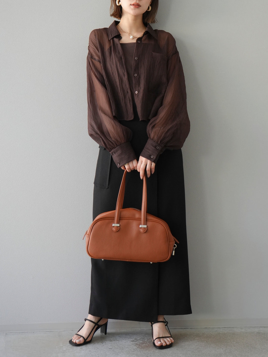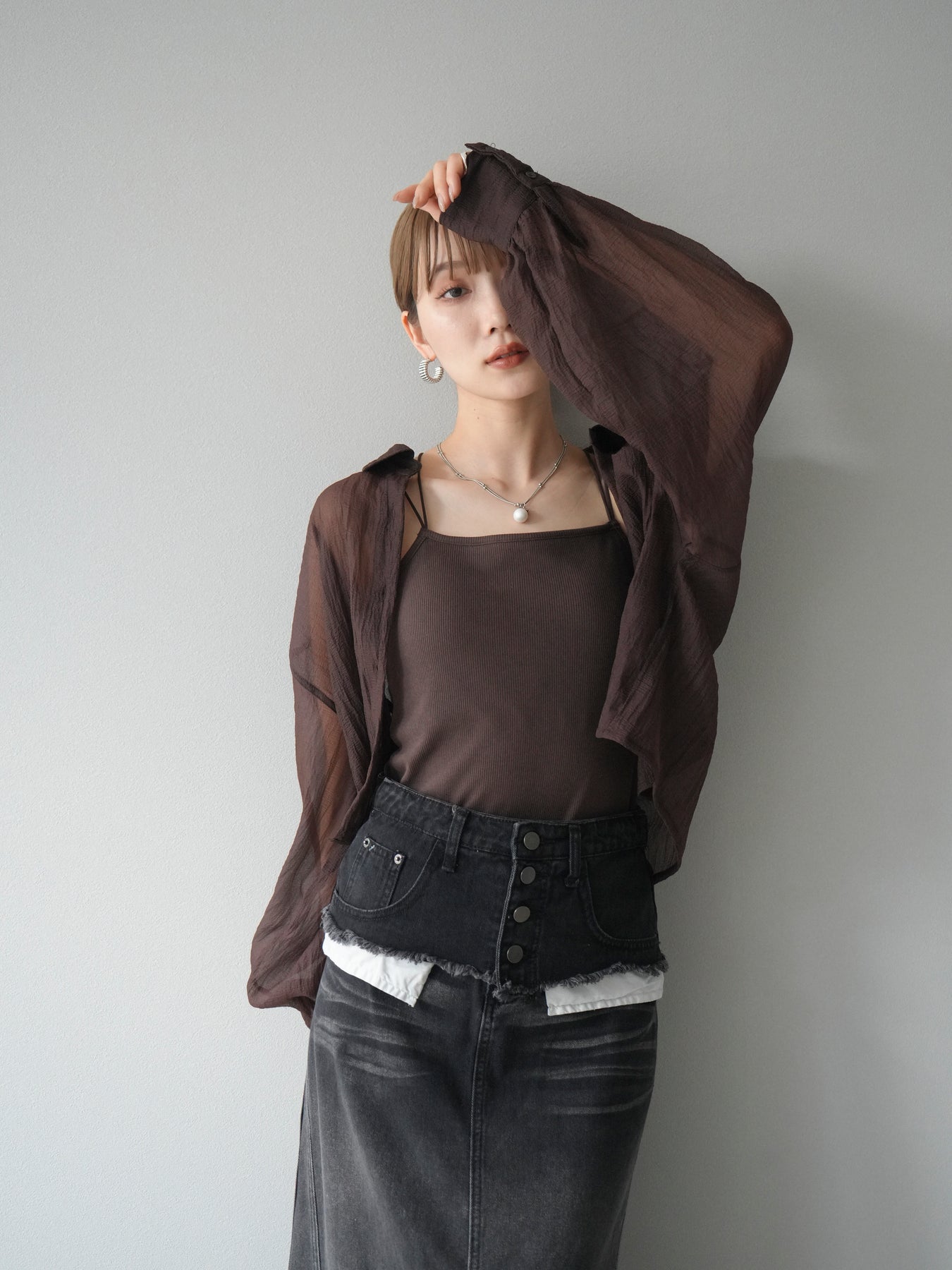繊細なラメ感が上品にきらめくシアー素材のショートシャツ。軽やかな透け感が季節感を引き立て、トレンドムードを演出します。コンパクトな丈感がバランスよく、ハイウエストボトムとも相性抜群。袖口の長めカフスがさりげないアクセントに。羽織りとしても活躍する、着回し力の高い1枚です。 ※ボトムス、キャミソール(インナー)以外の商品は一律でインナーは付属していません