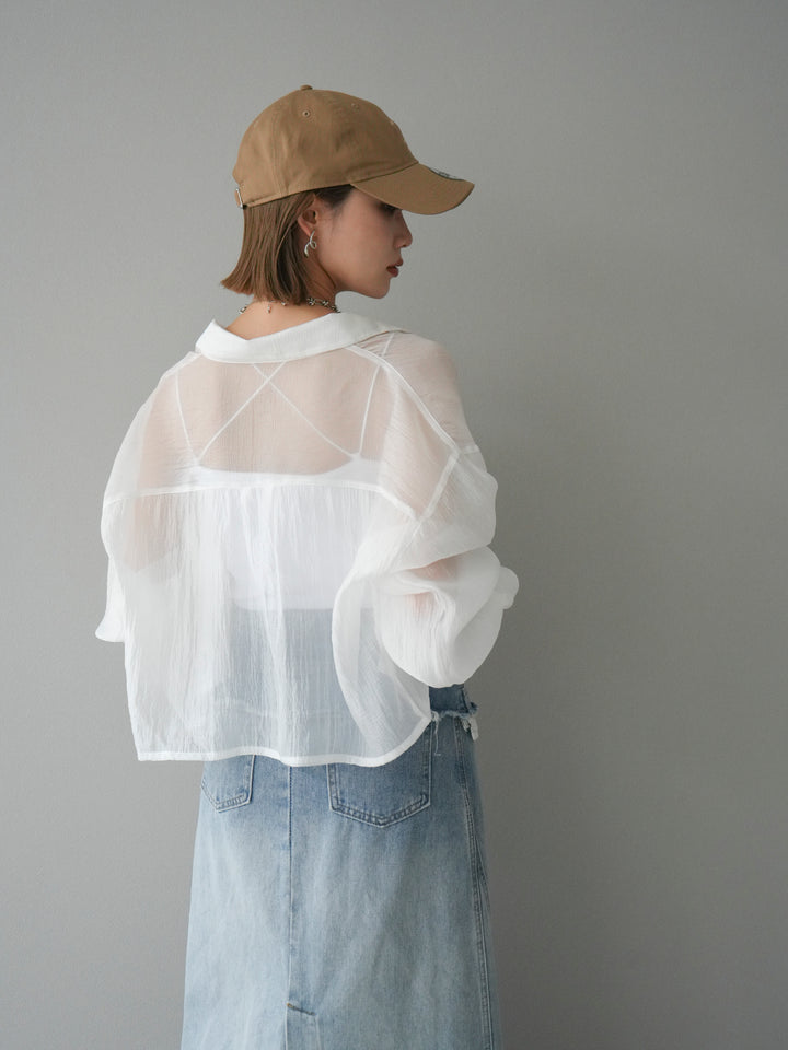 繊細なラメ感が上品にきらめくシアー素材のショートシャツ。軽やかな透け感が季節感を引き立て、トレンドムードを演出します。コンパクトな丈感がバランスよく、ハイウエストボトムとも相性抜群。袖口の長めカフスがさりげないアクセントに。羽織りとしても活躍する、着回し力の高い1枚です。 ※ボトムス、キャミソール(インナー)以外の商品は一律でインナーは付属していません