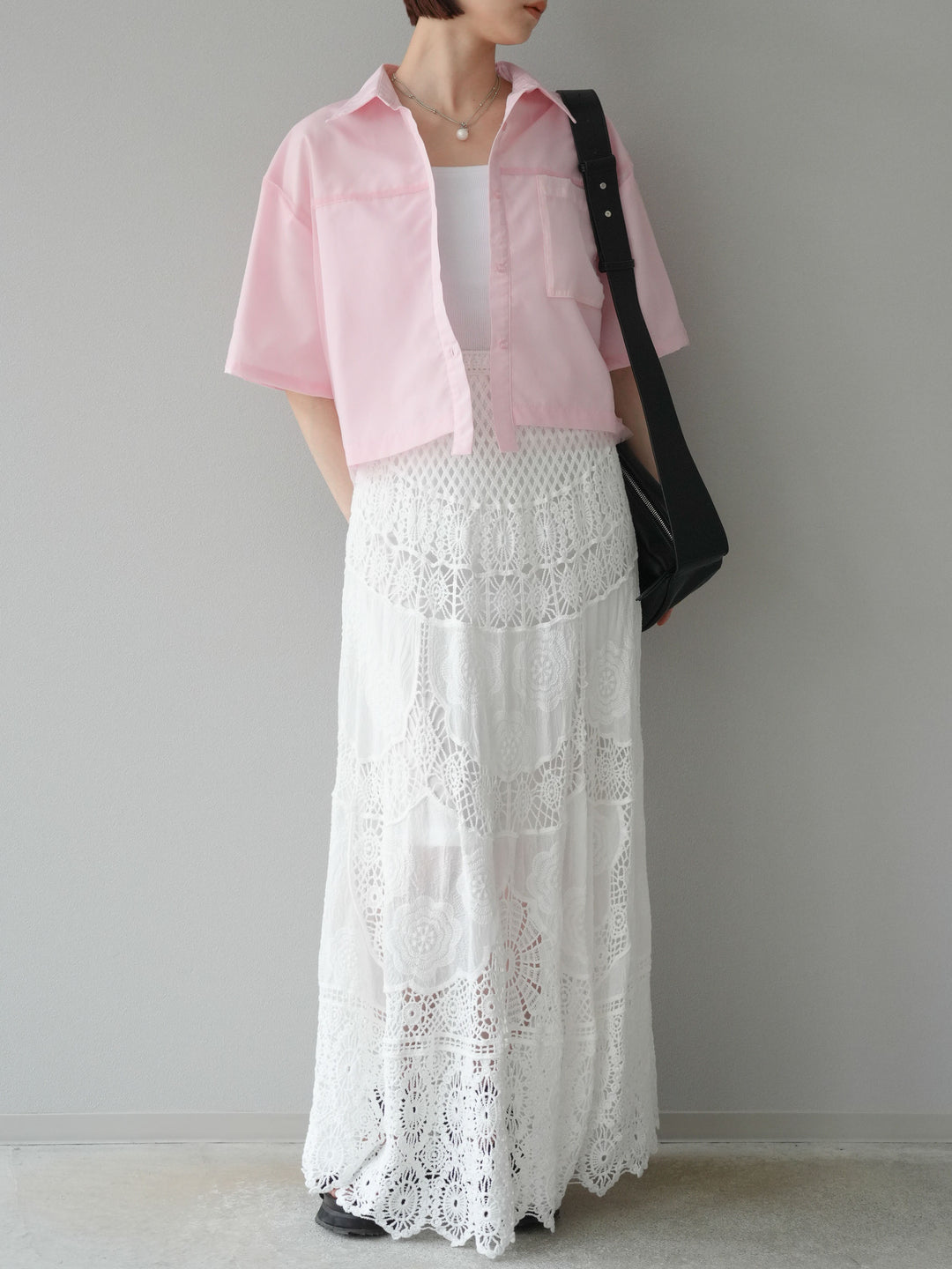 トレンド感たっぷりのレイヤードディテールが魅力のハーフスリーブシャツ。フロントのシームラインやチュール素材の切替えが、シンプルながらも洗練された印象を演出します。軽やかな生地感とほどよい抜け感で、羽織としても活躍する優秀アイテム。モードにもカジュアルにもマッチする着回し力の高さもポイント。 ※ボトムス、キャミソール(インナー)以外の商品は一律でインナーは付属していません