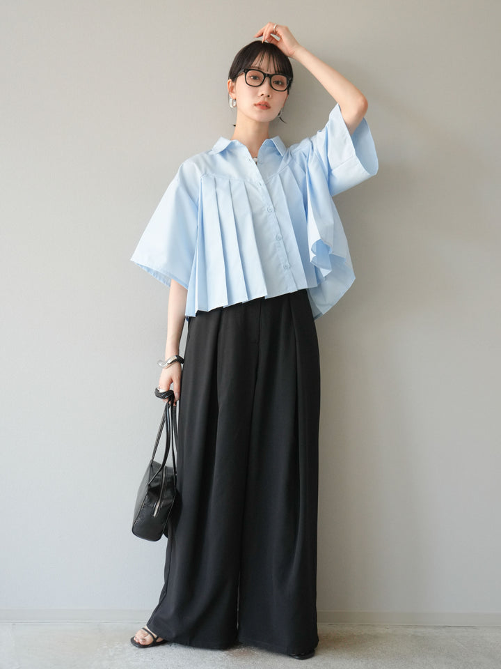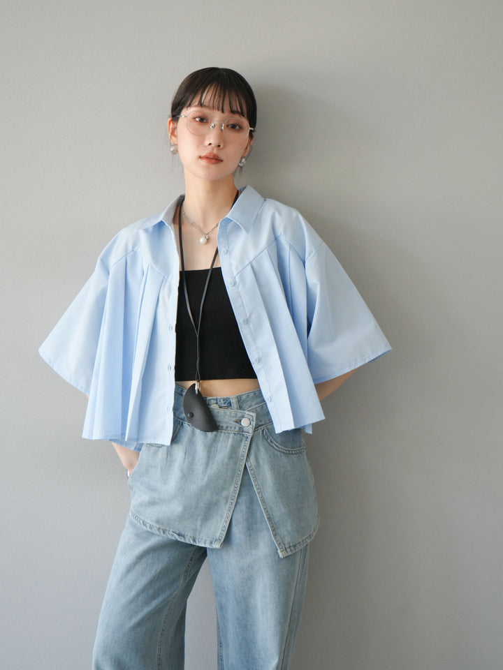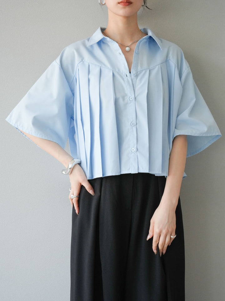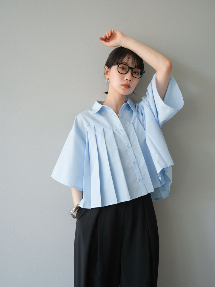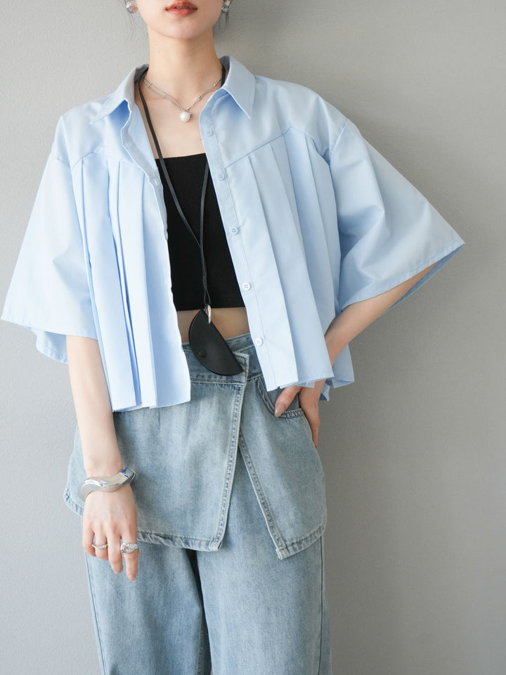 フロントにあしらったプリーツデザインがモードな印象を演出するショートシャツ。さらっとしたブロード素材で着心地が良く、軽やかなシルエットが魅力です。ワイドスリーブとショート丈のバランスがこなれ感をプラスし、パンツにもスカートにも好相性。1枚で存在感のあるトレンドライクなアイテムです。 ※ボトムス、キャミソール(インナー)以外の商品は一律でインナーは付属していません