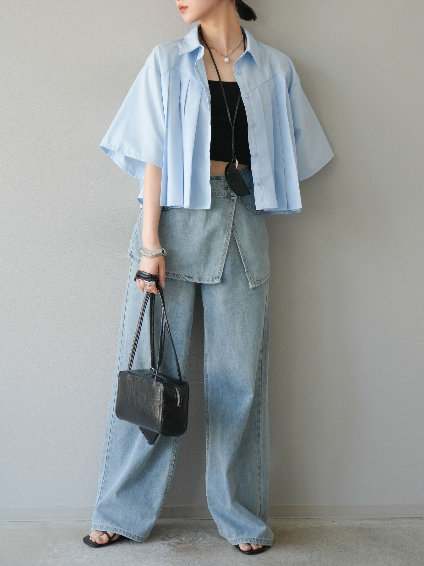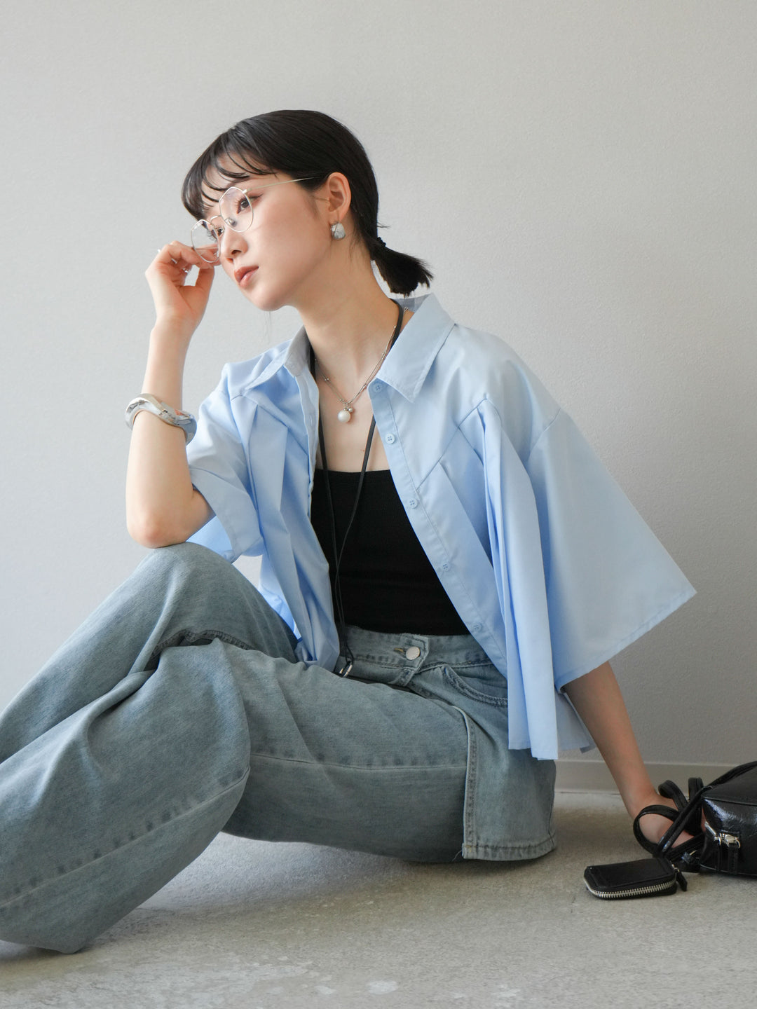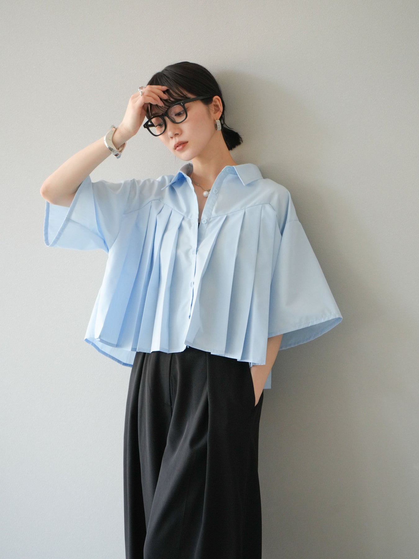 フロントにあしらったプリーツデザインがモードな印象を演出するショートシャツ。さらっとしたブロード素材で着心地が良く、軽やかなシルエットが魅力です。ワイドスリーブとショート丈のバランスがこなれ感をプラスし、パンツにもスカートにも好相性。1枚で存在感のあるトレンドライクなアイテムです。 ※ボトムス、キャミソール(インナー)以外の商品は一律でインナーは付属していません