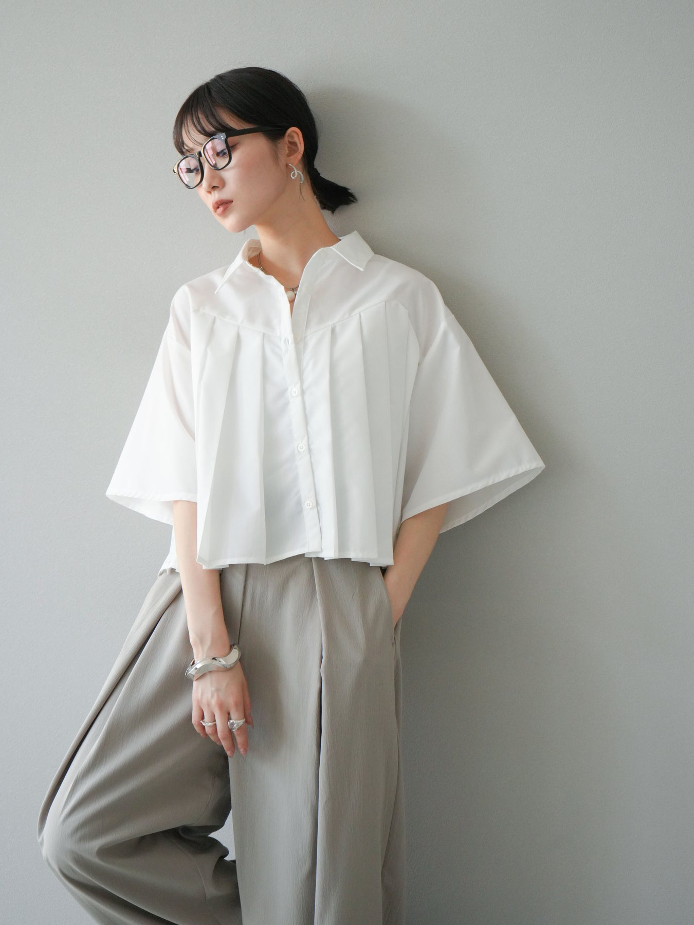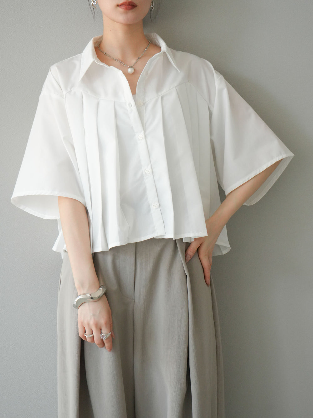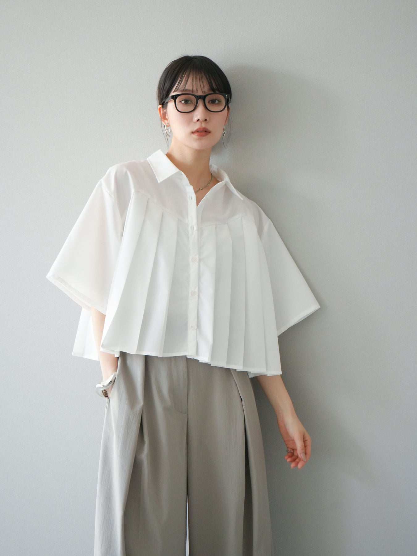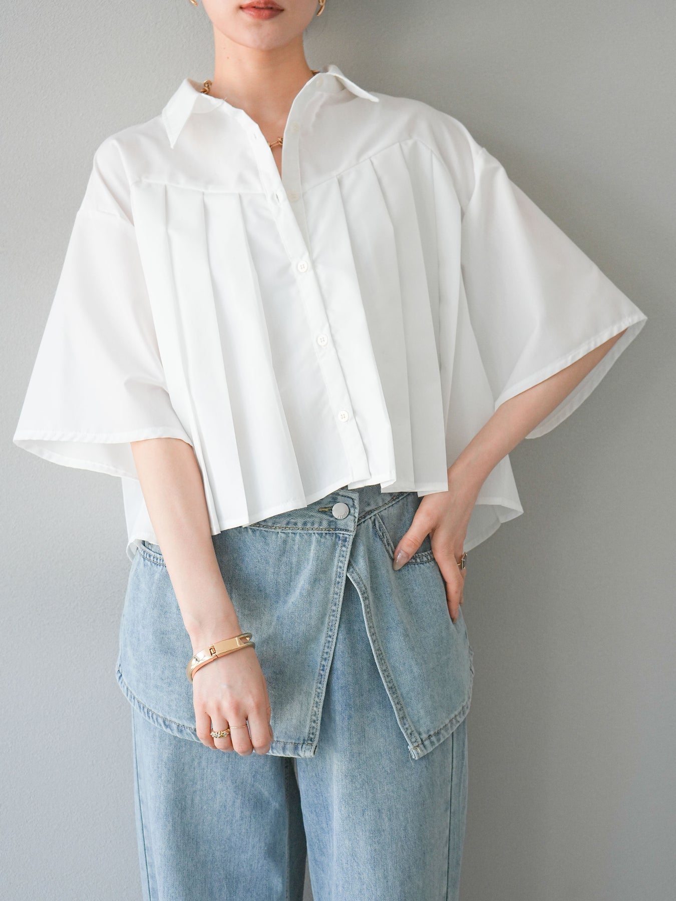 フロントにあしらったプリーツデザインがモードな印象を演出するショートシャツ。さらっとしたブロード素材で着心地が良く、軽やかなシルエットが魅力です。ワイドスリーブとショート丈のバランスがこなれ感をプラスし、パンツにもスカートにも好相性。1枚で存在感のあるトレンドライクなアイテムです。 ※ボトムス、キャミソール(インナー)以外の商品は一律でインナーは付属していません