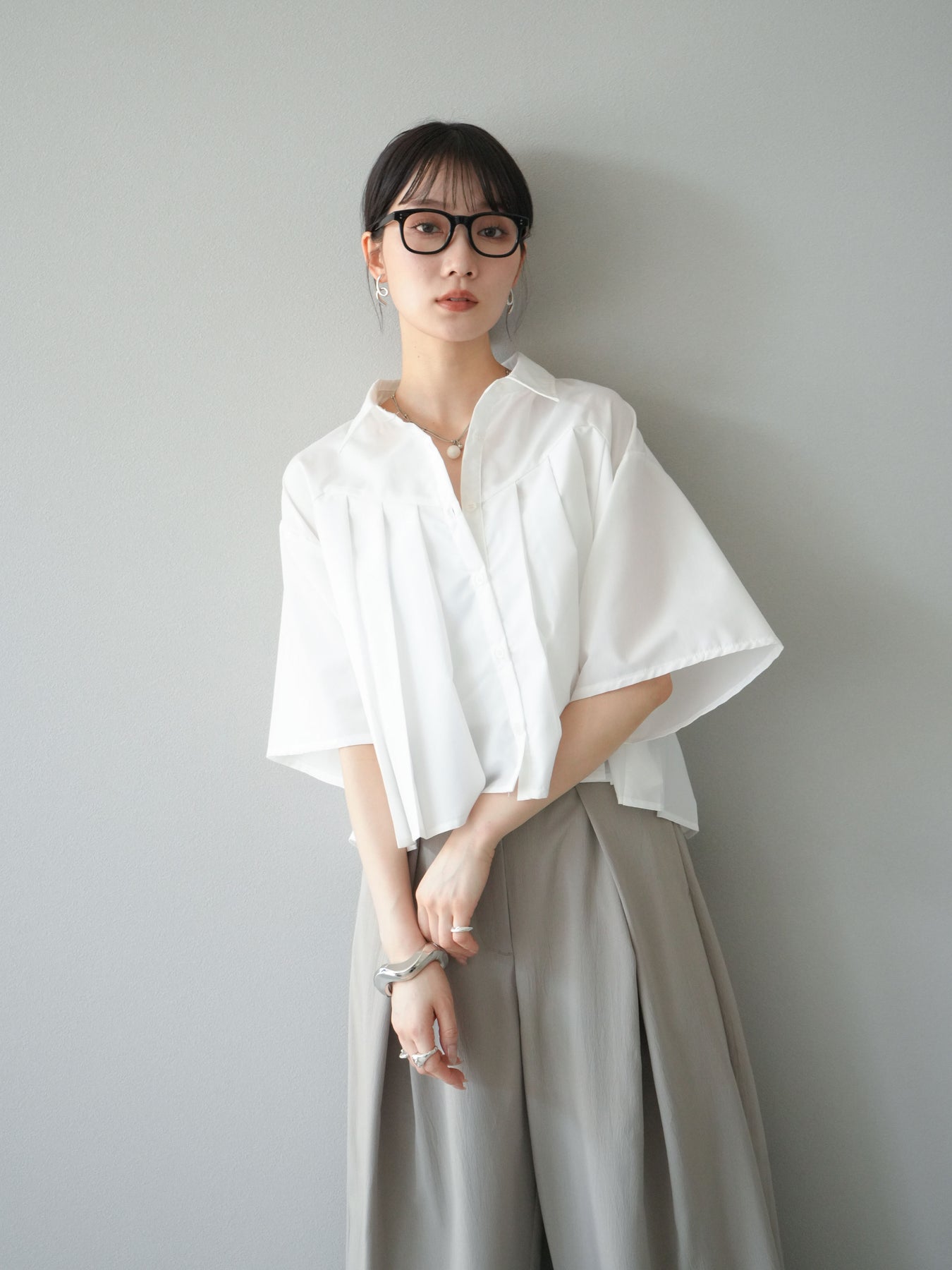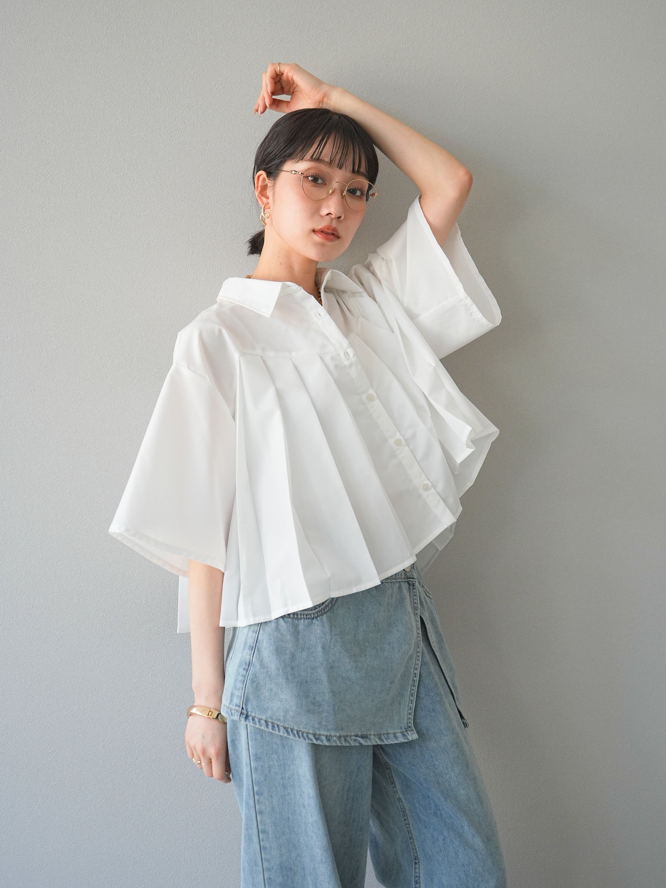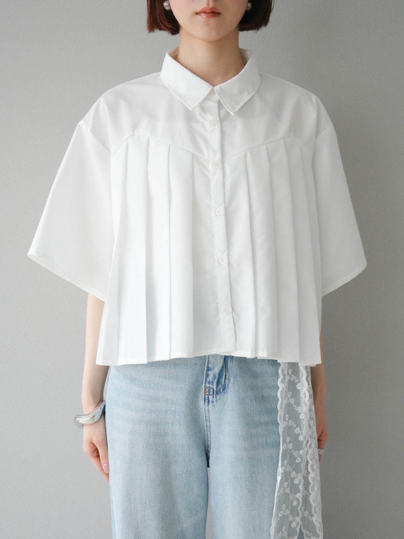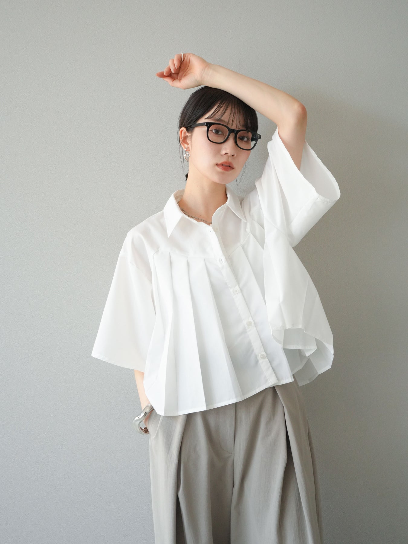 フロントにあしらったプリーツデザインがモードな印象を演出するショートシャツ。さらっとしたブロード素材で着心地が良く、軽やかなシルエットが魅力です。ワイドスリーブとショート丈のバランスがこなれ感をプラスし、パンツにもスカートにも好相性。1枚で存在感のあるトレンドライクなアイテムです。 ※ボトムス、キャミソール(インナー)以外の商品は一律でインナーは付属していません