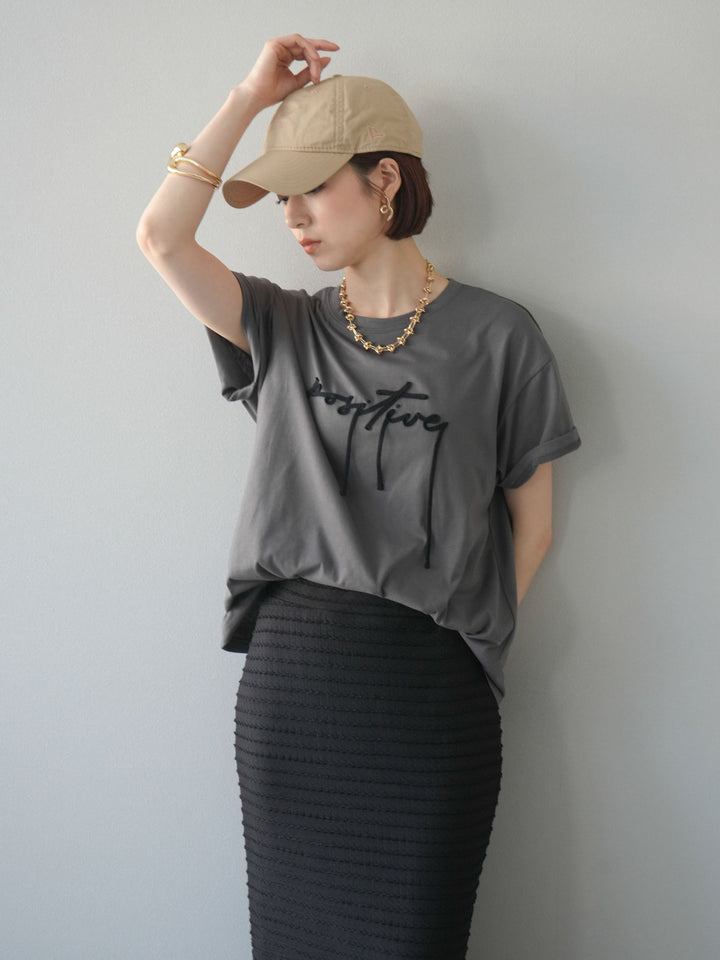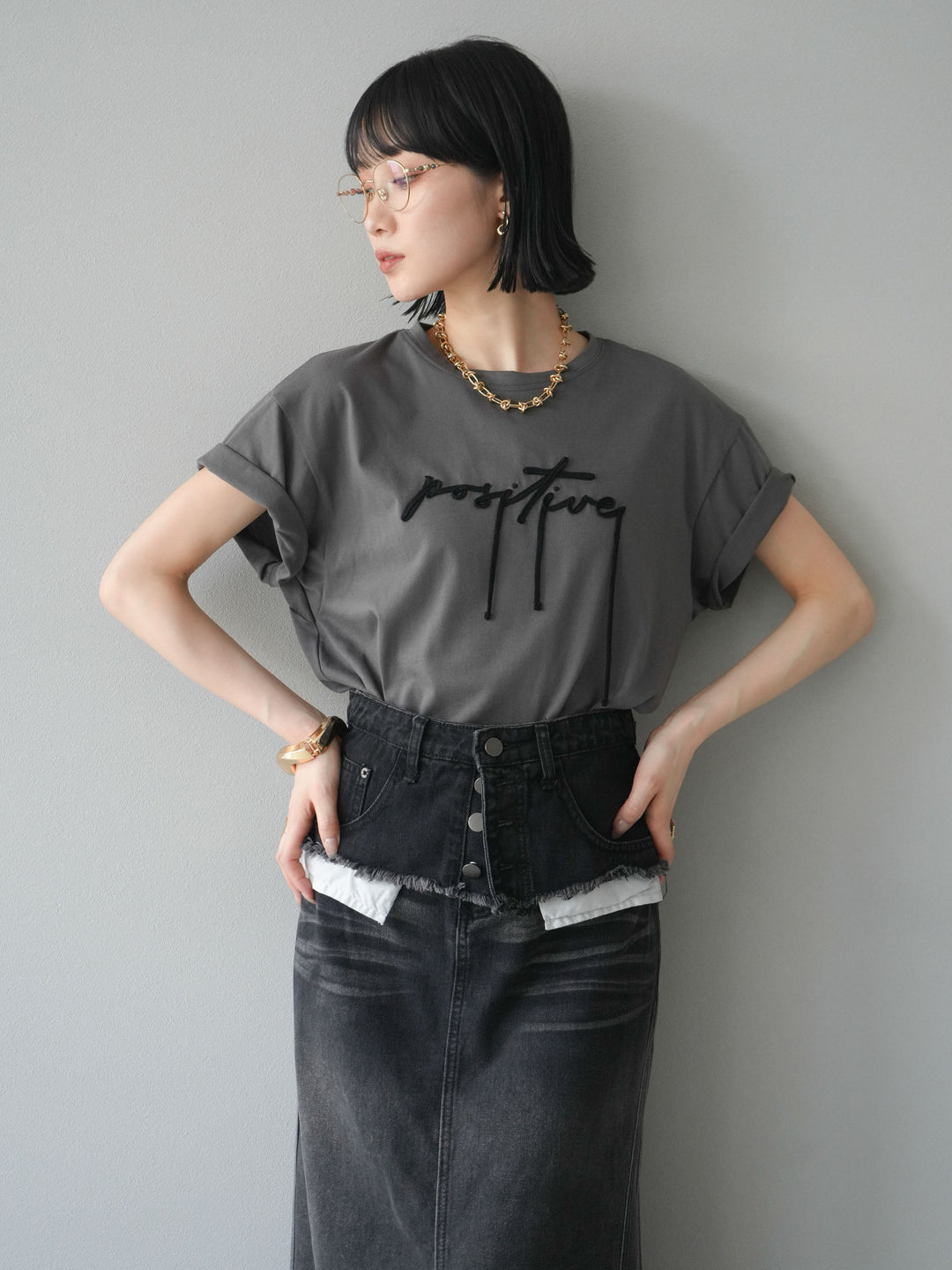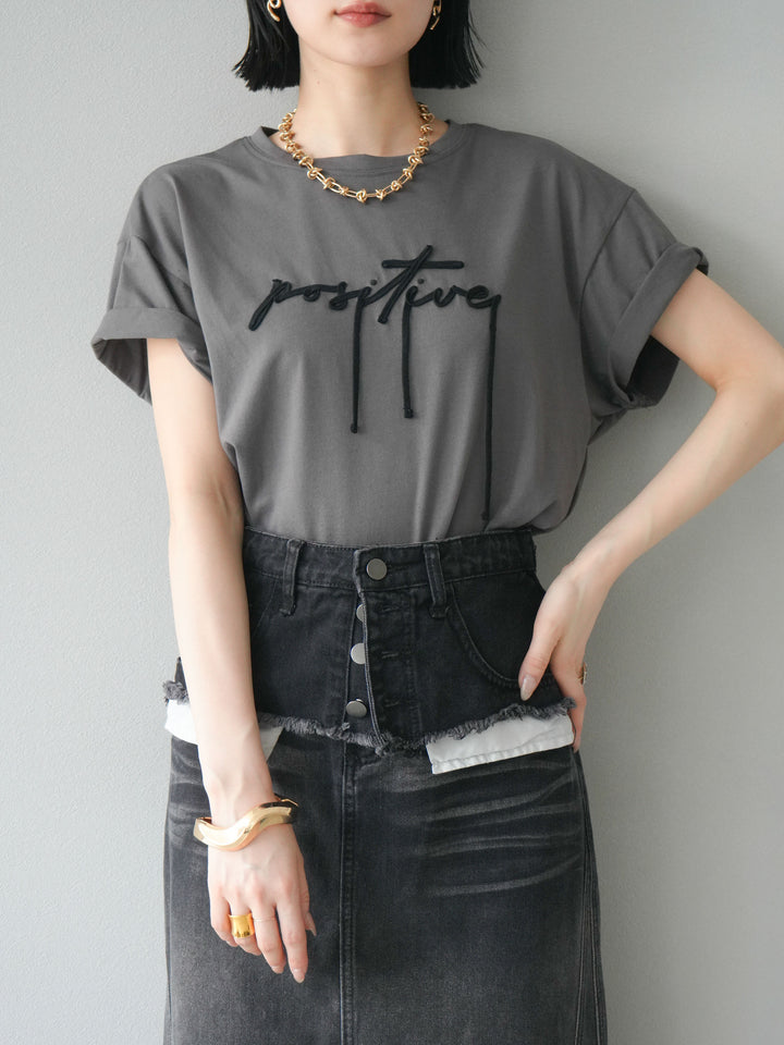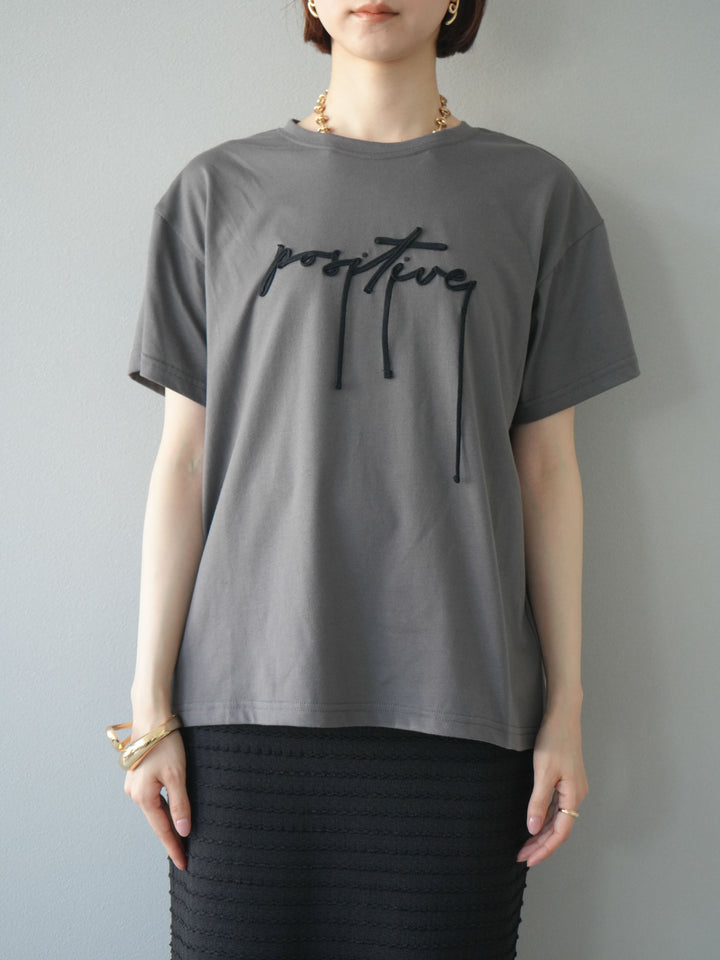立体感のあるコード刺繍で「positive」のロゴを施したTシャツ。シンプルながら存在感のあるデザインで、カジュアルスタイルにアクセントをプラスします。ややゆとりのあるシルエットが今っぽく、デニムやスカートと合わせるだけでトレンドライクなコーデが完成。デイリーに着回しやすい一枚です。 ※ボトムス、キャミソール(インナー)以外の商品は一律でインナーは付属していません