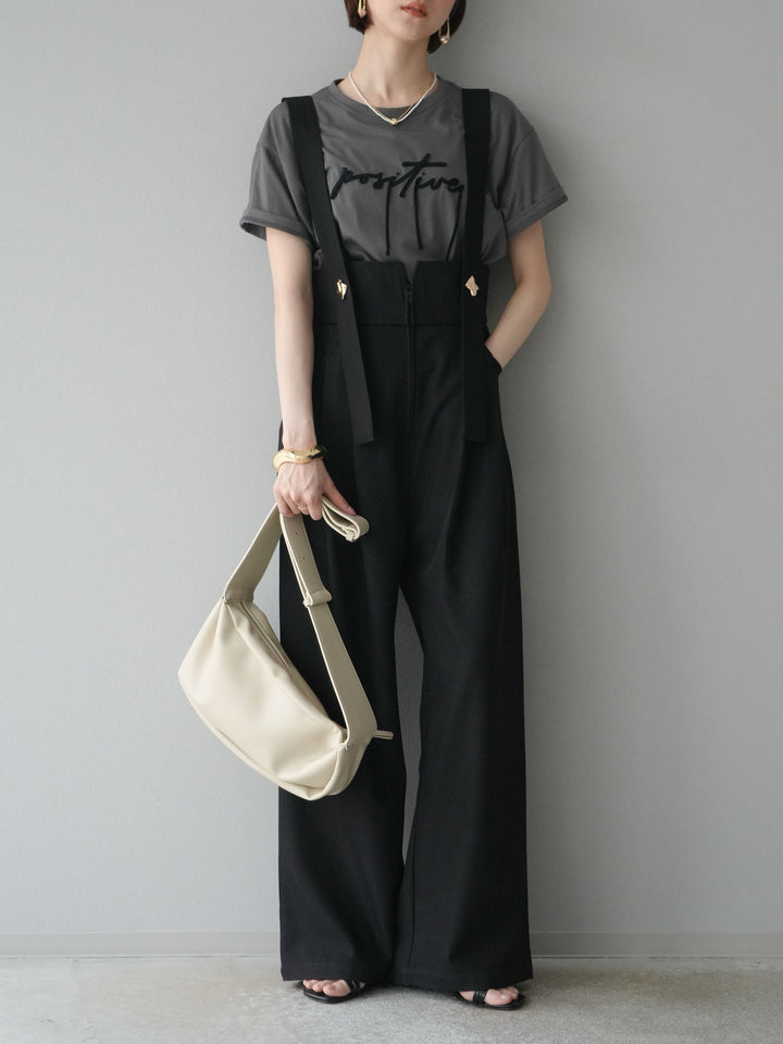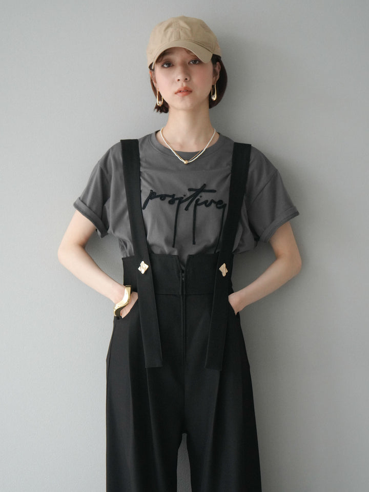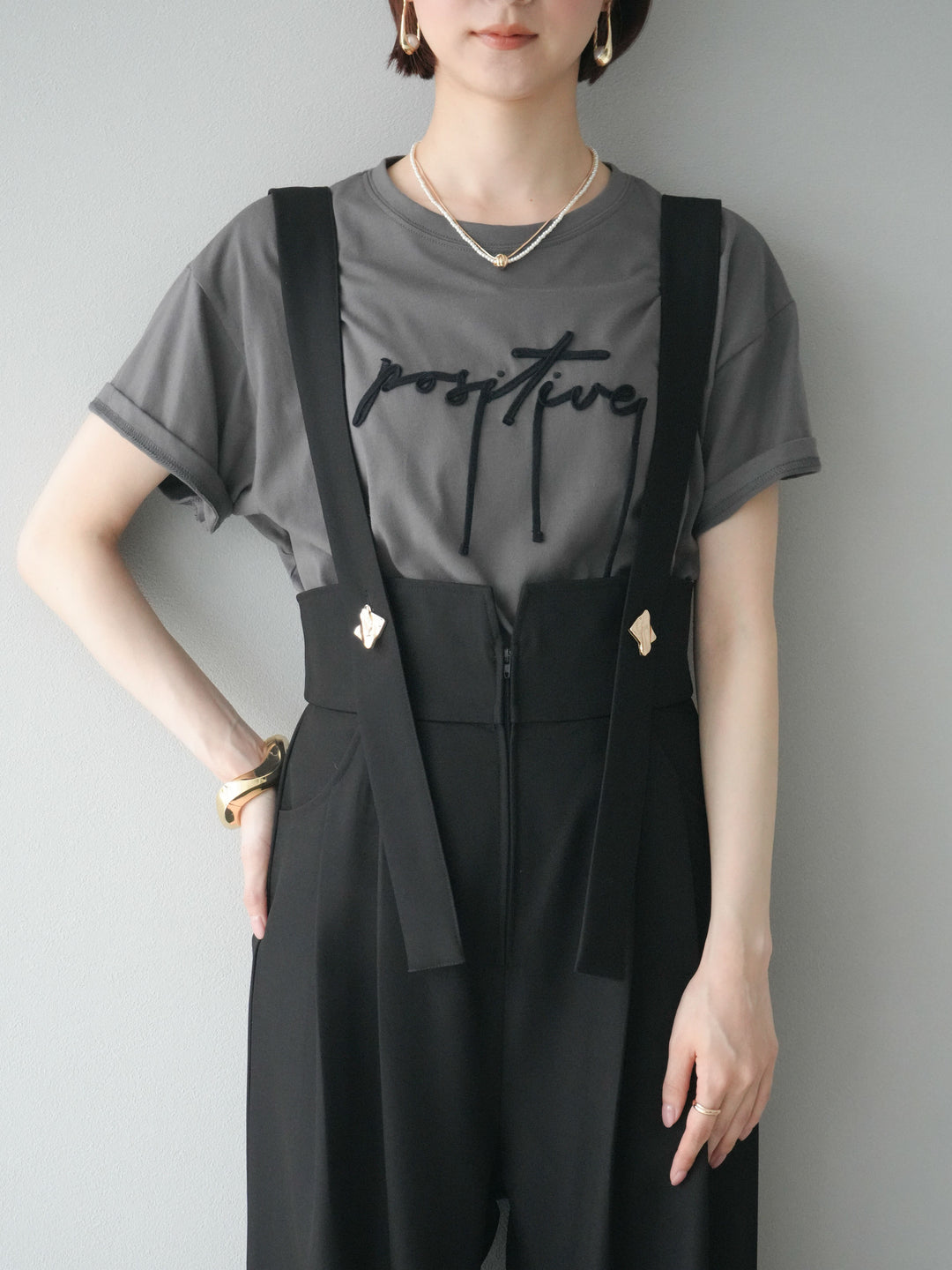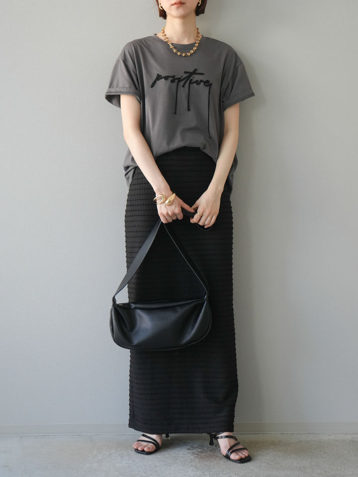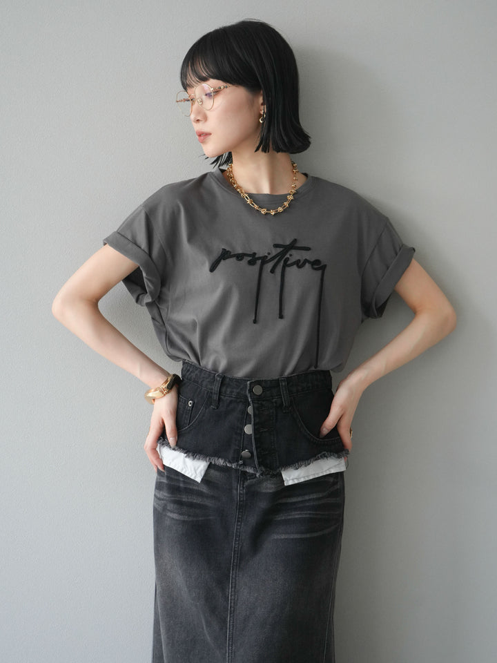 立体感のあるコード刺繍で「positive」のロゴを施したTシャツ。シンプルながら存在感のあるデザインで、カジュアルスタイルにアクセントをプラスします。ややゆとりのあるシルエットが今っぽく、デニムやスカートと合わせるだけでトレンドライクなコーデが完成。デイリーに着回しやすい一枚です。 ※ボトムス、キャミソール(インナー)以外の商品は一律でインナーは付属していません