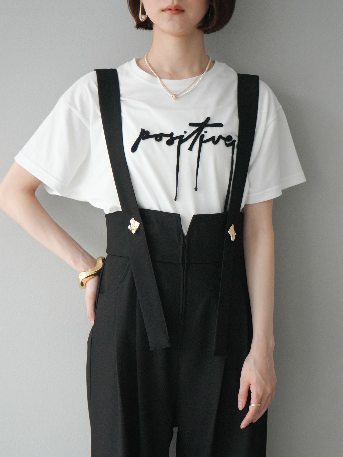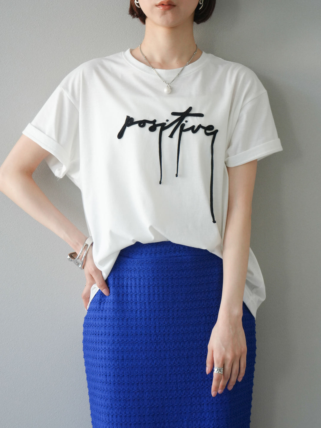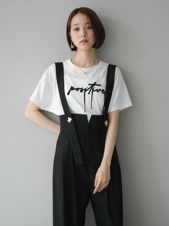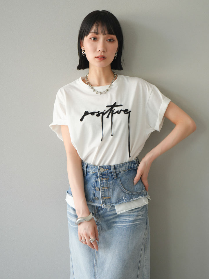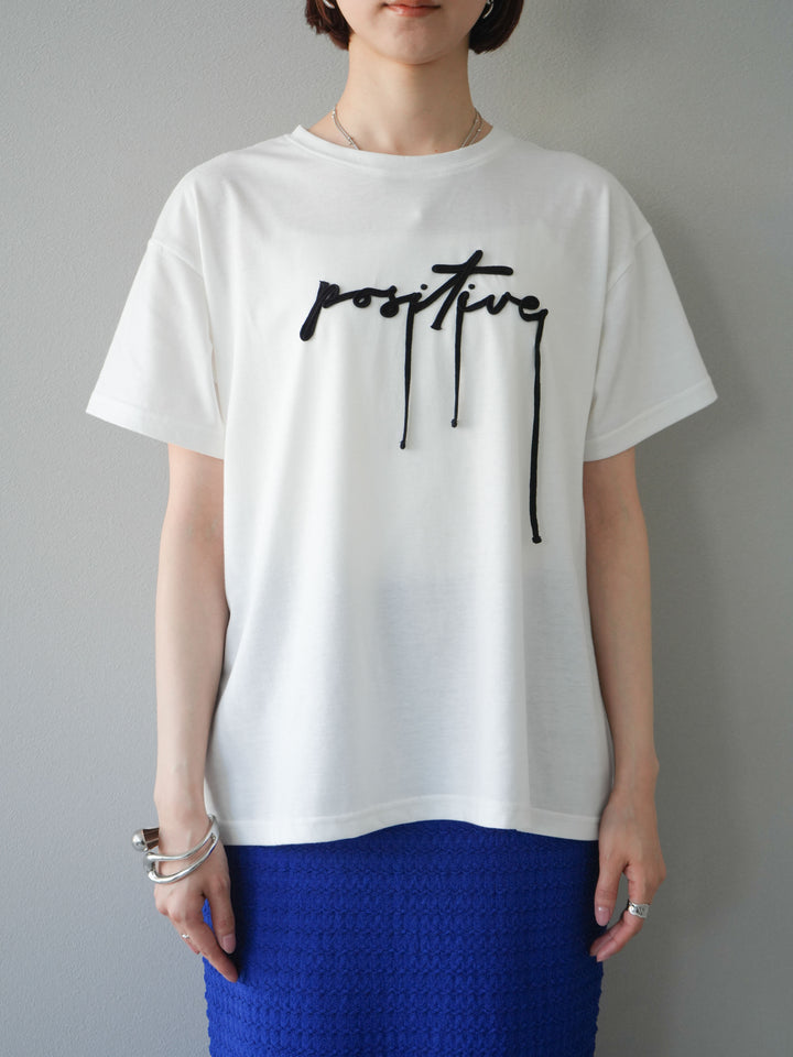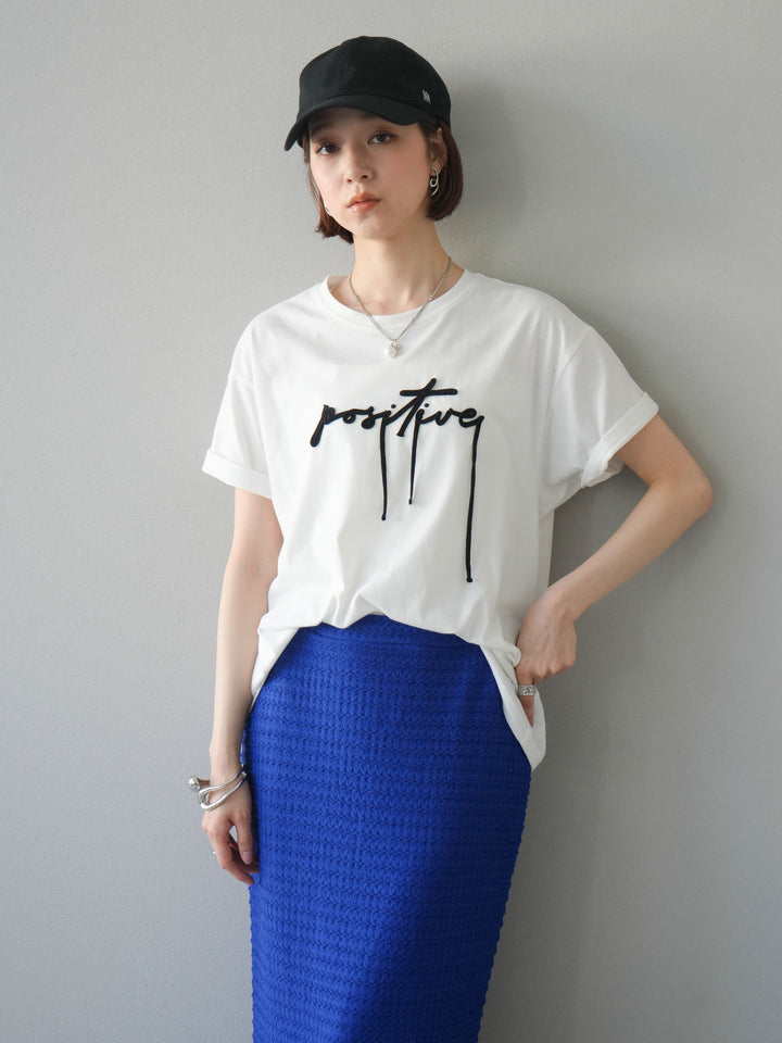 立体感のあるコード刺繍で「positive」のロゴを施したTシャツ。シンプルながら存在感のあるデザインで、カジュアルスタイルにアクセントをプラスします。ややゆとりのあるシルエットが今っぽく、デニムやスカートと合わせるだけでトレンドライクなコーデが完成。デイリーに着回しやすい一枚です。 ※ボトムス、キャミソール(インナー)以外の商品は一律でインナーは付属していません