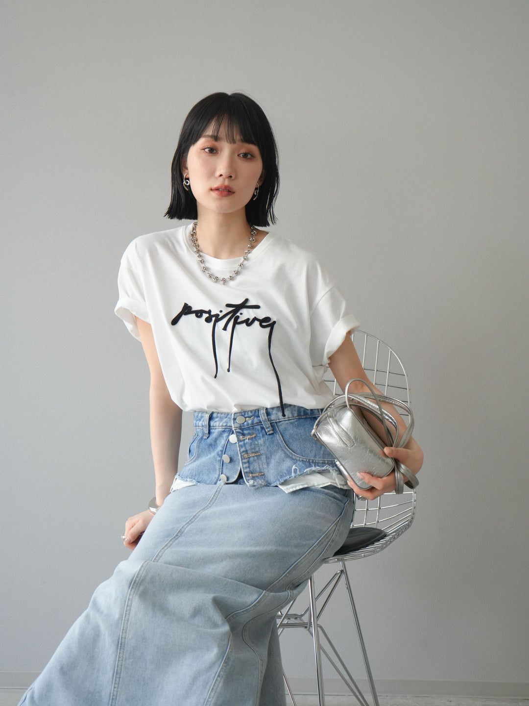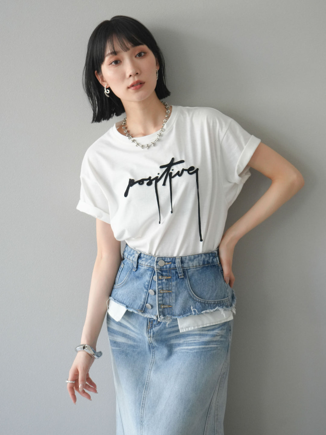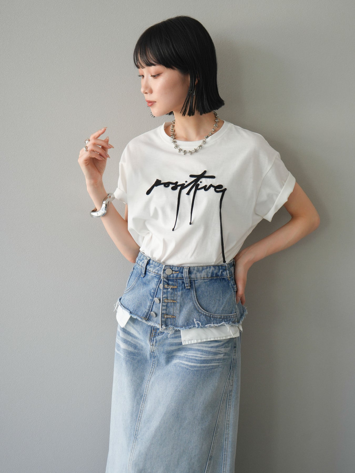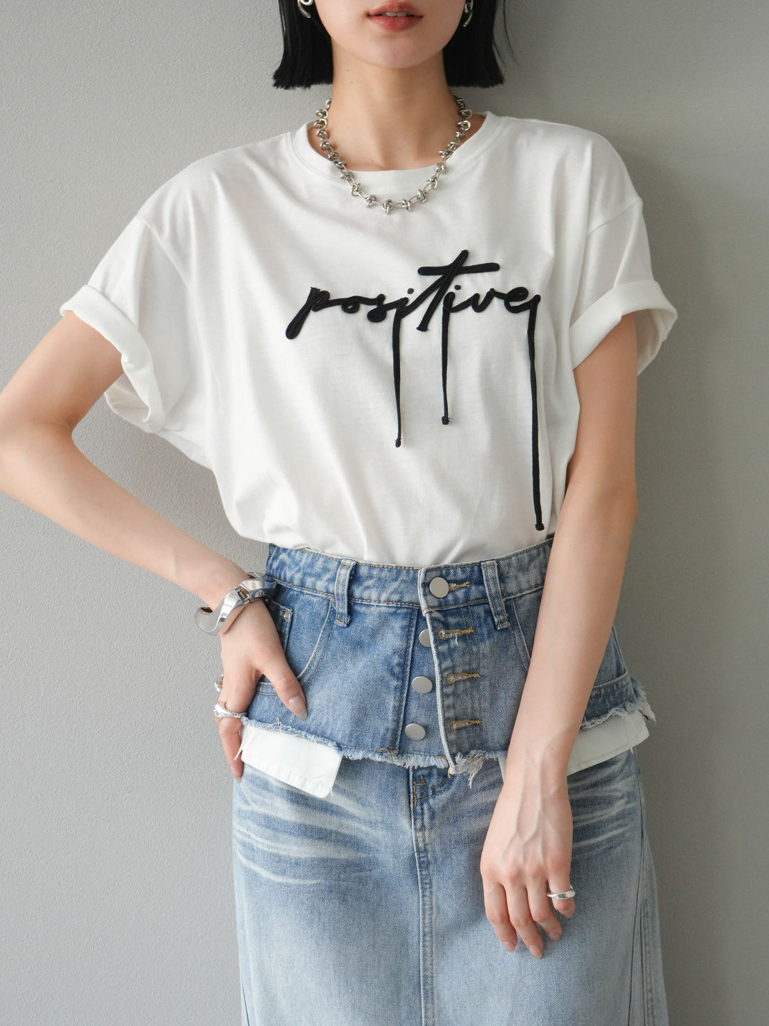 立体感のあるコード刺繍で「positive」のロゴを施したTシャツ。シンプルながら存在感のあるデザインで、カジュアルスタイルにアクセントをプラスします。ややゆとりのあるシルエットが今っぽく、デニムやスカートと合わせるだけでトレンドライクなコーデが完成。デイリーに着回しやすい一枚です。 ※ボトムス、キャミソール(インナー)以外の商品は一律でインナーは付属していません