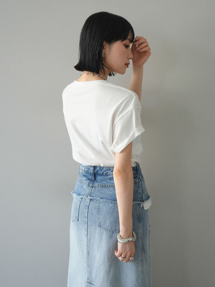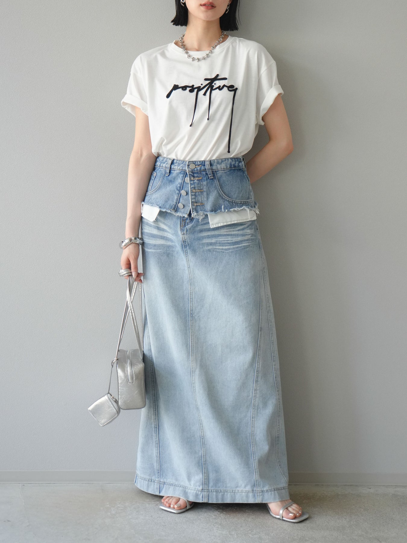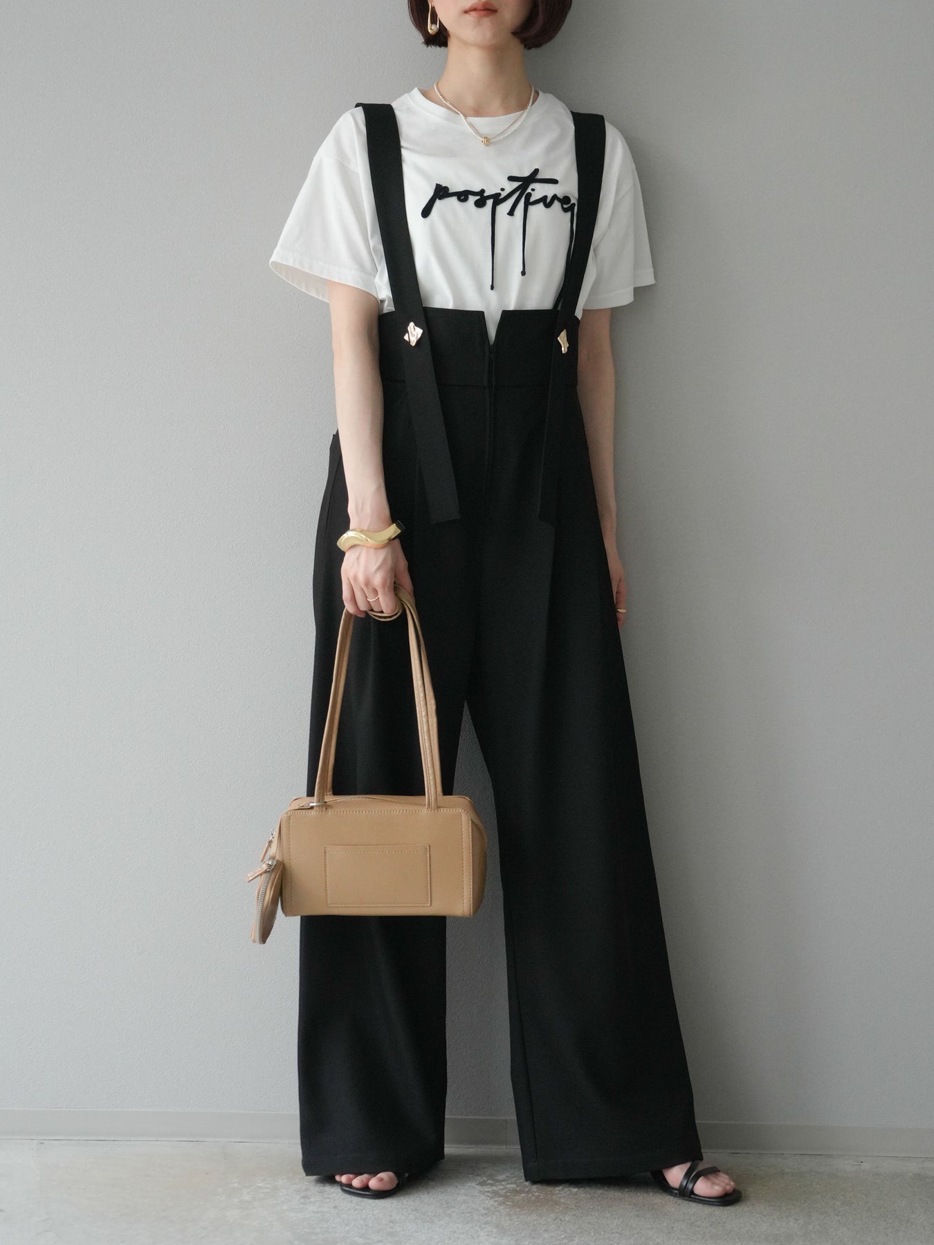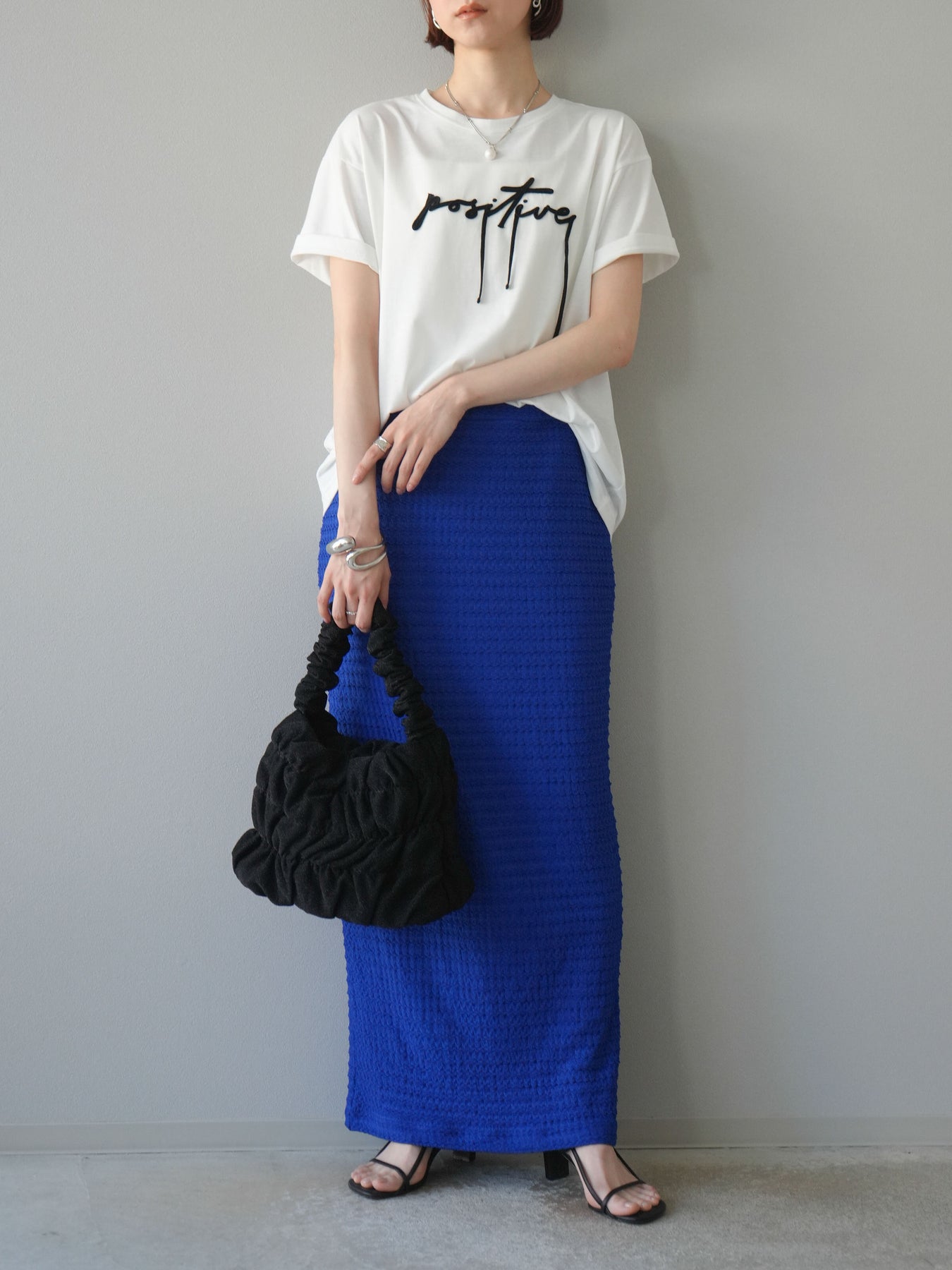 立体感のあるコード刺繍で「positive」のロゴを施したTシャツ。シンプルながら存在感のあるデザインで、カジュアルスタイルにアクセントをプラスします。ややゆとりのあるシルエットが今っぽく、デニムやスカートと合わせるだけでトレンドライクなコーデが完成。デイリーに着回しやすい一枚です。 ※ボトムス、キャミソール(インナー)以外の商品は一律でインナーは付属していません