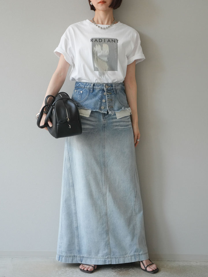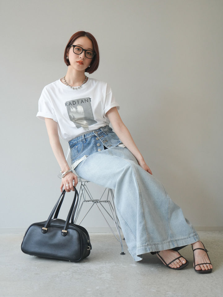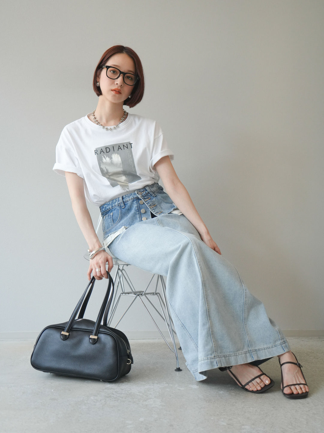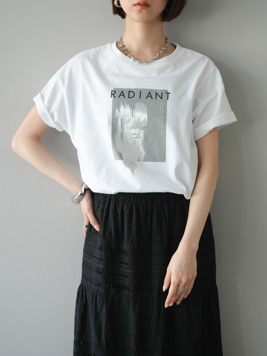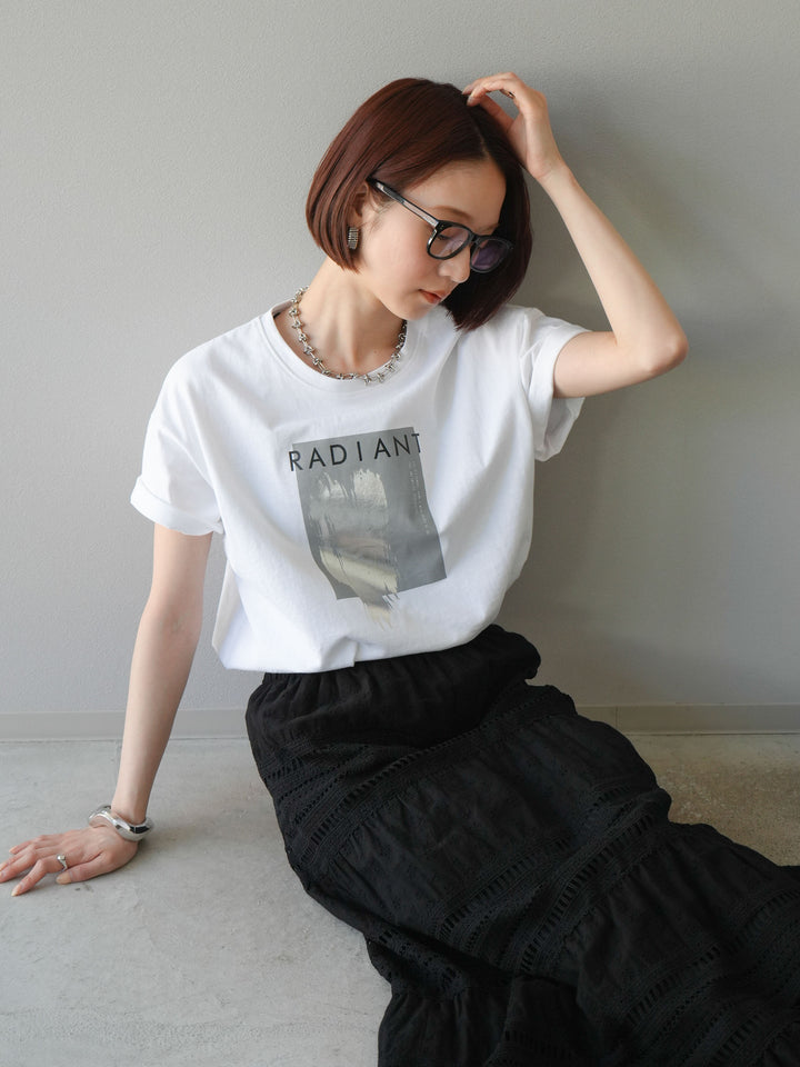 モードな雰囲気漂う箔プリントが目を惹くビッグTシャツ。ゆるっとしたシルエットで抜け感を演出しつつ、アート感のあるフロントデザインでスタイリングにエッジをプラス。カジュアルな着心地ながらも、着映えする一枚です。デニムやスラックスとの相性も◎。トレンドライクなスタイルが叶います。 ※ボトムス、キャミソール(インナー)以外の商品は一律でインナーは付属していません