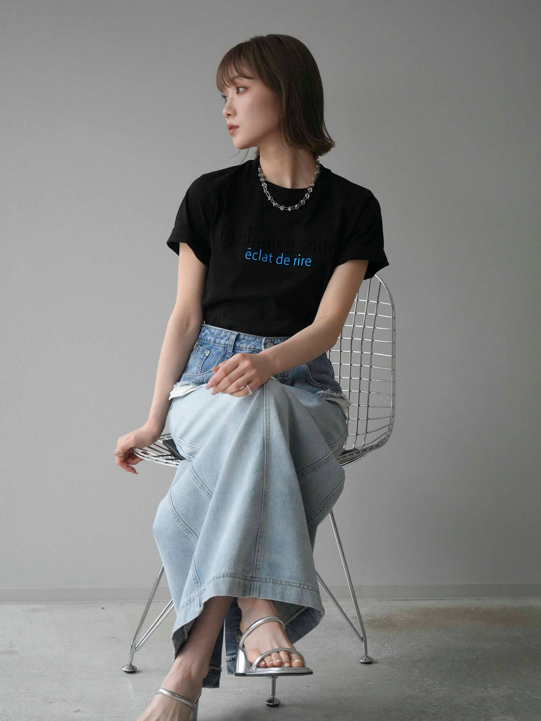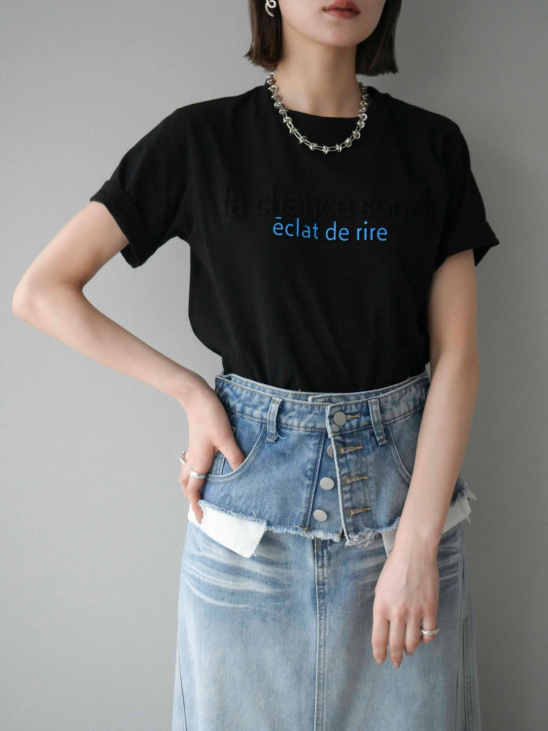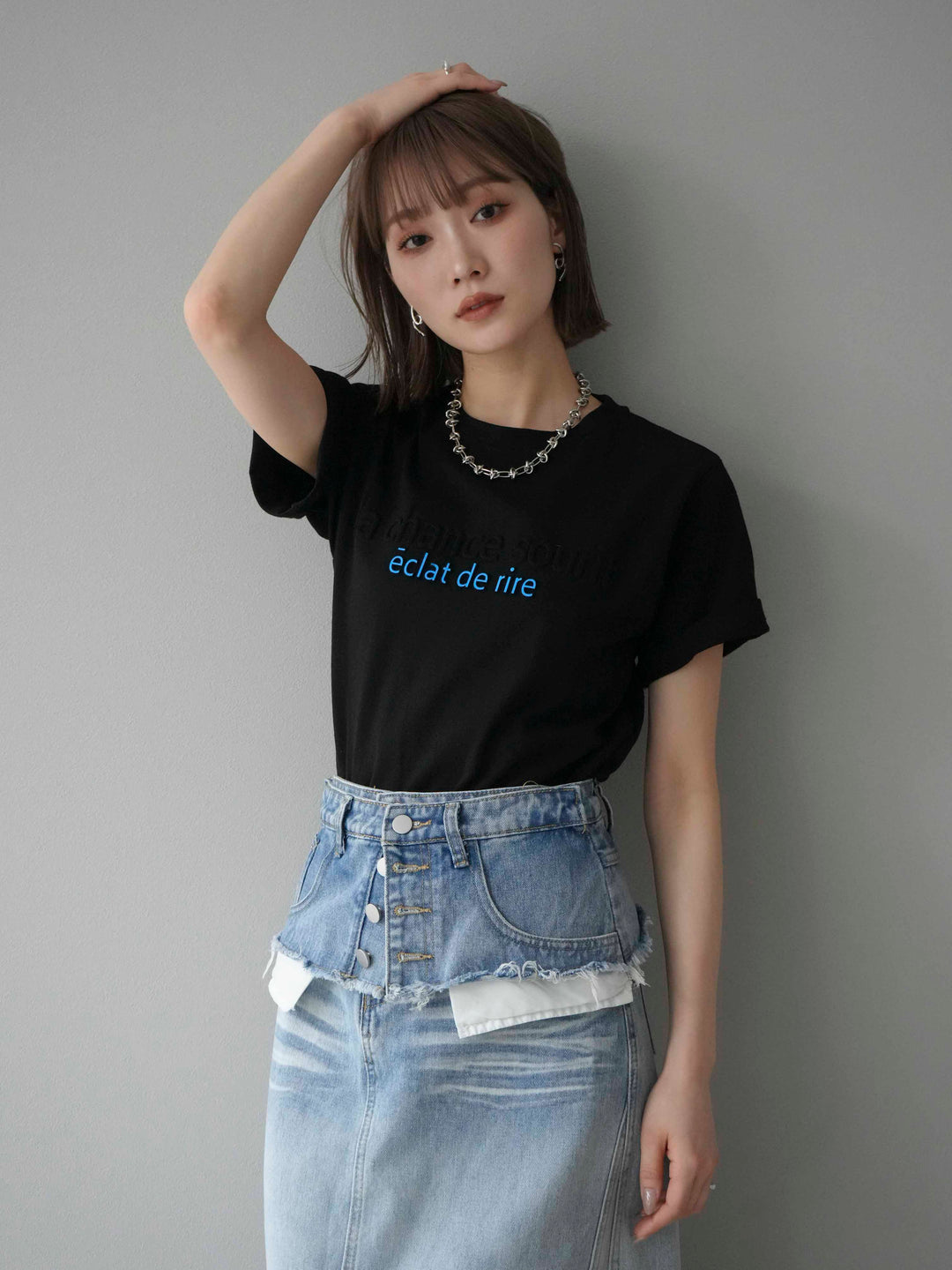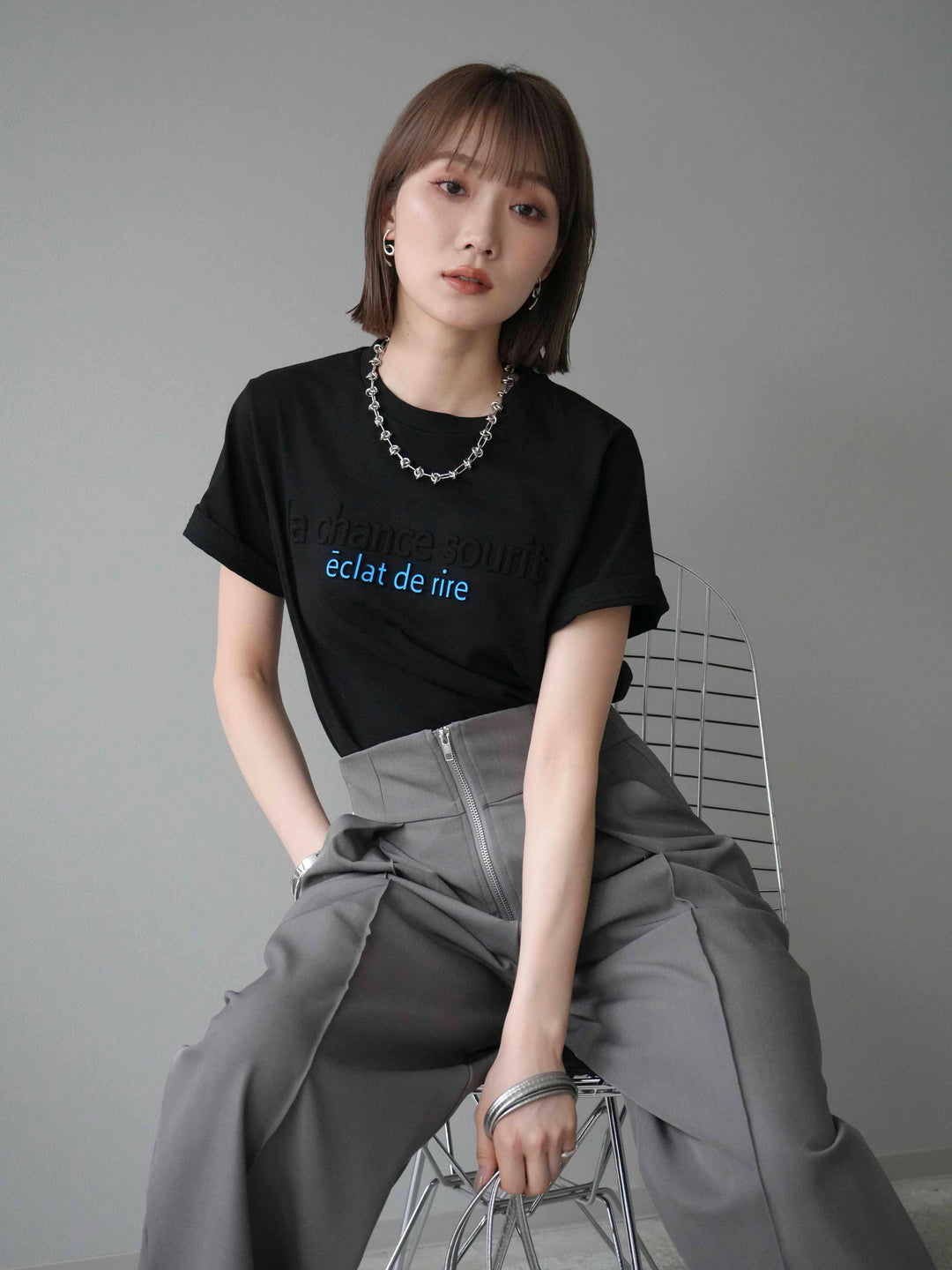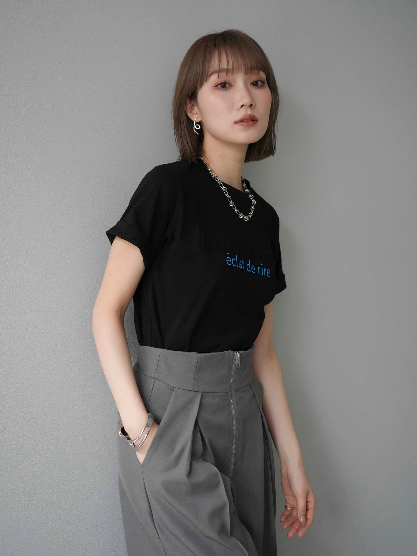 立体感のあるエンボスロゴが目を引く、トレンドライクなTシャツ。ほどよくゆとりのあるシルエットで、リラックス感がありながらも洗練された印象に。フロントのフランス語ロゴは、カジュアルながらも品のあるアクセント。デニムからスカートまで幅広く合わせやすく、デイリーコーデに活躍する一枚です。 ※ボトムス、キャミソール(インナー)以外の商品は一律でインナーは付属していません