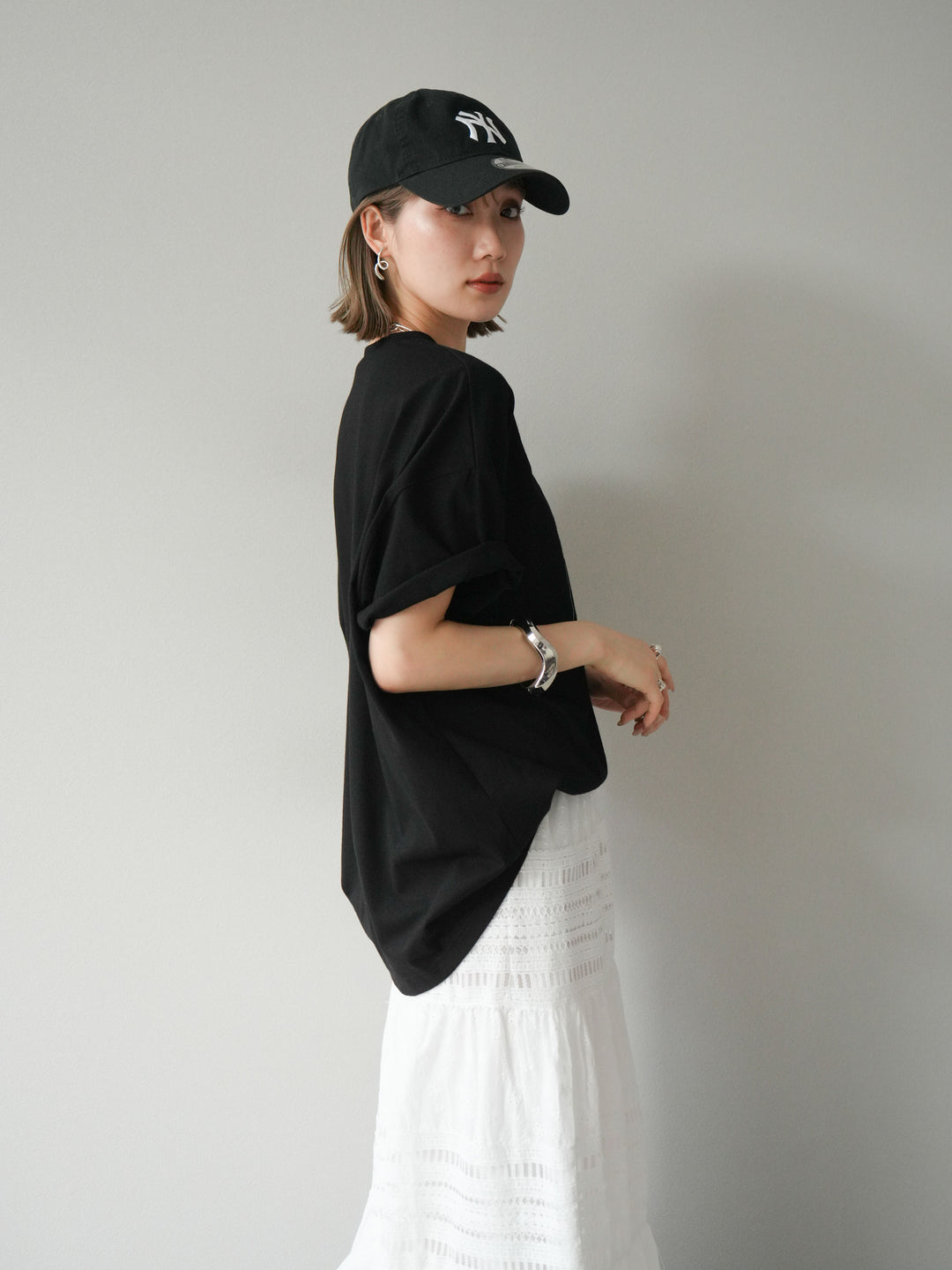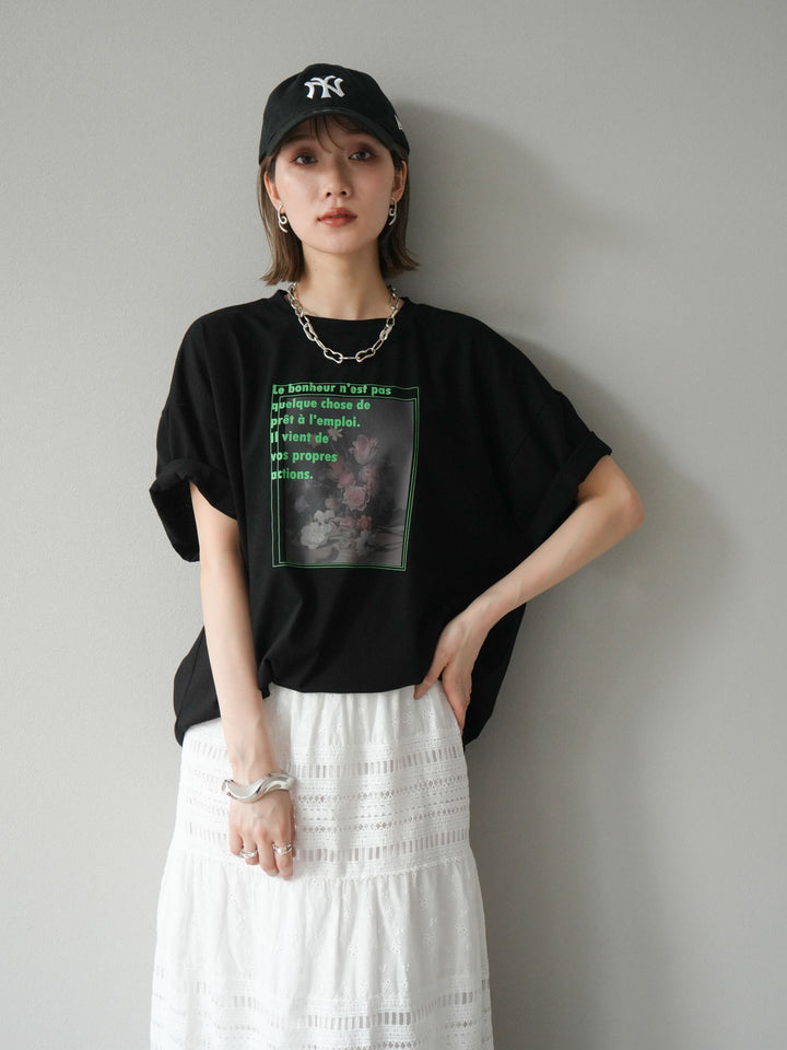 繊細なフラワーアートにメッセージロゴを重ねた、大人の遊び心を感じる一枚。程よくルーズなビッグシルエットで、リラックス感もありつつ今っぽさも抜群。モードにもカジュアルにも合わせやすく、デニムやスラックスとの相性も◎。一枚でトレンド感を演出できる注目のTシャツです。 ※ボトムス、キャミソール(インナー)以外の商品は一律でインナーは付属していません