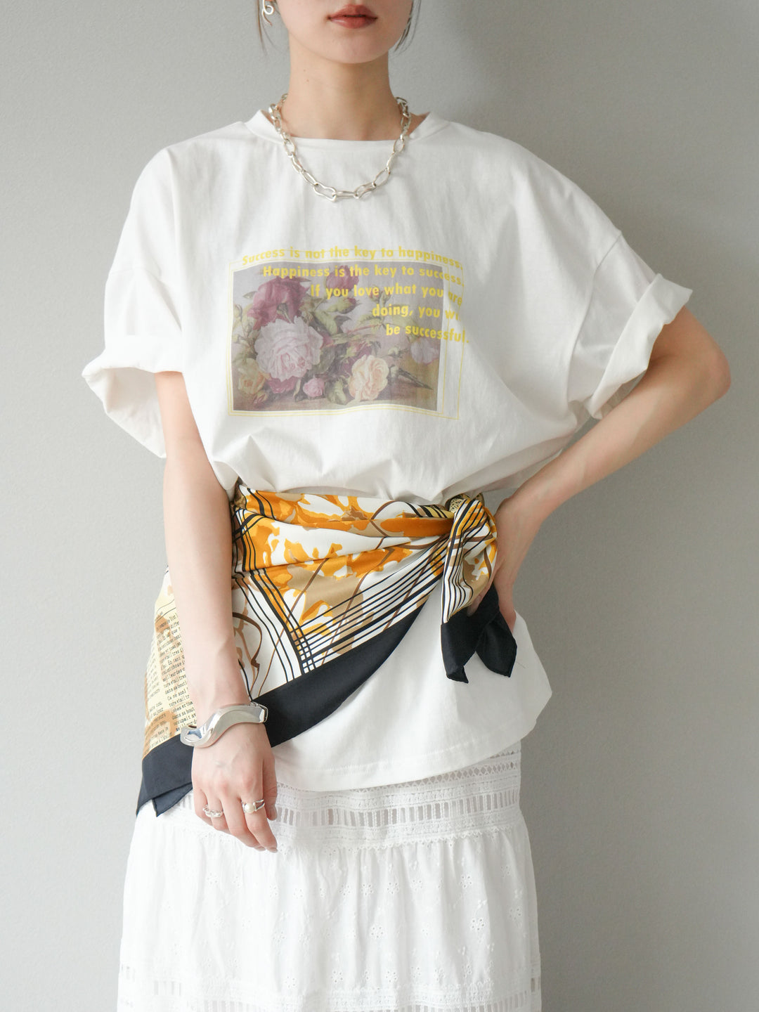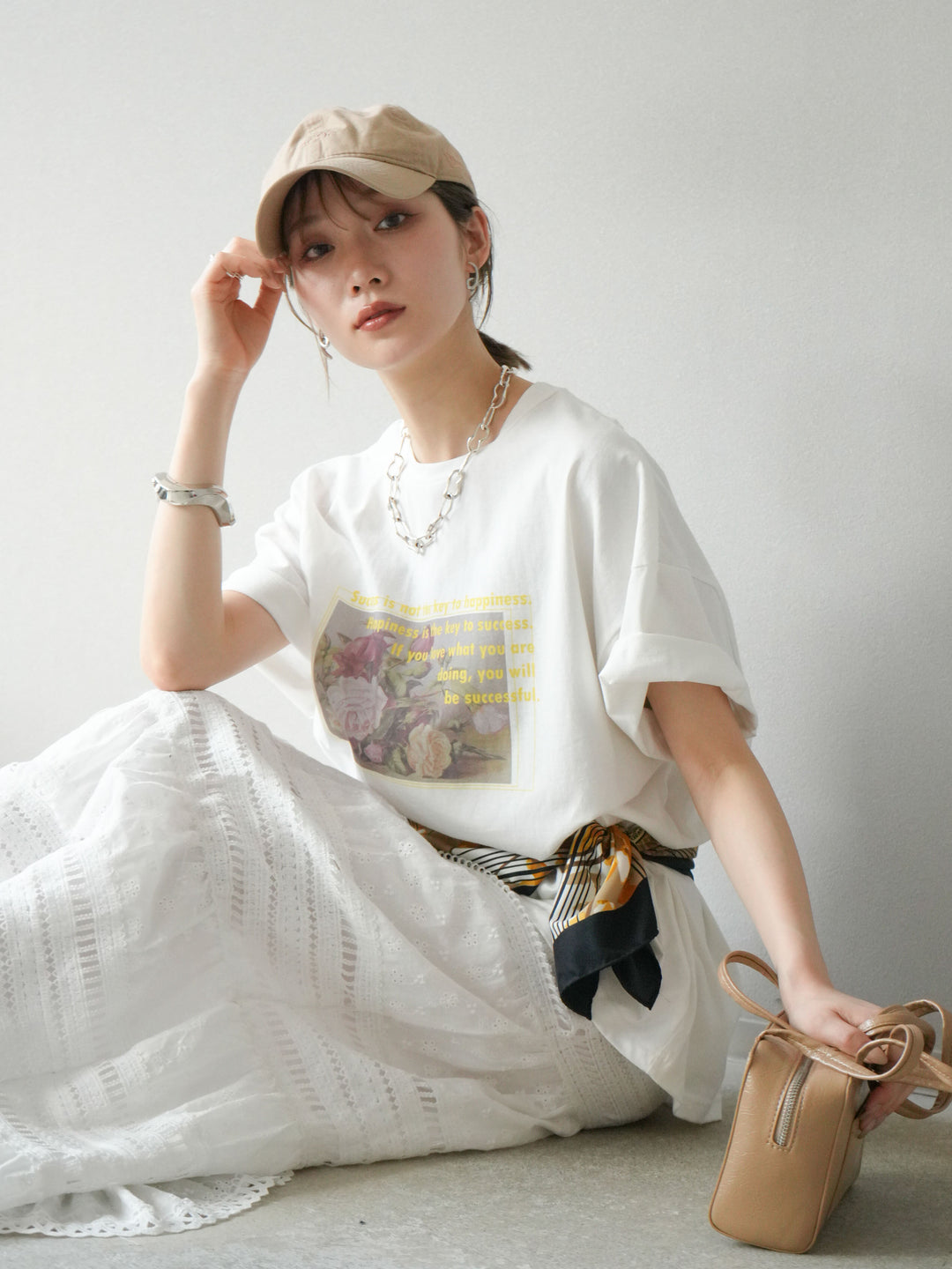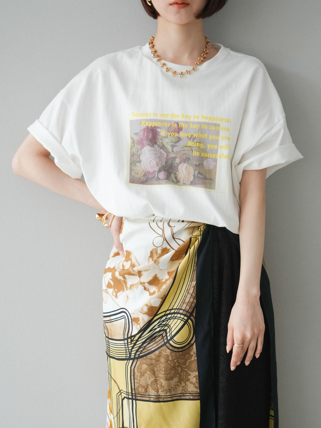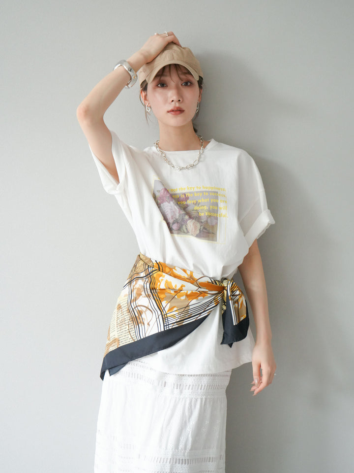 繊細なフラワーアートにメッセージロゴを重ねた、大人の遊び心を感じる一枚。程よくルーズなビッグシルエットで、リラックス感もありつつ今っぽさも抜群。モードにもカジュアルにも合わせやすく、デニムやスラックスとの相性も◎。一枚でトレンド感を演出できる注目のTシャツです。 ※ボトムス、キャミソール(インナー)以外の商品は一律でインナーは付属していません