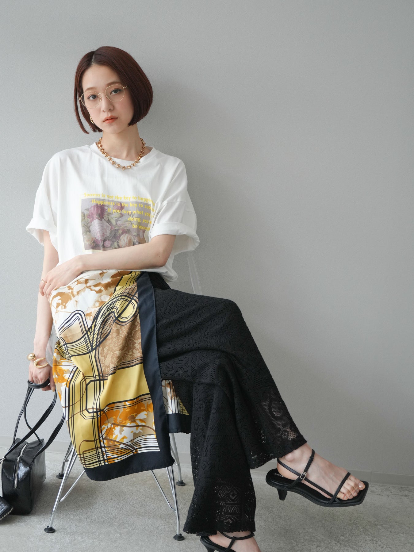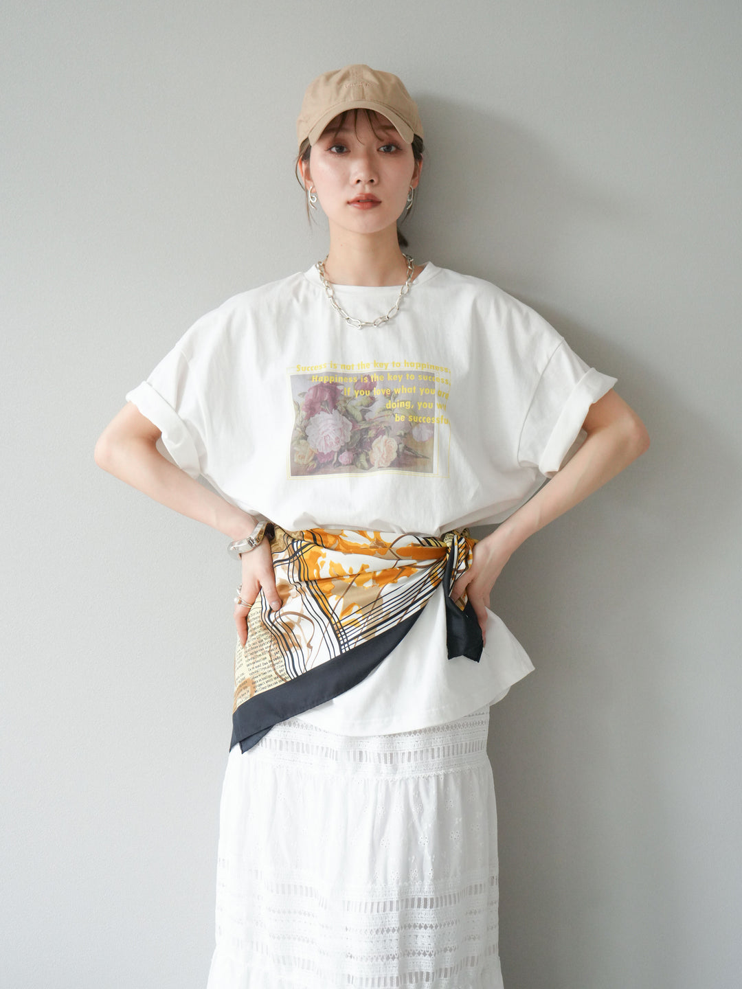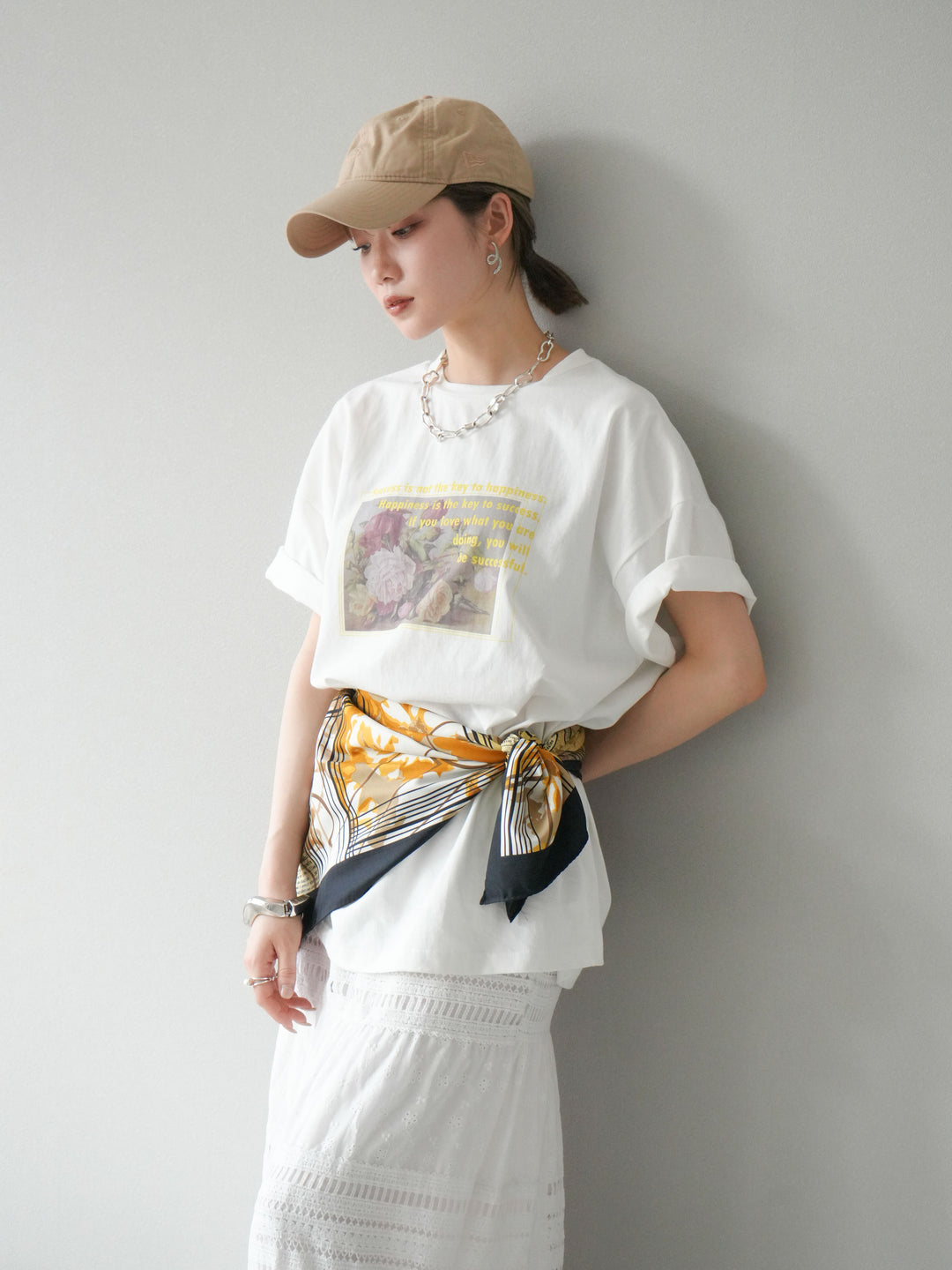 繊細なフラワーアートにメッセージロゴを重ねた、大人の遊び心を感じる一枚。程よくルーズなビッグシルエットで、リラックス感もありつつ今っぽさも抜群。モードにもカジュアルにも合わせやすく、デニムやスラックスとの相性も◎。一枚でトレンド感を演出できる注目のTシャツです。 ※ボトムス、キャミソール(インナー)以外の商品は一律でインナーは付属していません