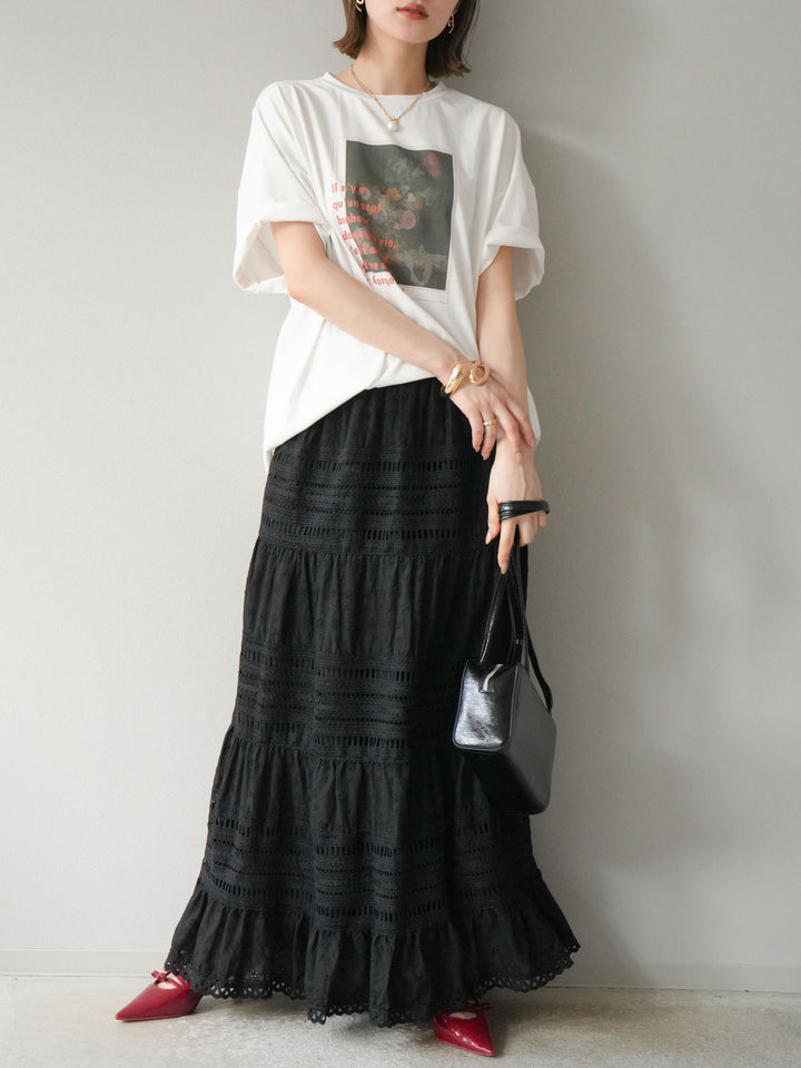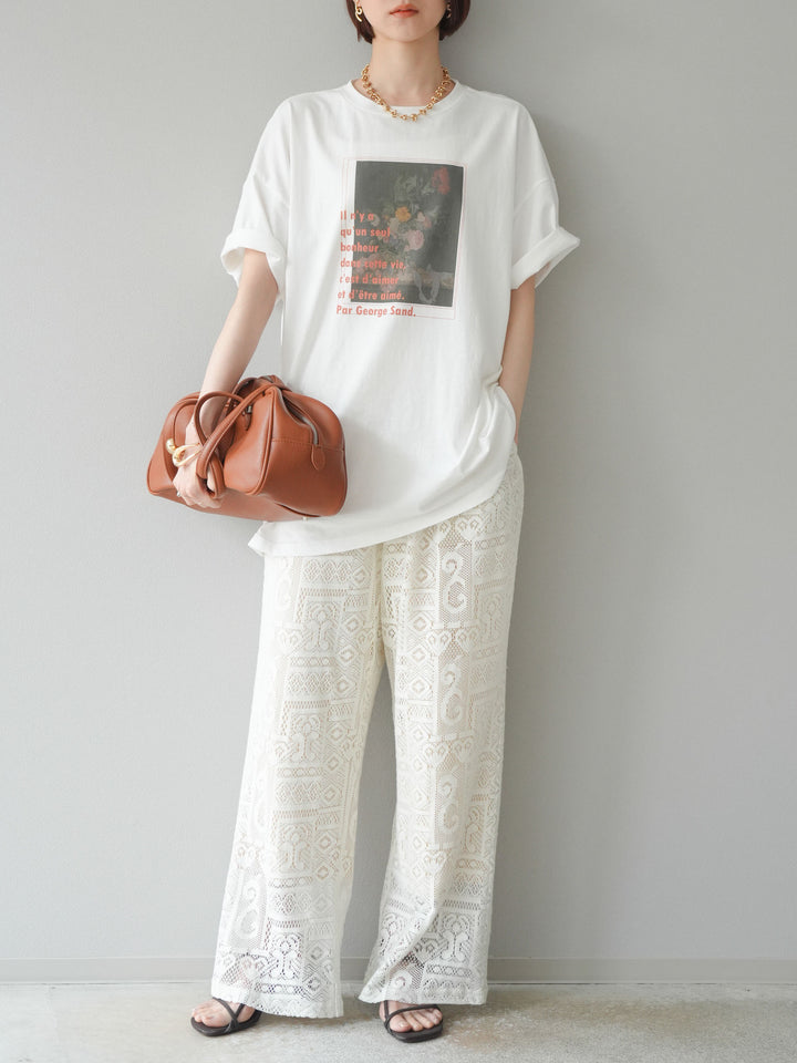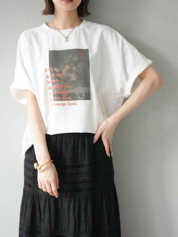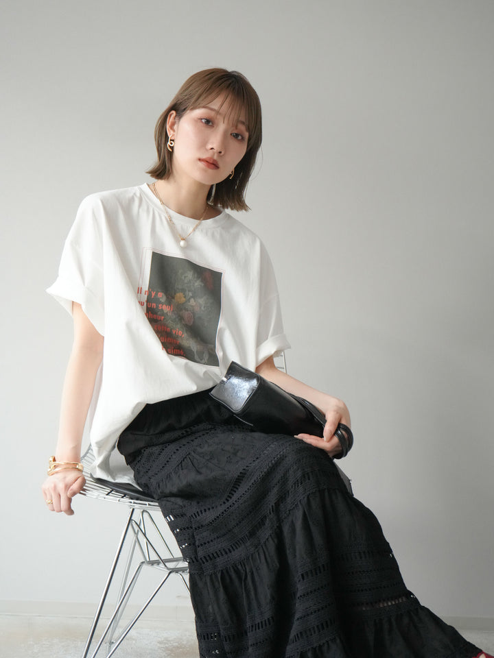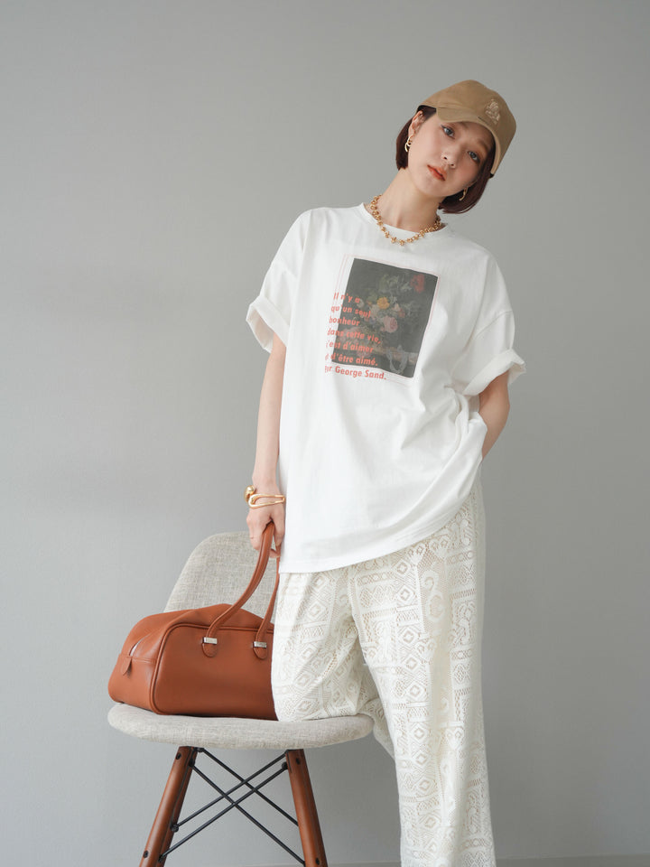繊細なフラワーアートにメッセージロゴを重ねた、大人の遊び心を感じる一枚。程よくルーズなビッグシルエットで、リラックス感もありつつ今っぽさも抜群。モードにもカジュアルにも合わせやすく、デニムやスラックスとの相性も◎。一枚でトレンド感を演出できる注目のTシャツです。 ※ボトムス、キャミソール(インナー)以外の商品は一律でインナーは付属していません