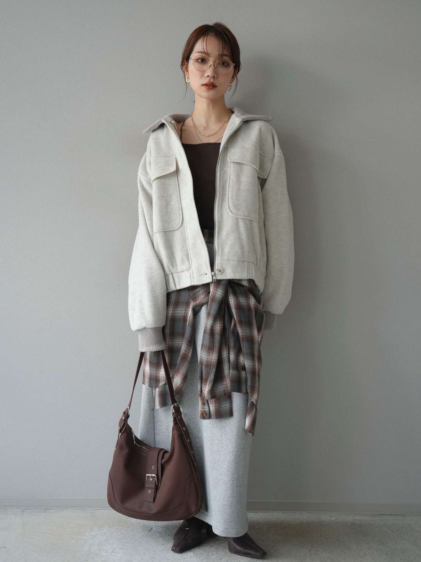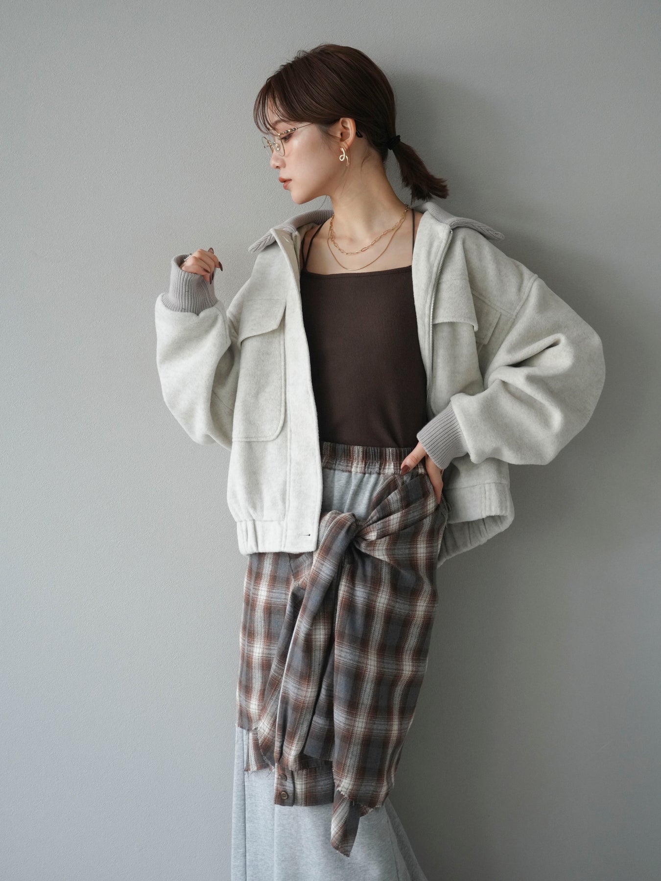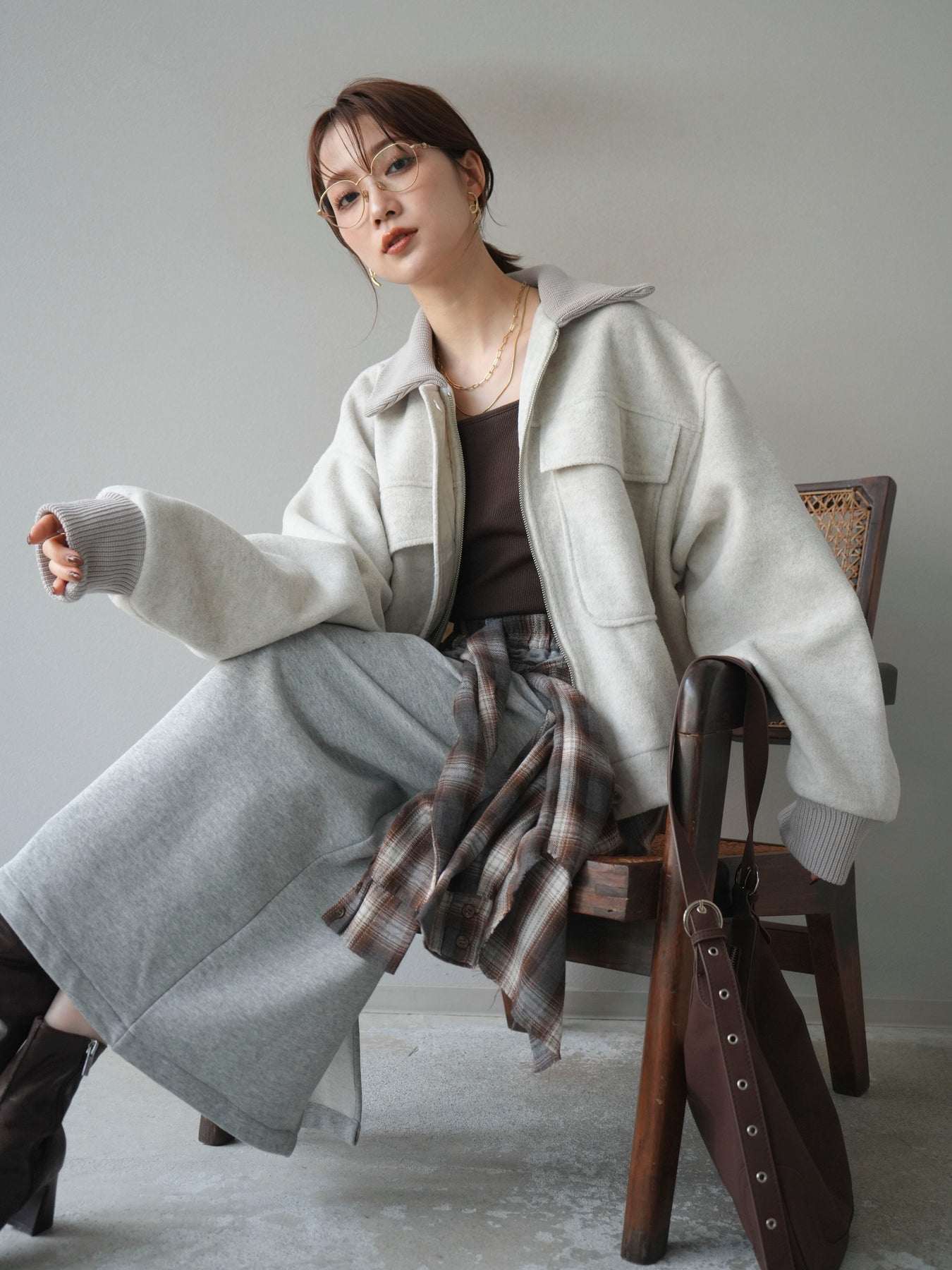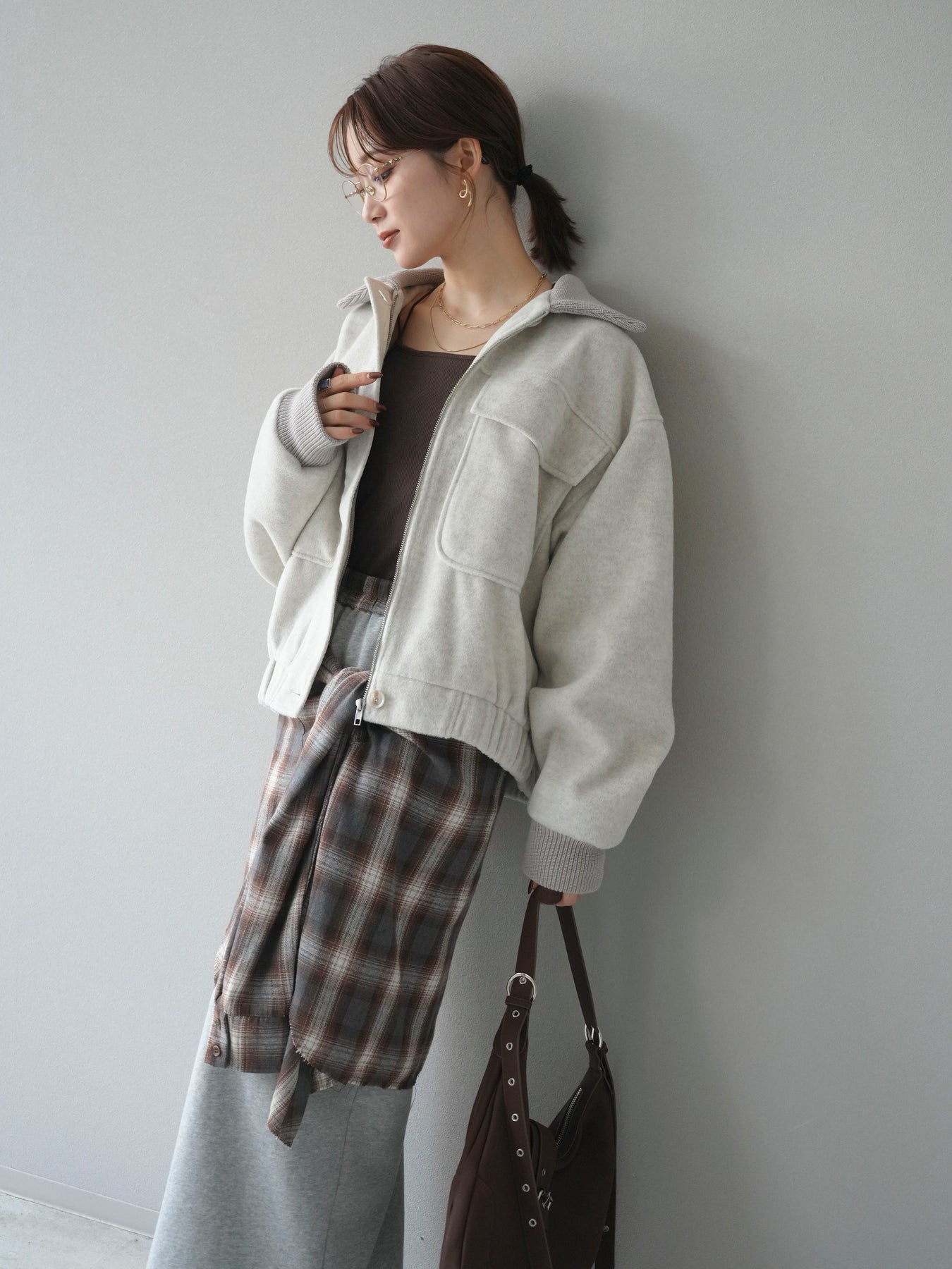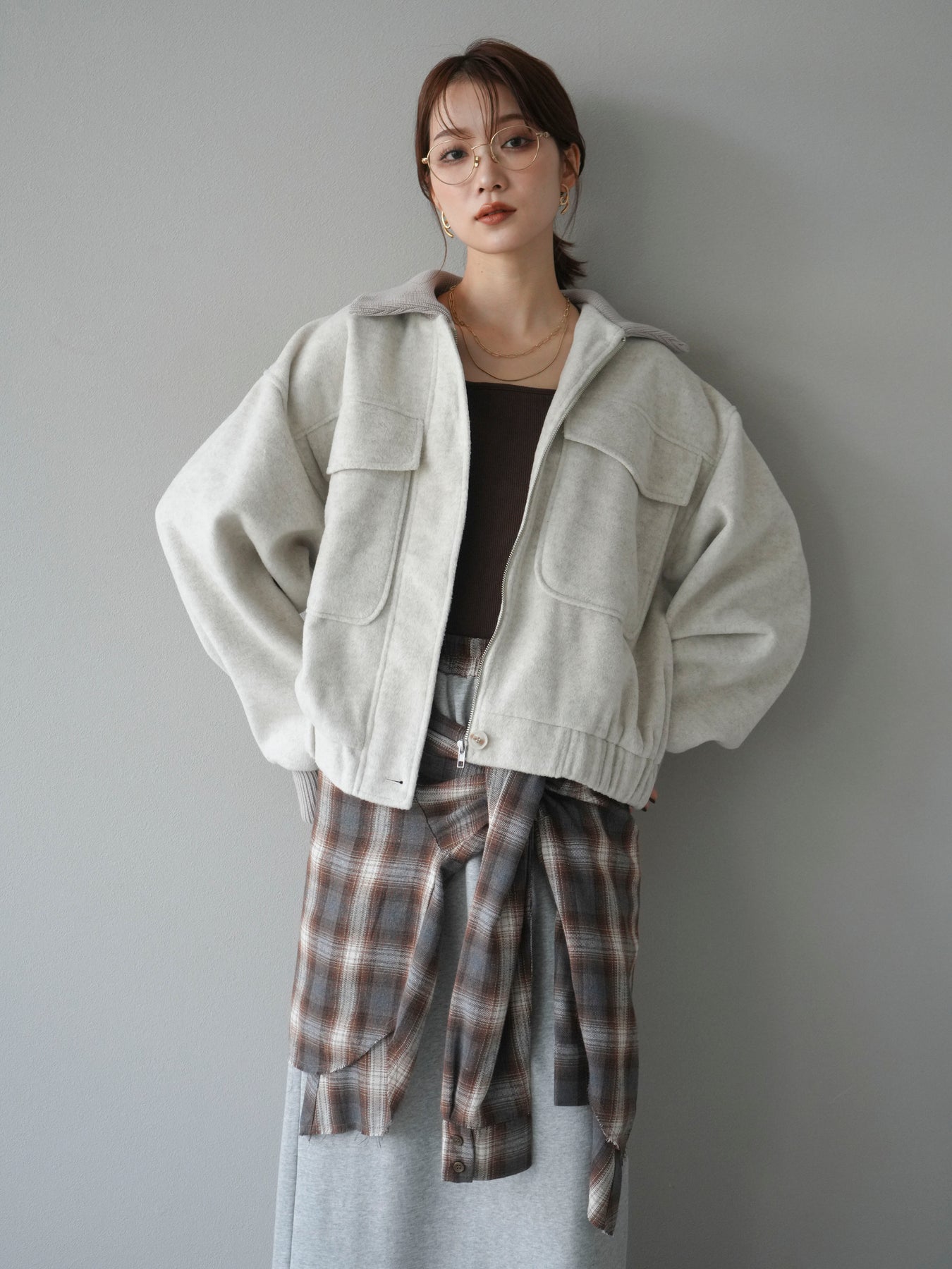 ふっくらとした表面感のウールライクな生地を使用した、軽やかなショート丈コート。ゆったりとした肩まわりとボリュームのある袖がラフな印象を演出しつつ、ステンカラーとリブ付きの襟元で全体を引き締めたバランス感が魅力。ヒップにかかる絶妙な丈感でパンツにもスカートにも合わせやすく、日常の羽織りとして長く活躍します。