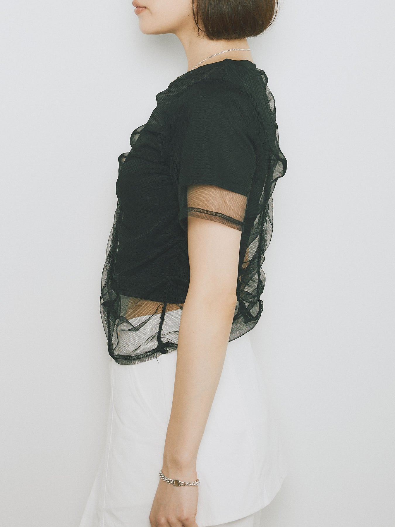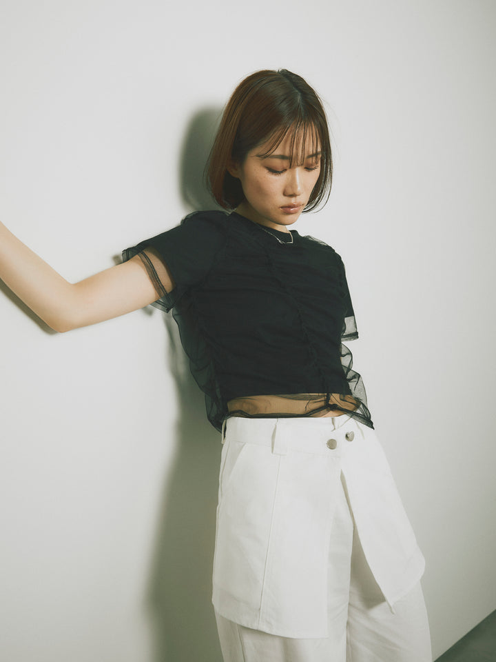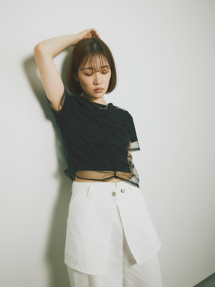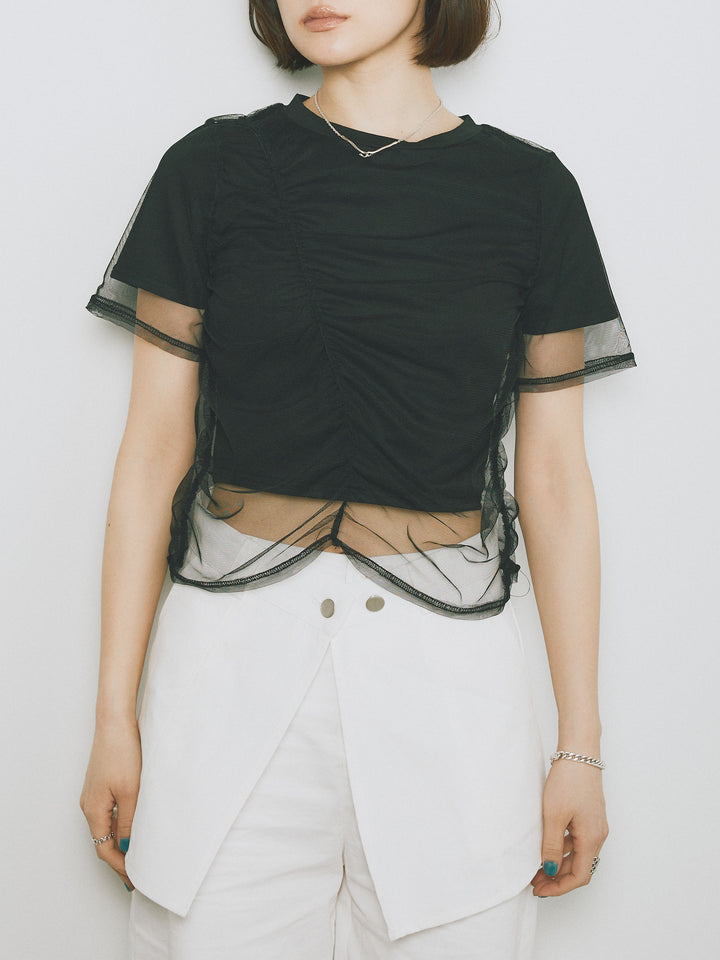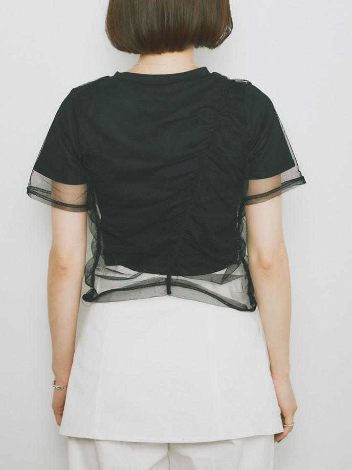 [予約]シャーリングチュールレイヤードTシャツ/ブラック