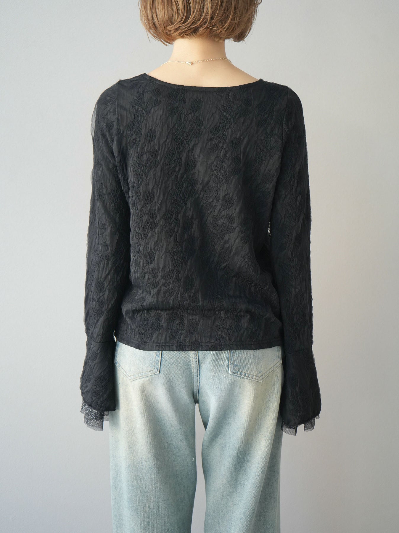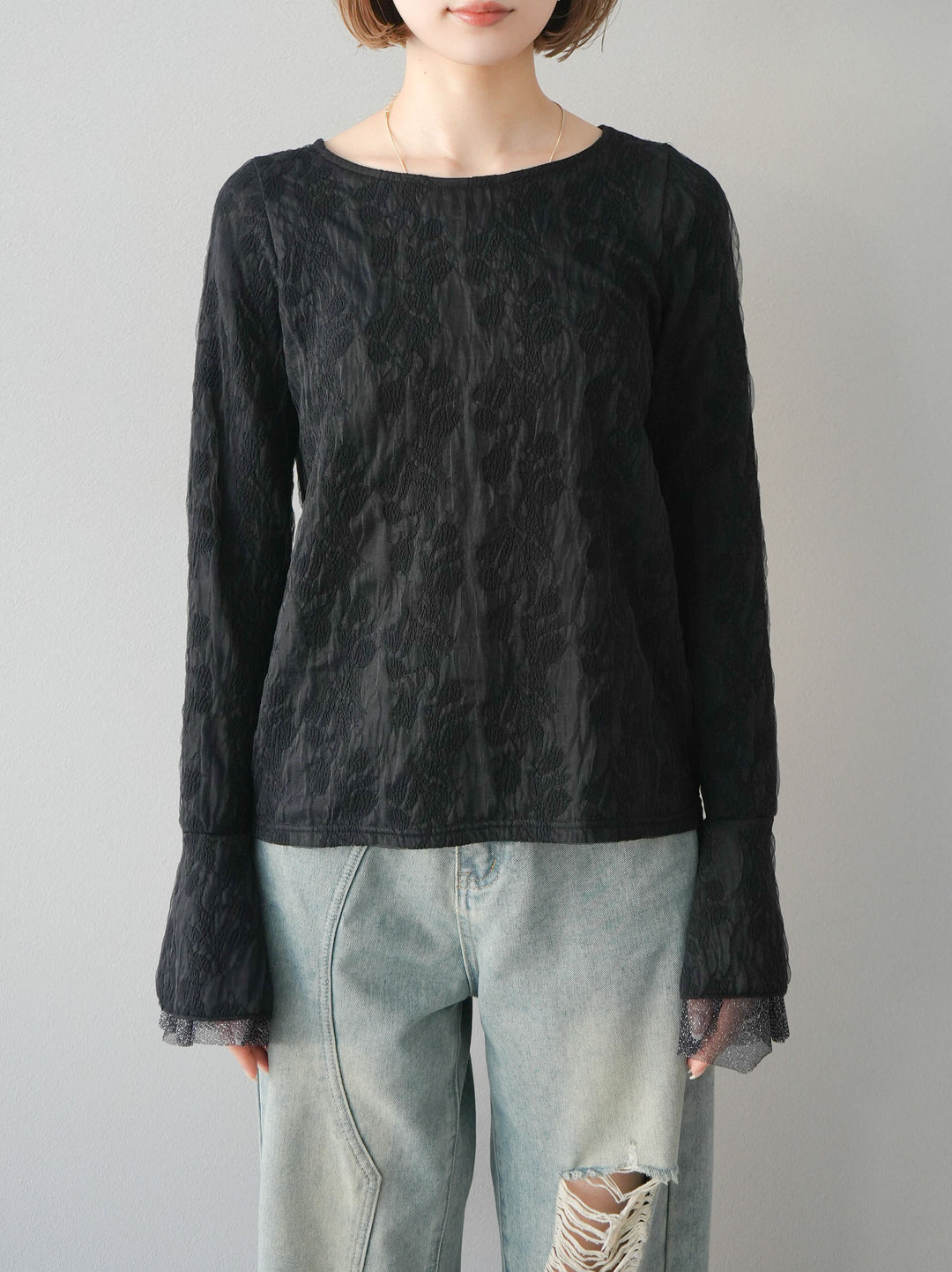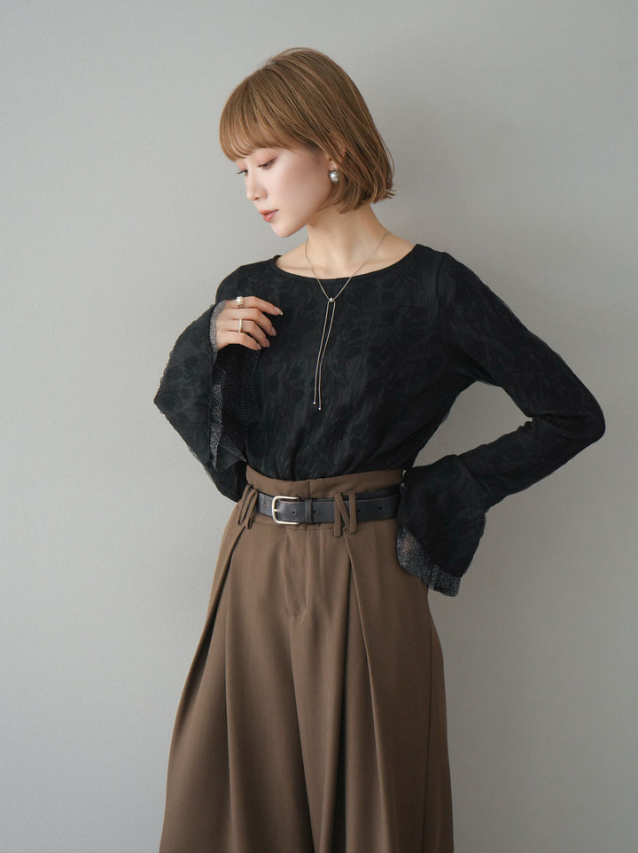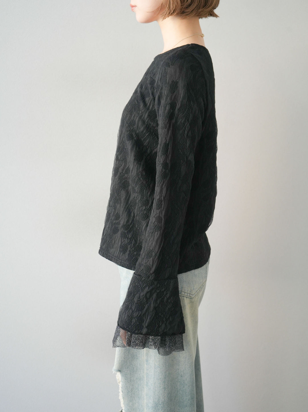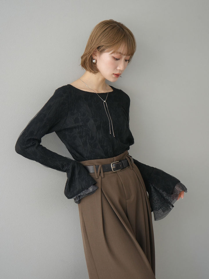 [予約]ダブルガーゼ袖フレアレイヤードジャガードトップス/ブラック