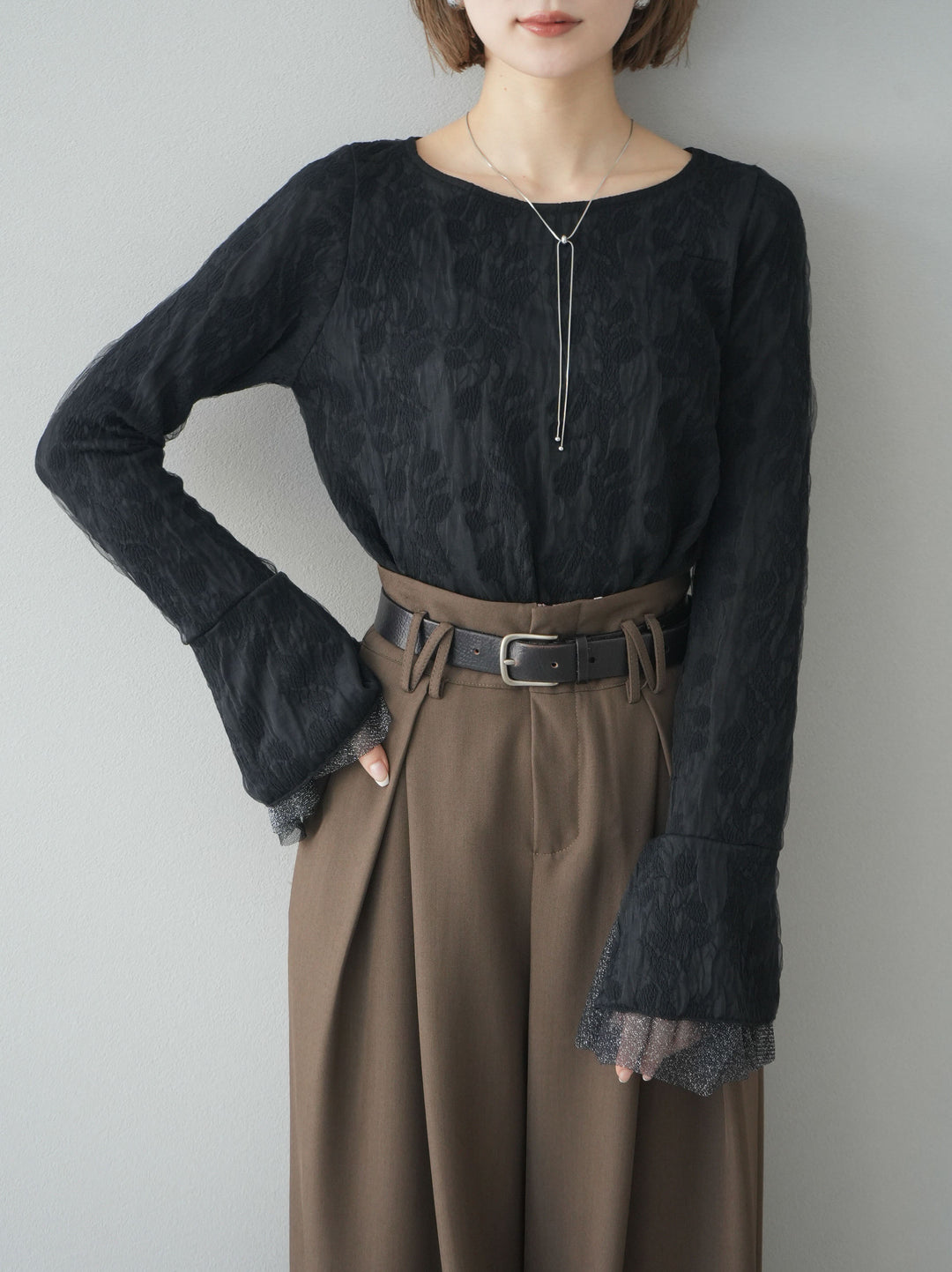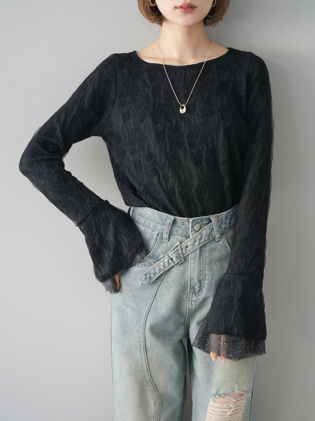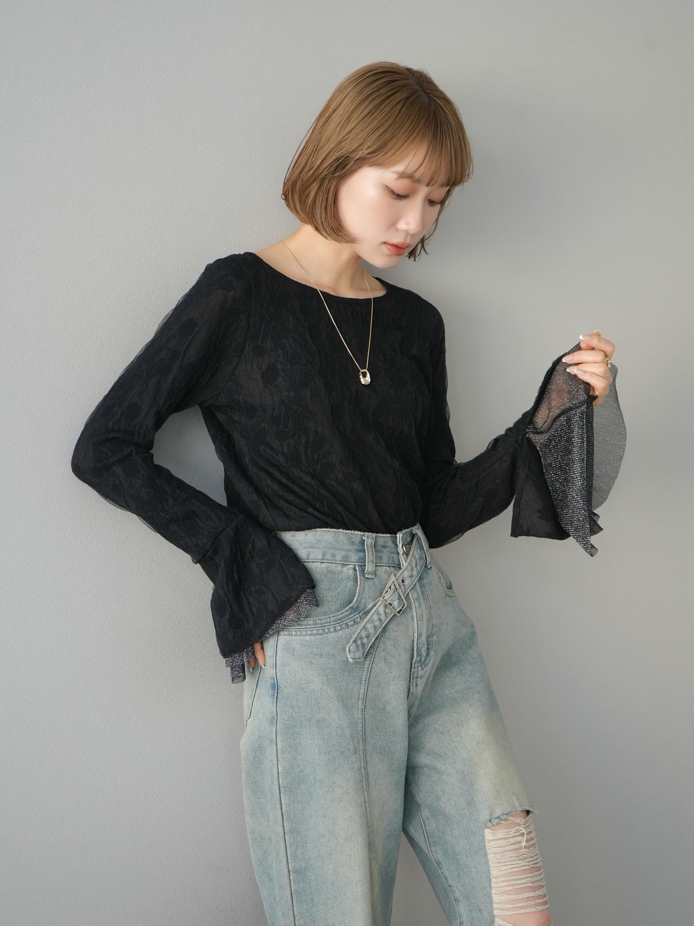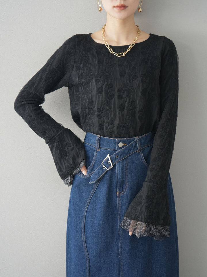 [予約]ダブルガーゼ袖フレアレイヤードジャガードトップス/ブラック