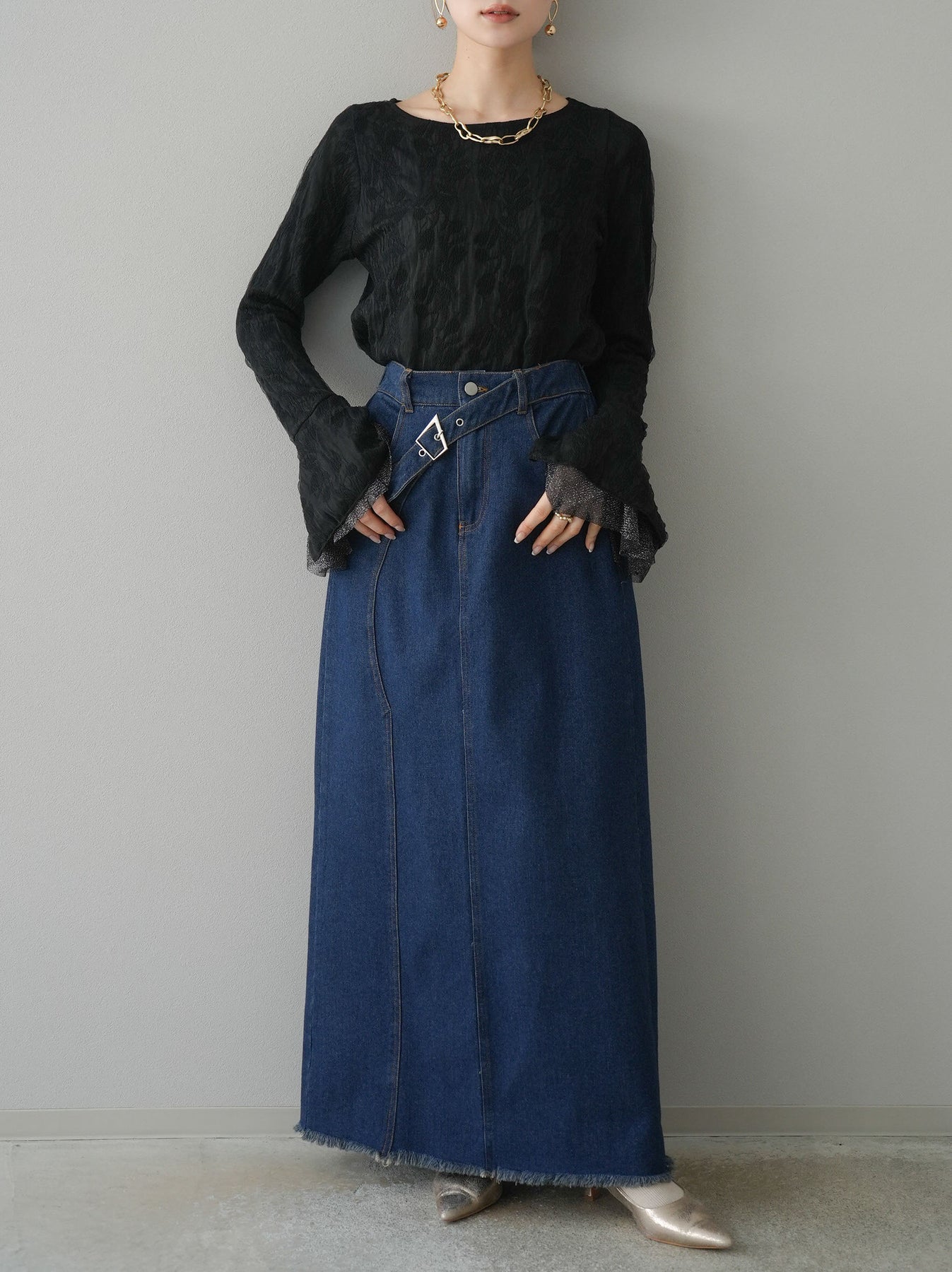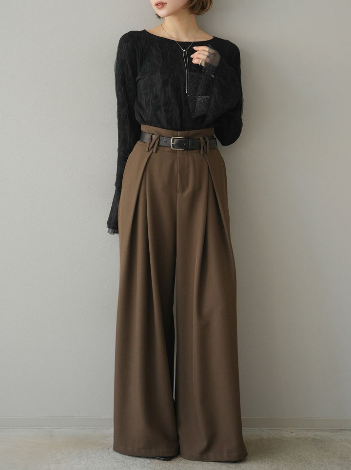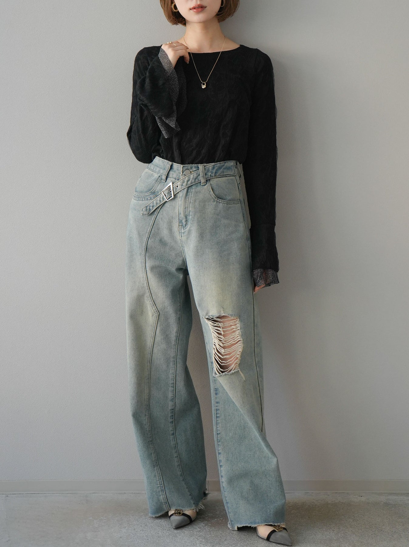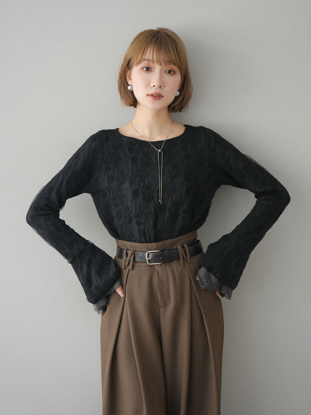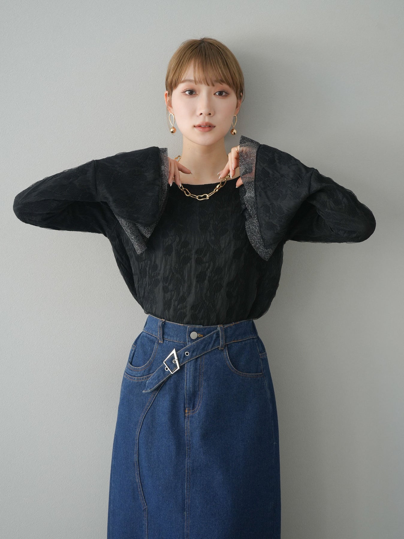 [予約]ダブルガーゼ袖フレアレイヤードジャガードトップス/ブラック