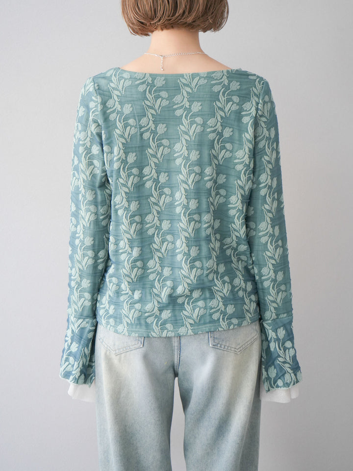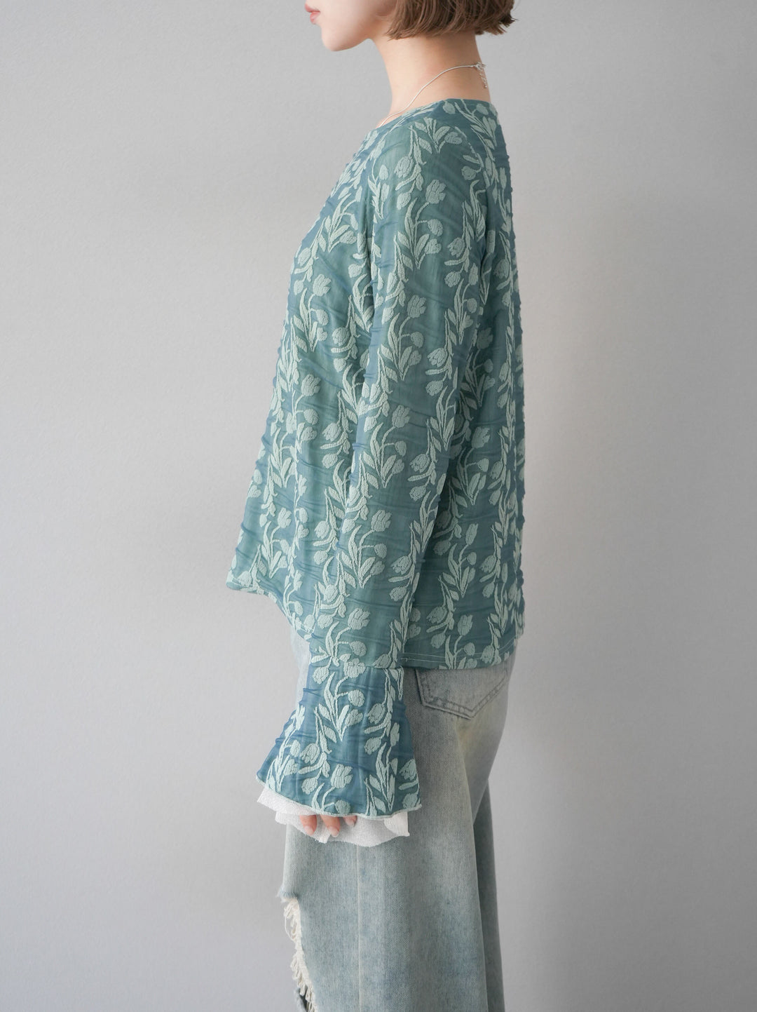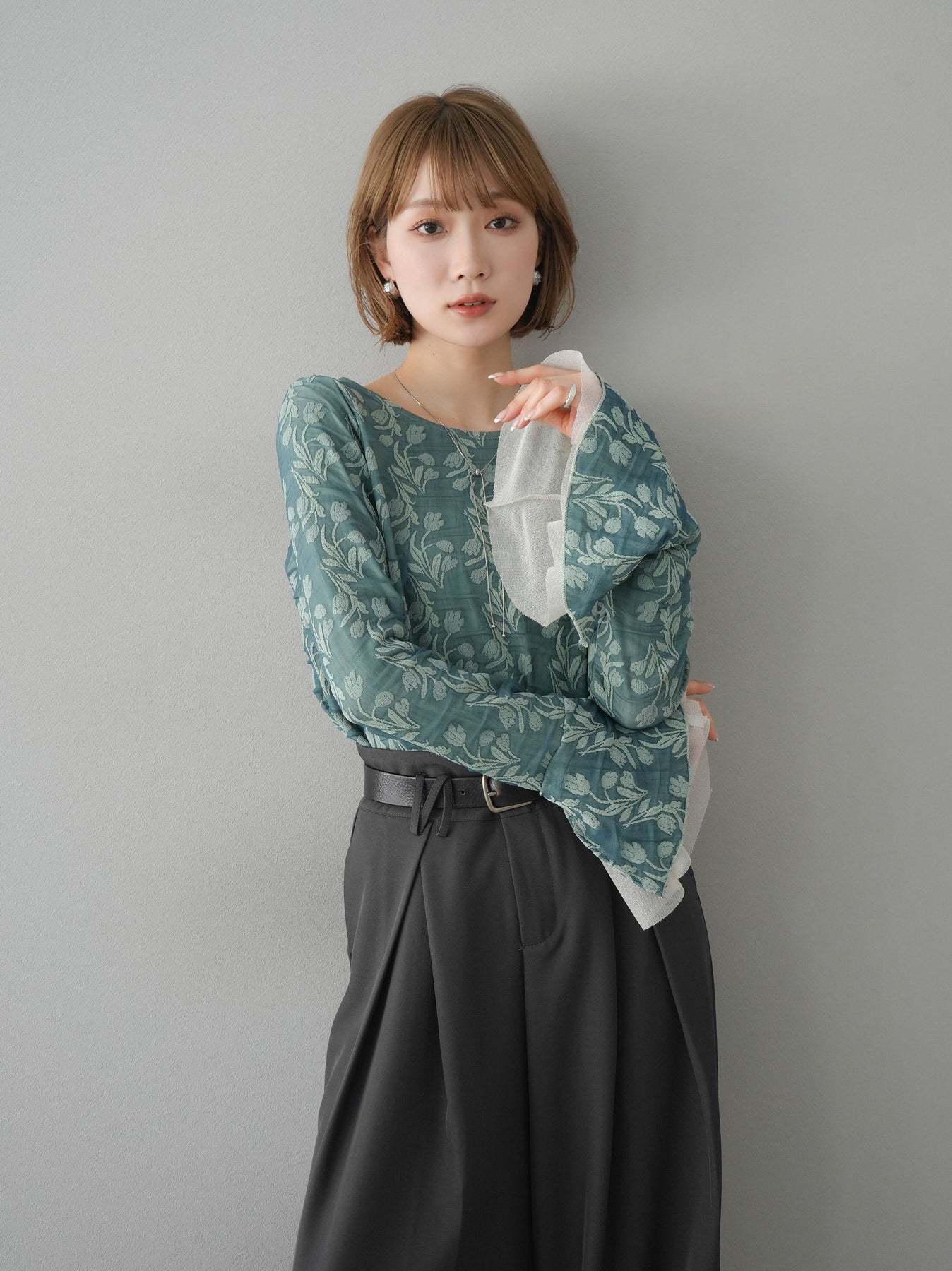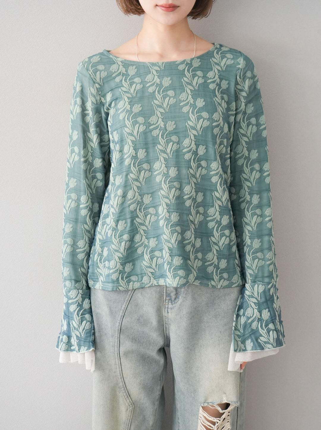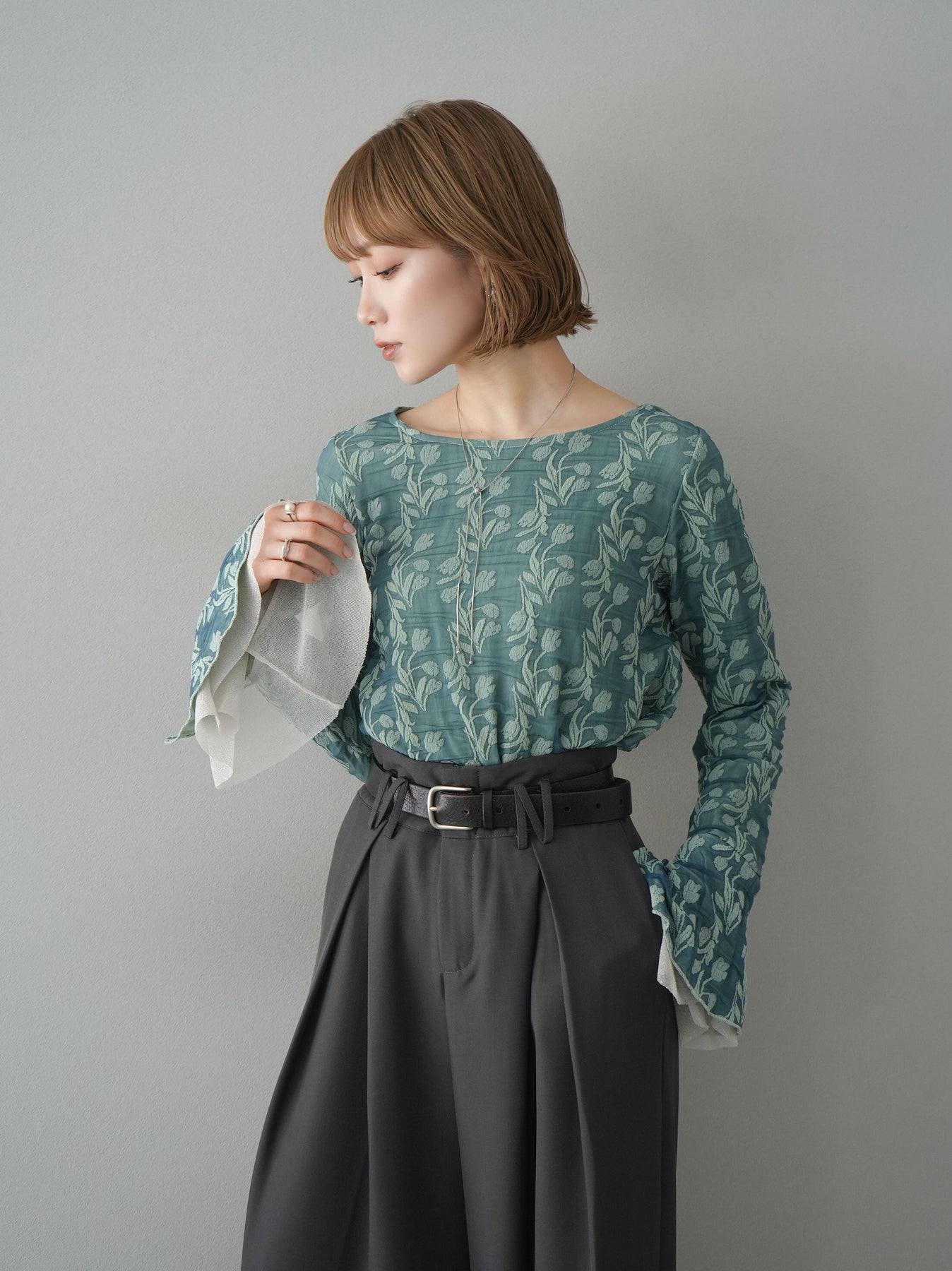 [予約]ダブルガーゼ袖フレアレイヤードジャガードトップス/グリーン