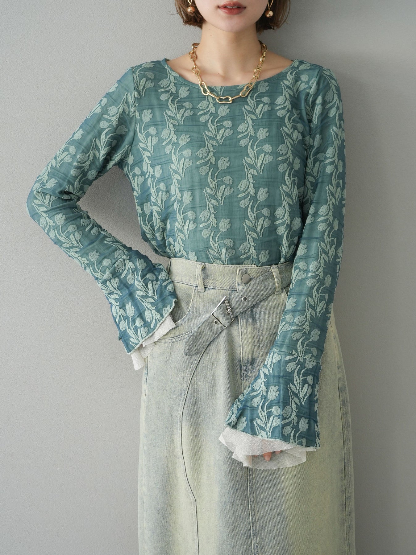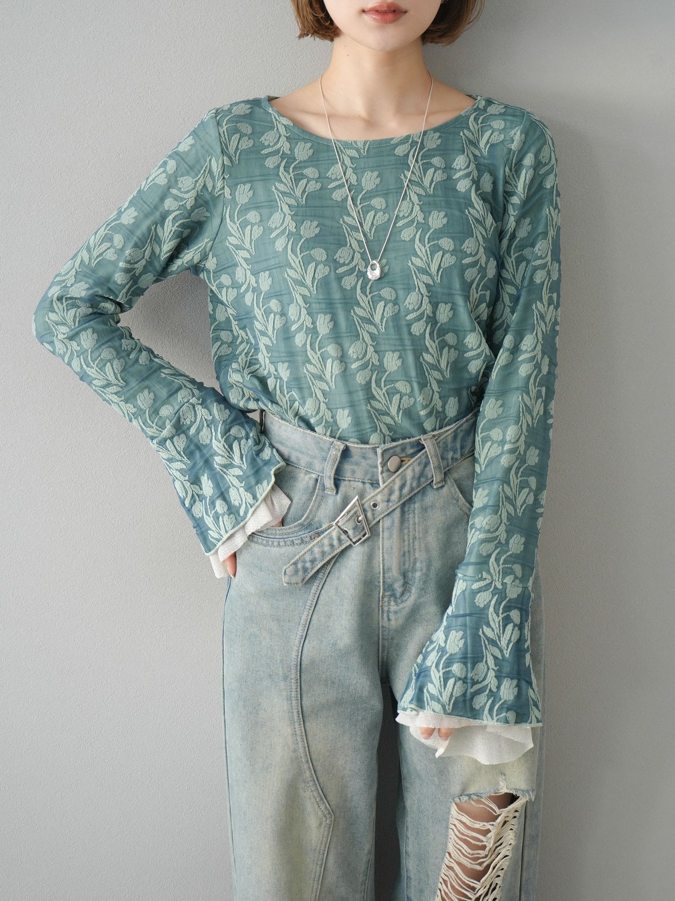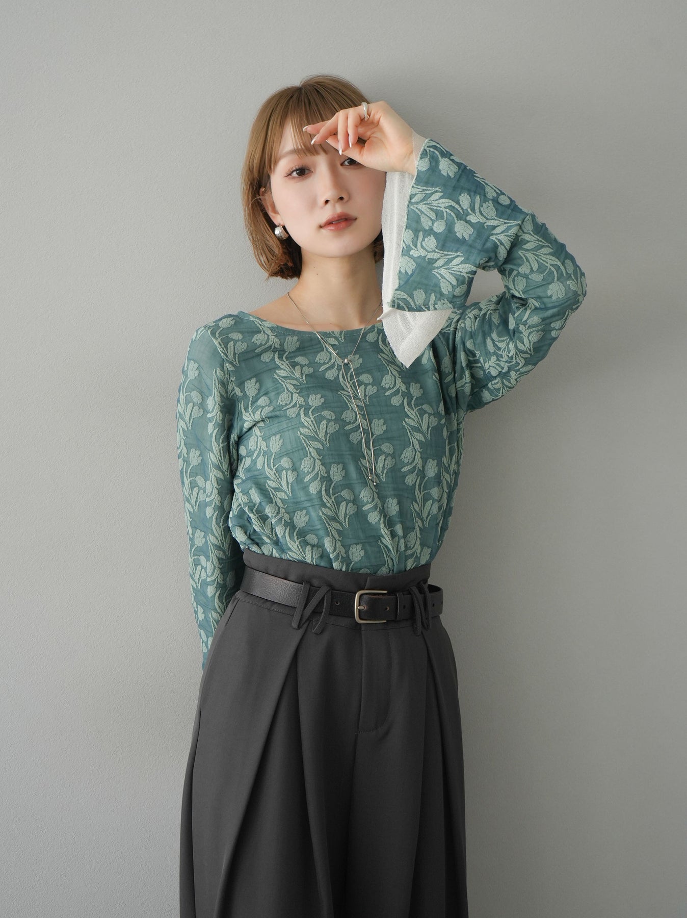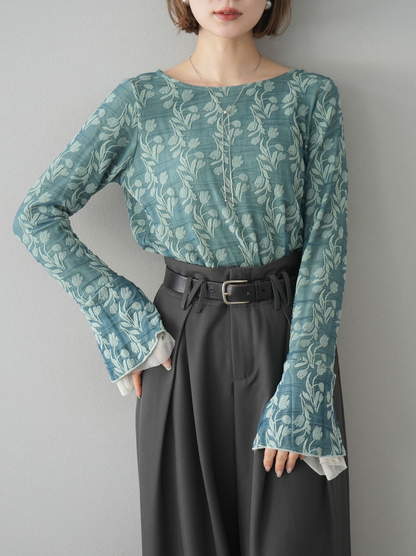 [予約]ダブルガーゼ袖フレアレイヤードジャガードトップス/グリーン