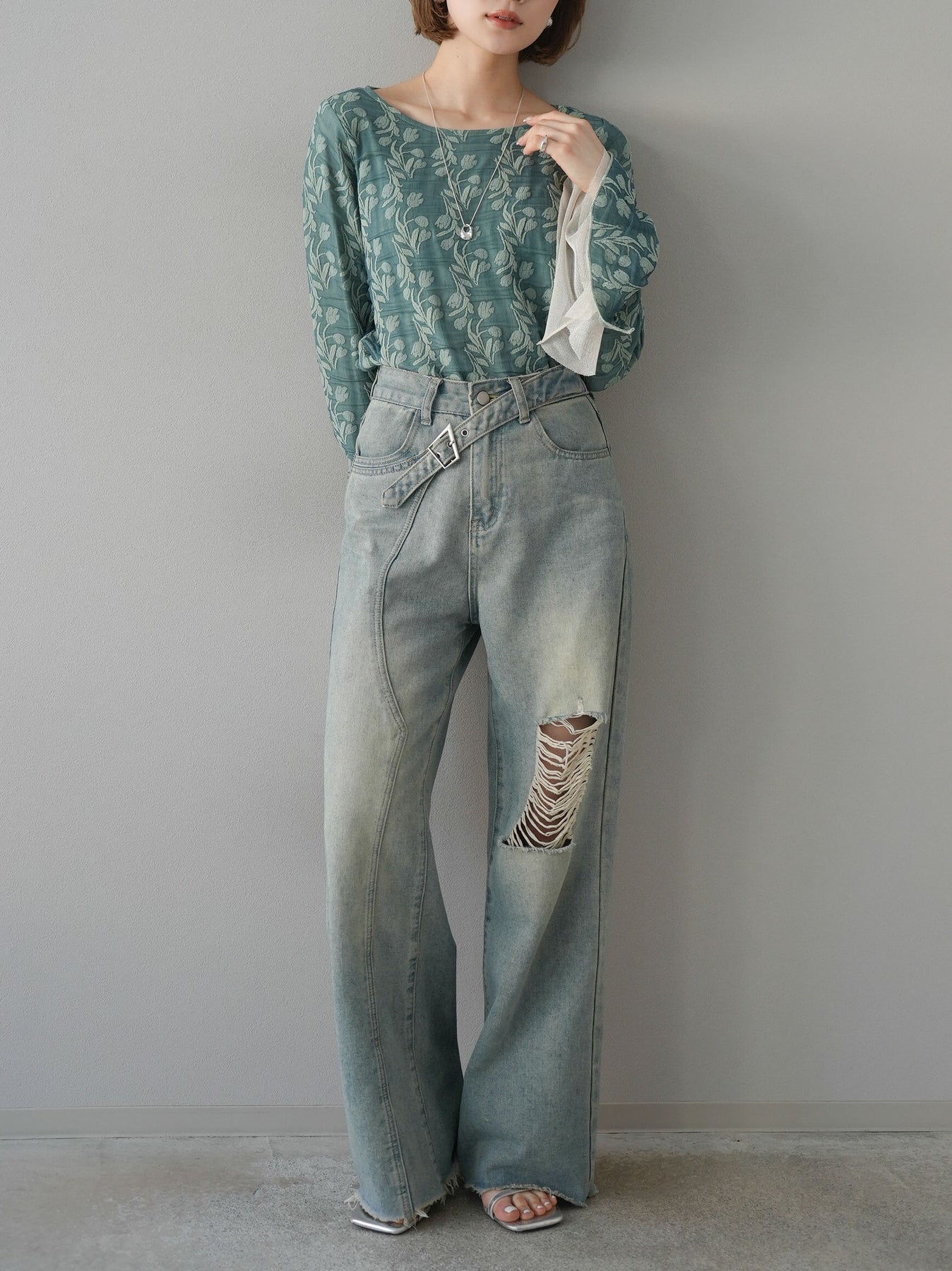 トレンド感あふれるジャガードトップス。ふんわりとしたダブルガーゼ素材が優しい肌触りを実現し、繊細なフレアスリーブが動きのあるスタイルを演出します。シアーなレイヤードデザインが華やかさをプラスし、デニムやスカートと合わせるだけで旬な着こなしに。デイリーから特別なシーンまで幅広く活躍する一枚です。 ※ボトムス、キャミソール(インナー)以外の商品は一律でインナーは付属していません